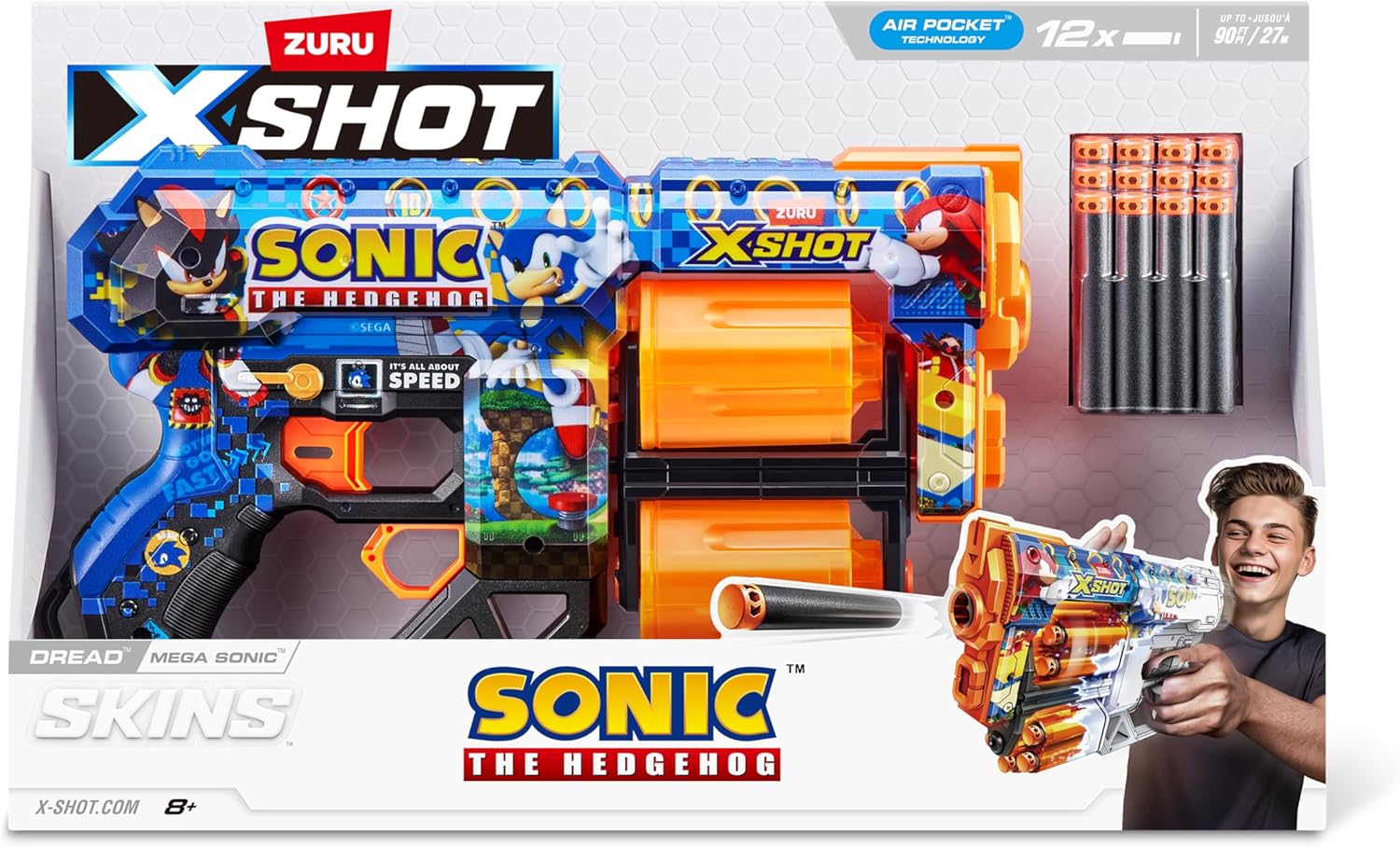 Scegli la tua skin: unisciti alla battaglia con l'icona della cultura pop Sonic the Hedgehog, Tails e Knuckles con la skin X-Shot Sonic. Potenza di fuoco: X-Shot Skins Dread è il doppio del divertimento e il doppio dei problemi! Colpisci più bersagli fino a 27 m / 90 piedi di distanza. Capacità delle freccette: X-Shot Skins Dread ha una capacità di 12 freccette a doppia rotazione. Quando finisci le freccette in un barile, passa semplicemente al secondo per spazzare via la concorrenza! Tecnologia Air Pocket: le skin X-Shot includono freccette con tecnologia Air Pocket per un'esplosione ulteriore, più veloce e più precisa! LA CONFEZIONE INCLUDE: 1x skin X-Shot Dread Sonic Blaster, 12 dadi in schiuma con tecnologia Air Pocket