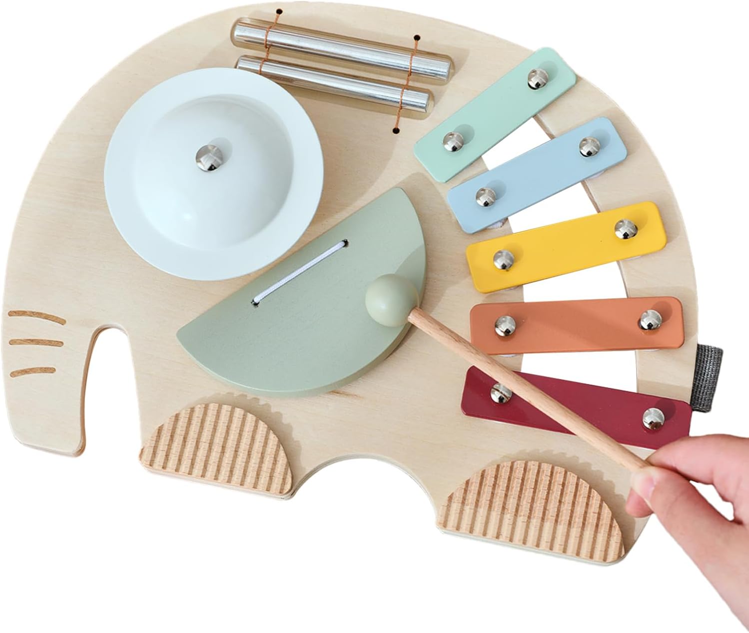 Cura senza sforzo per i genitori: l'esterno facile da pulire del baby xilofono aiuta a mantenerne l'aspetto nel tempo, riducendo le esigenze di manutenzione e incoraggiando il gioco creativo ininterrotto, sia all'interno che durante le riunioni di famiglia all'aperto. Realizzato in legno naturale, questo giocattolo permette ai genitori di trascorrere momenti di qualità con i propri figli senza doversi preoccupare della manutenzione del materiale. Strumento per lo sviluppo musicale precoce: questo xilofono funziona come uno strumento educativo precoce che promuove lo sviluppo musicale dei giovani incoraggiando l'esplorazione ritmica, supportando la percezione uditiva e incoraggiando esperienze di gioco interattive con la famiglia o i coetanei. Stimola il risveglio musicale attraverso una pratica divertente e coinvolgente, ideale per i primi passi nella musica. Esperienza di apprendimento emozionante: questo xilofono per adolescenti combina colori vivaci con barre di tono per promuovere lo sviluppo visivo e uditivo e aiutarli a migliorare la capacità di riconoscere i colori e distinguere i suoni in un ambiente musicale divertente. Ideale da utilizzare a casa o all'asilo, offre un'esperienza di apprendimento interattivo che stimola il risveglio dei sensi e la naturale curiosità. Gioco interattivo di percussioni: progettato per percussioni interattive, questo xilofono li incoraggia a sviluppare abilità di sviluppo attraverso il tocco ritmico, che rafforza le capacità motorie e migliora la coordinazione occhio-mano. In ambienti musicali giocosi, fornisce un'esperienza coinvolgente che stimola l'esplorazione ritmica e le capacità motorie di attività divertenti. Giocattolo musicale multifunzionale: combinando xilofono, tamburo e campana, questo xilofono consente un gioco musicale interattivo con molteplici esperienze sonore. Ideale per rafforzare l'apprendimento sensoriale e le divertenti interazioni di gruppo durante le feste o gli asili nido, offre intrattenimento educativo giovanile.