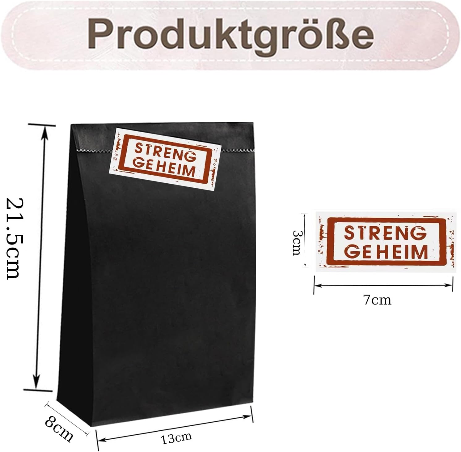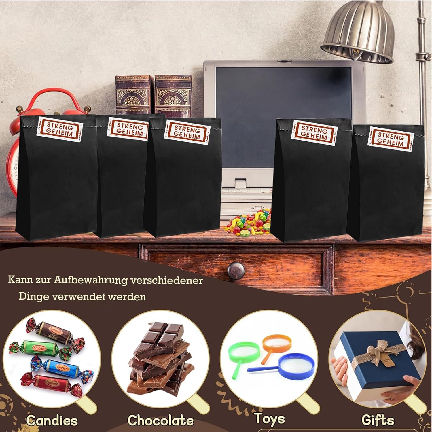 🕵🏻 Riceverai 16 sacchetti di carta neri, 16 adesivi "Top Secret". I sacchetti di carta misurano 13 x 7,5 x 21,5 cm e l'adesivo misura 7 x 3 cm. 🔎 La borsa regalo perfetta per riporre giocattoli, snack, regali e altro ancora. Il design con apertura a dente di sega previene i graffi ed è sicuro da usare. 🕵🏻 I nostri sacchetti regalo per la festa di compleanno dei bambini sono realizzati in carta kraft, hanno un aspetto raffinato e un fondo piatto. La carta dei sacchetti regalo è robusta e non facile da rompere, ecologica, inodore e può essere riutilizzata più volte. 🔎 Adatto per compleanni, feste di compleanno per bambini detective, feste a tema, carnevale, Halloween, Natale, Pasqua, baby shower, matrimoni, inaugurazioni di case, borse per feste di compleanno detective, feste di laurea e altre celebrazioni. 🕵🏻 Emozionanti sacchetti regalo per una festa di compleanno! Andiamo alla ricerca di indizi e scopriamo tanti segreti entusiasmanti! Inviti misteriosi al detective. Crea un'atmosfera felice e misteriosa!