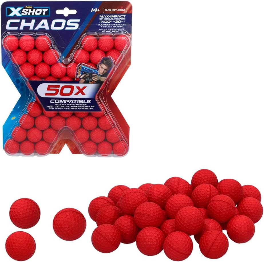 X-Shot - Set di munizioni ufficiali per pistole Chaos, con 50 palline in gommapiuma Le palline misurano 2,3 cm di diametro e sono compatibili con lanciatori di altre marche Realizzate in materiale morbido e leggero che raggiungono fino a 30 m di distanza nel colpo Grazie alla loro leggerezza, le palline non causano danni ai mobili o ai vetri quando vengono sparate Il suo utilizzo è raccomandato per i 14 anni di età