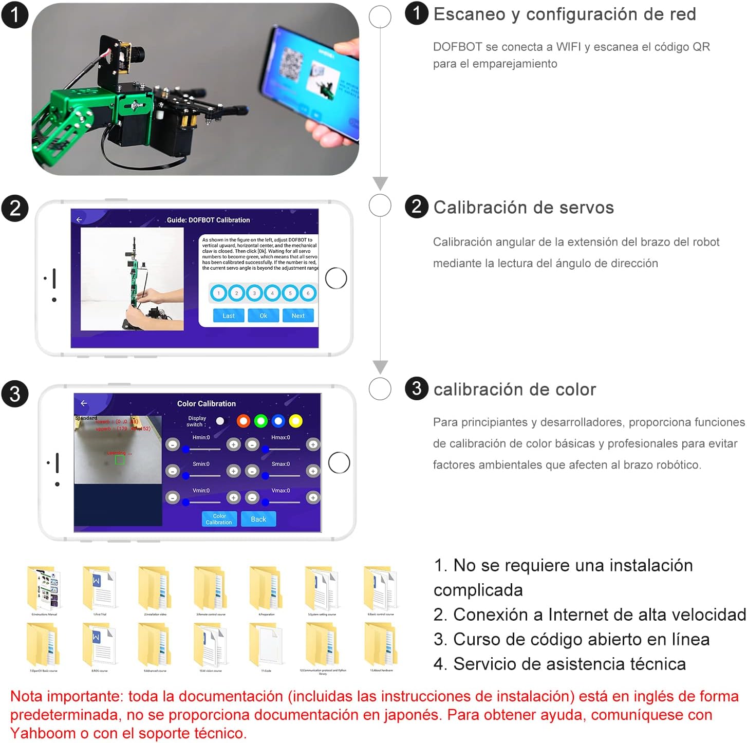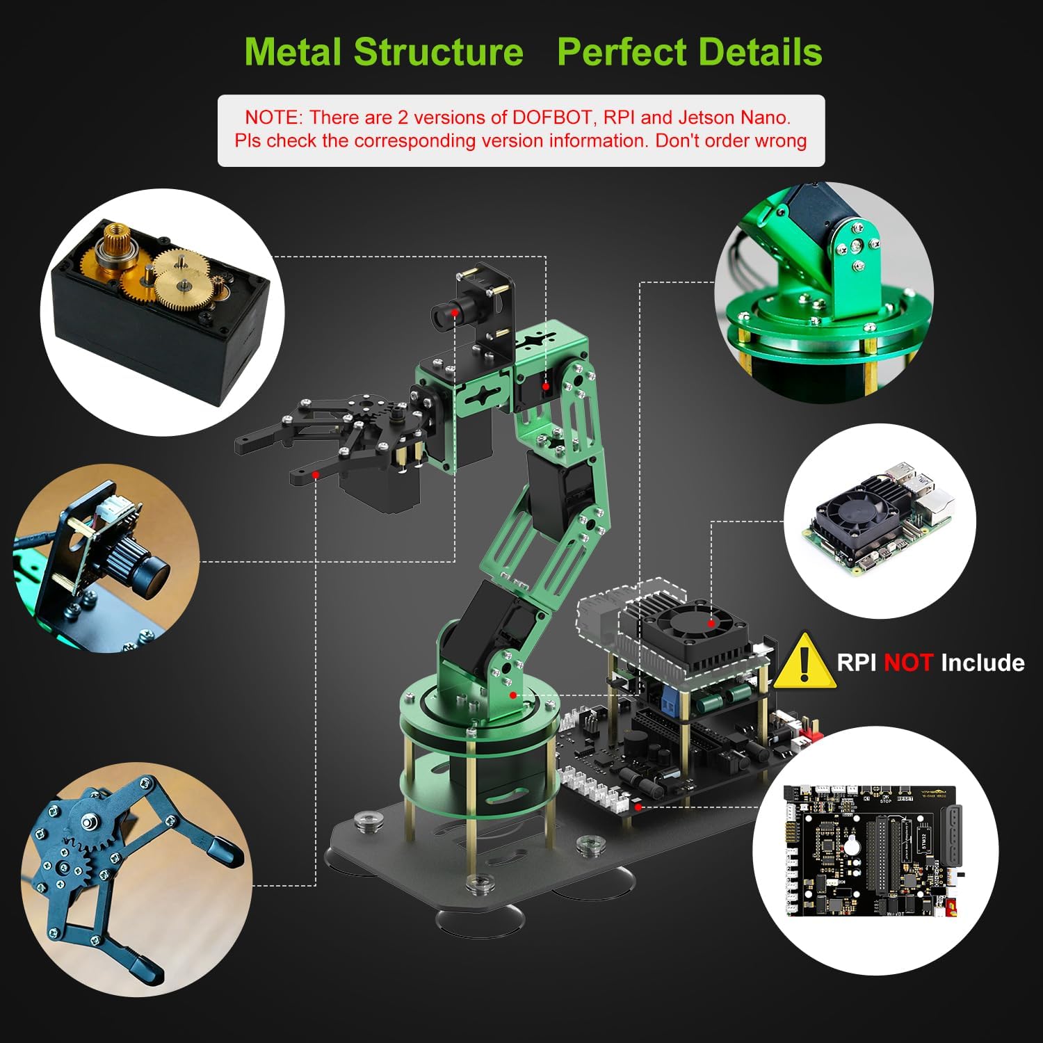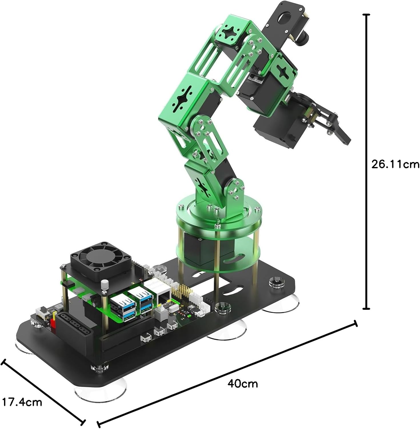 【Note】Dofbot version is compatible with Raspberry Pi5 4GB/8GB, and the used version is Pi 4B. 【Artificial Intelligence Robotic Arm with Camera】Robotic arm comes with camera to achieve FPV video transmission. The robotic arm can recognize colors, specific gestures and faces, respond to the recognized gestures and track the recognized faces, track the corresponding colors, and grab the corresponding designated color objects. These recognition, tracking and grabbing actions fully reflect the AI bionic characteristics of robot arm. DOFBOT starts to take you into the field of AI robotics. 【DOFBOT Motion Control】 Robotic arm not only has its own fixed action group, but also can perform custom actions. In terms of control method, we can use the Master Machine to control the Slave Machine to achieve remote operation of real-time transmission of action gestures. What’s more,the ros system can be used to build obstacle models, so that the robotic arm can avoid opening the obstacles to operate. Flexible arms can complete complex tasks for you 【Freely enjoy 5 control methods】 The programmable robot arm kit can use the multi-function APP (Android/iOS) to operate most of the functions; the kit is equipped with a USB gamepad remote control to achieve the best control feeling; it can also be used PC upper computer view image transmission; 3D simulation model construction of ROS system; Jupyter Lab webpage online programming. 5 kinds of interconnected control methods can enjoy the fun of robotic arm 【Top Configuration】Dofbot uses 15kg smart serial bus metal gear digital servo, which is conducive to separately controlling and reading the angle of each steering gear; equipped with a fully functional expansion board, reserved for continued expansion; the robotic arm is made of fully anodized aluminum alloy with a beautiful and strong structure 【Easy to Get Start & Online Technical Support】The assembled robotic arm can be controlled directly by simply installation and quick connection to the network (Based on the factory burned image). However, this robotic arm is for DIY makers with basic Python programming knowledge. Yahboom provide a large amount of course materials and online technical support is available. If you encounter difficulties, pls contact Yahboom. ***Raspberry Pi-5 (4G or 8G) is recommended