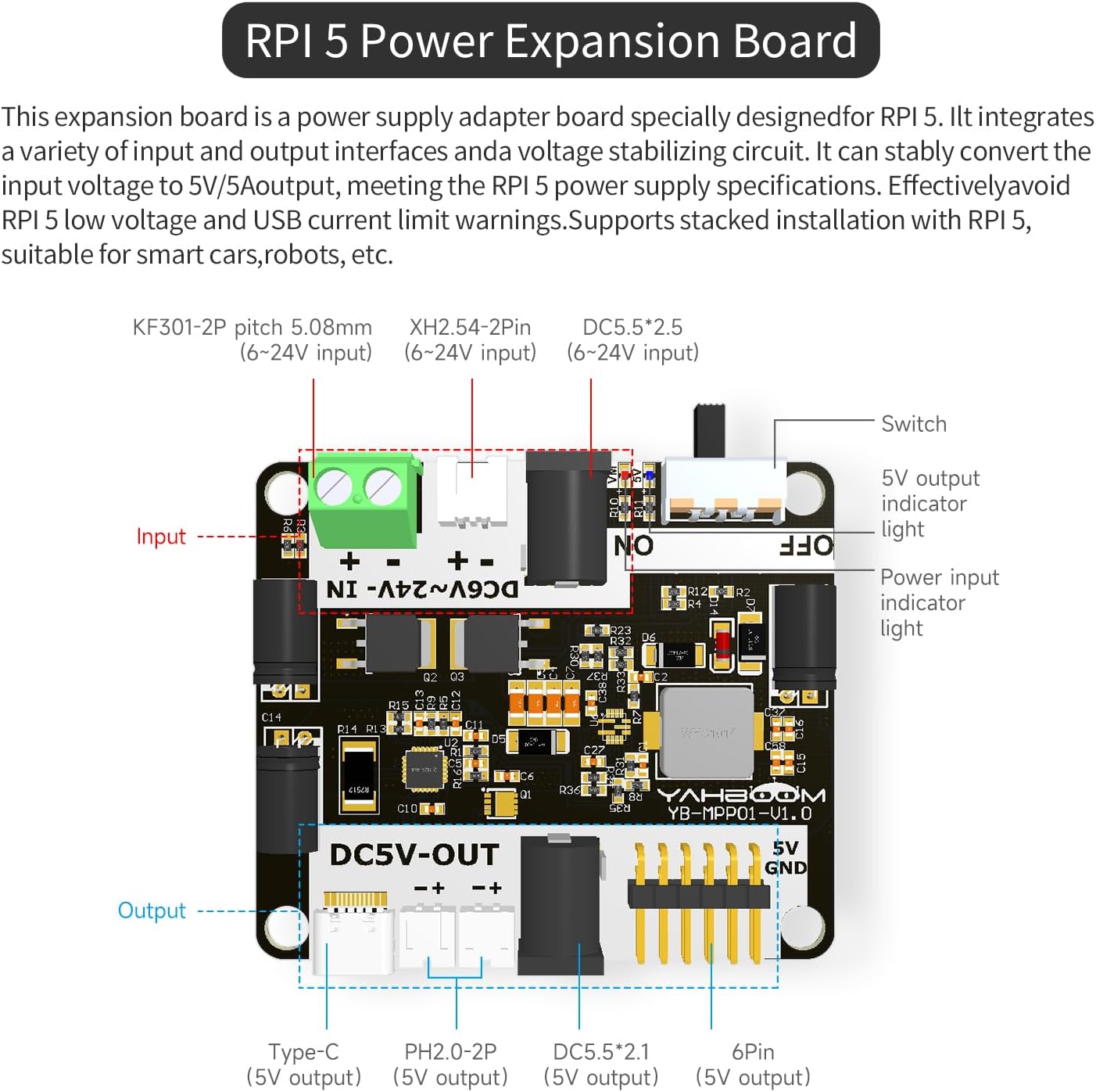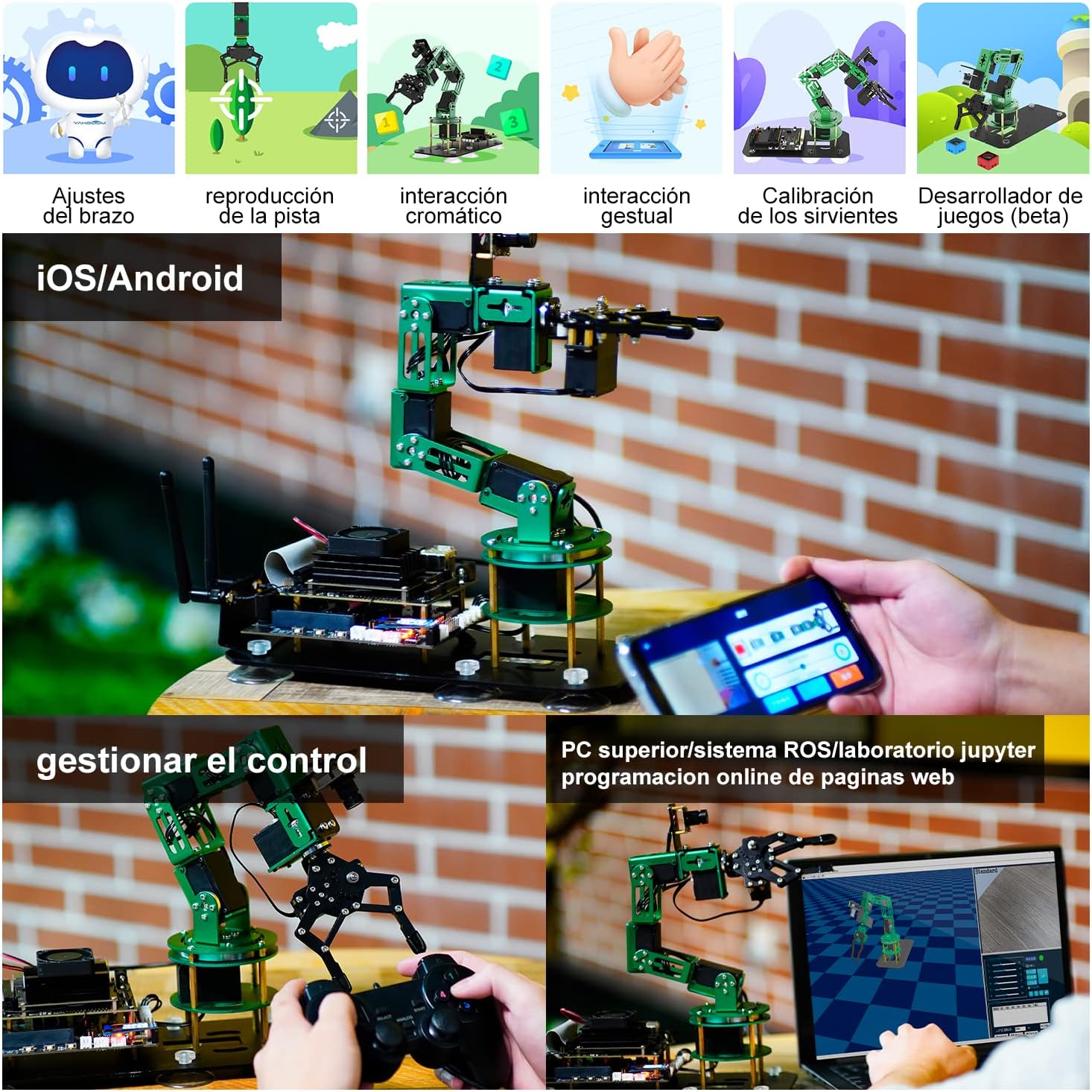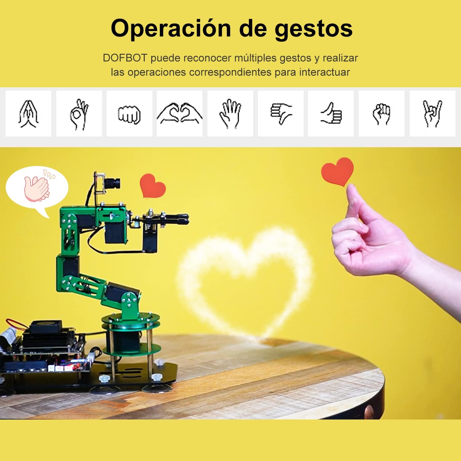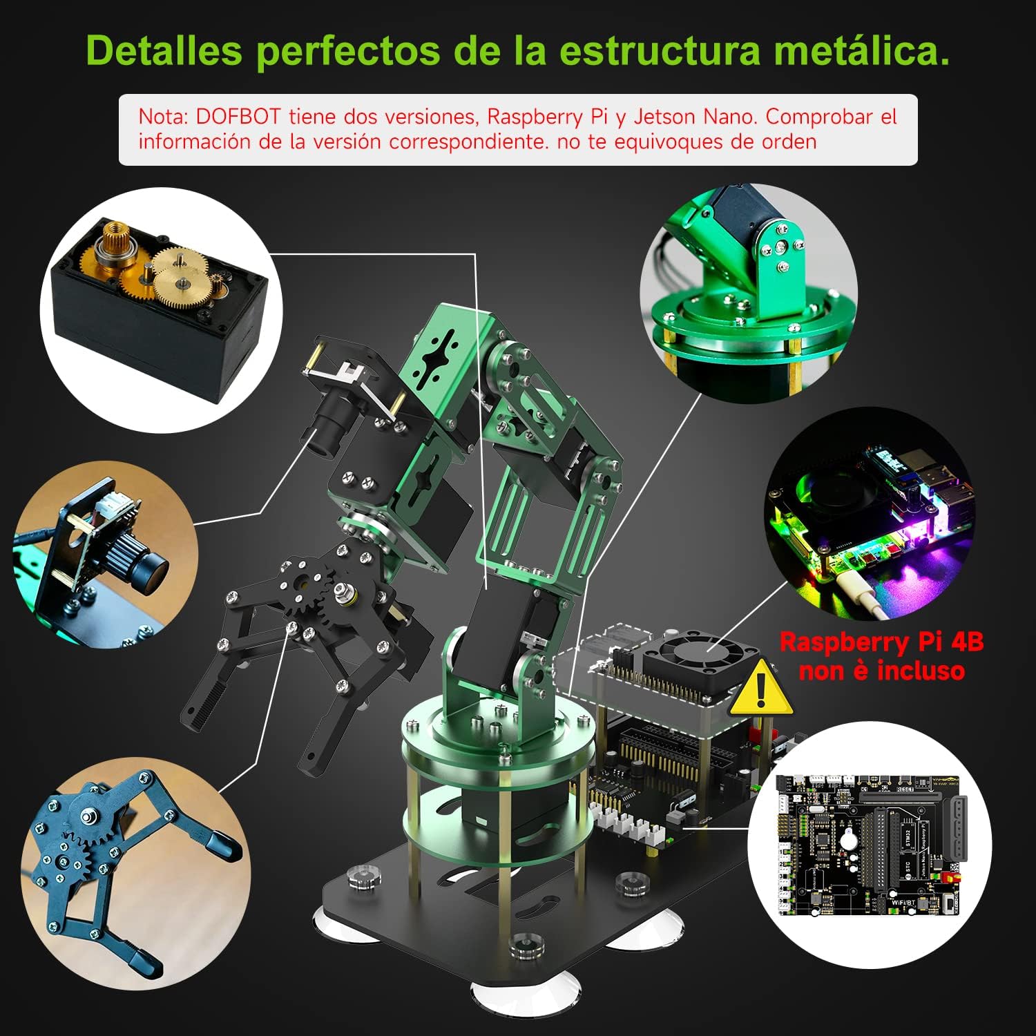 【Note】Dofbot version is compatible with Raspberry Pi5 4GB/8GB, and the used version is Pi 4B. 【Artificial Intelligence Robotic Arm with Camera】Robotic arm comes with camera to achieve FPV video transmission. The robotic arm can recognize colors, specific gestures and faces, respond to the recognized gestures and track the recognized faces, track the corresponding colors, and grab the corresponding designated color objects. These recognition, tracking and grabbing actions fully reflect the AI bionic characteristics of robot arm. DOFBOT starts to take you into the field of AI robotics. 【DOFBOT Motion Control】 Robotic arm not only has its own fixed action group, but also can perform custom actions. In terms of control method, we can use the Master Machine to control the Slave Machine to achieve remote operation of real-time transmission of action gestures. What’s more,the ros system can be used to build obstacle models, so that the robotic arm can avoid opening the obstacles to operate. Flexible arms can complete complex tasks for you 【Freely enjoy 5 control methods】 The programmable robot arm kit can use the multi-function APP (Android/iOS) to operate most of the functions; the kit is equipped with a USB gamepad remote control to achieve the best control feeling; it can also be used PC upper computer view image transmission; 3D simulation model construction of ROS system; Jupyter Lab webpage online programming. 5 kinds of interconnected control methods can enjoy the fun of robotic arm 【Top Configuration】Dofbot uses 15kg smart serial bus metal gear digital servo, which is conducive to separately controlling and reading the angle of each steering gear; equipped with a fully functional expansion board, reserved for continued expansion; the robotic arm is made of fully anodized aluminum alloy with a beautiful and strong structure 【Easy to Get Start & Online Technical Support】The assembled robotic arm can be controlled directly by simply installation and quick connection to the network (Based on the factory burned image). However, this robotic arm is for DIY makers with basic Python programming knowledge. Yahboom provide a large amount of course materials and online technical support is available. If you encounter difficulties, pls contact Yahboom. ***Raspberry Pi-5 (4G or 8G) is recommended