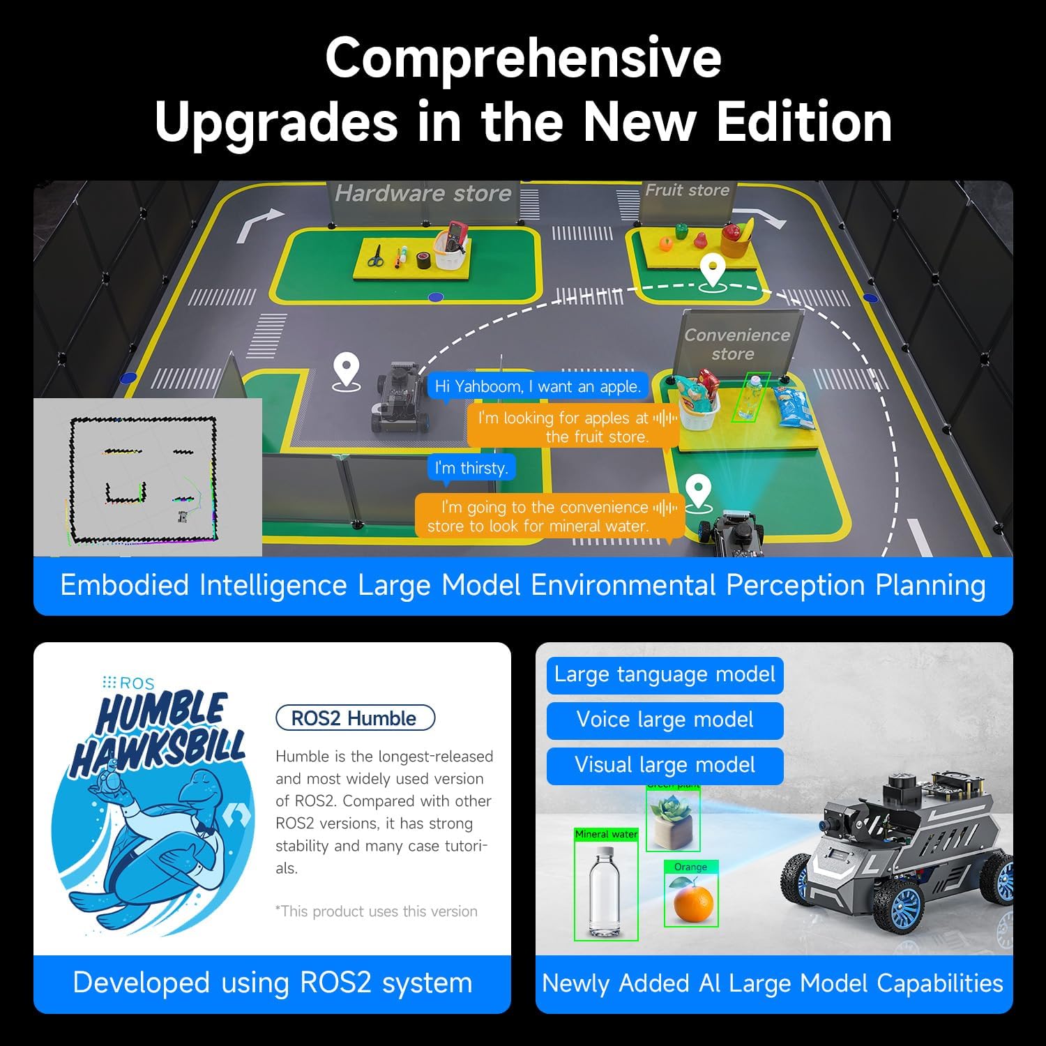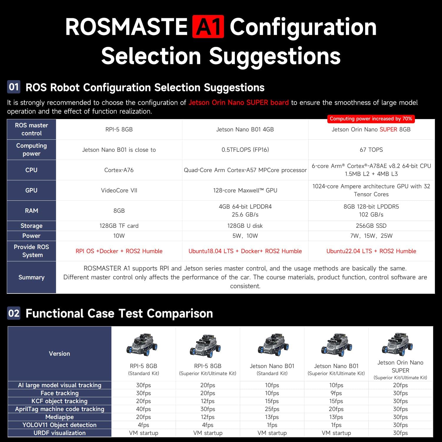 【AI Large Model Interaction & Embodied Intelligence】Rosmaster A1 supports dual-model dynamic reasoning, enhanced RAG search, and free conversation interruption. It recognizes the described scene and boasts superior environmental perception, reasoning, and intelligent execution capabilities, enabling natural, smooth, and context-aware human-computer interaction. 【Controller Options for Diverse Applications】Rosmaster A1 Ackerman robot supports 5 different development board configurations: Jetson Orin Nano Super 8GB, Raspberry-Pi 5 (8GB), and Jetson Nano B01 4GB, catering to needs from beginners to advanced developers. Recommended for Orin Nano Super Version, high-performance deep learning research and computation, supporting more complex AI models. 【High-performance hardware configuration】Adopts Ackerman steering chassis to realize road sign and traffic light recognition, close to actual driving, helping users develop autonomous driving technology; equipped with Nuwa-HP60C depth camera+TminiPlus lidar/SLAM C1 Lidar, using high-torque 520 motor; large-capacity battery, battery life increased by 170%, and comes with a large-capacity TF card to meet multi-tasking needs. 【Relocalization SLAM Navigation】The upgraded SLAM with Relocalization system, high flexibility, requiring no environmental modifications. The map is stored in software, allowing for dynamic changes to tasks, paths, and destinations. It's ideal for complex, dynamic environments with frequent task changes. It also supports various AI applications such as SLAM mapping, path planning, object recognition, and target tracking. 【Open Source Ecosystem & Professional Support】Compatible with ROS2/open source code, it provides detailed tutorials and an SDK. Expandable with accessories like robotic arms and sensors, it's suitable for AI research, educational experiments, smart home control, and more. It's an excellent choice for STEM education and robotics programming enthusiasts.