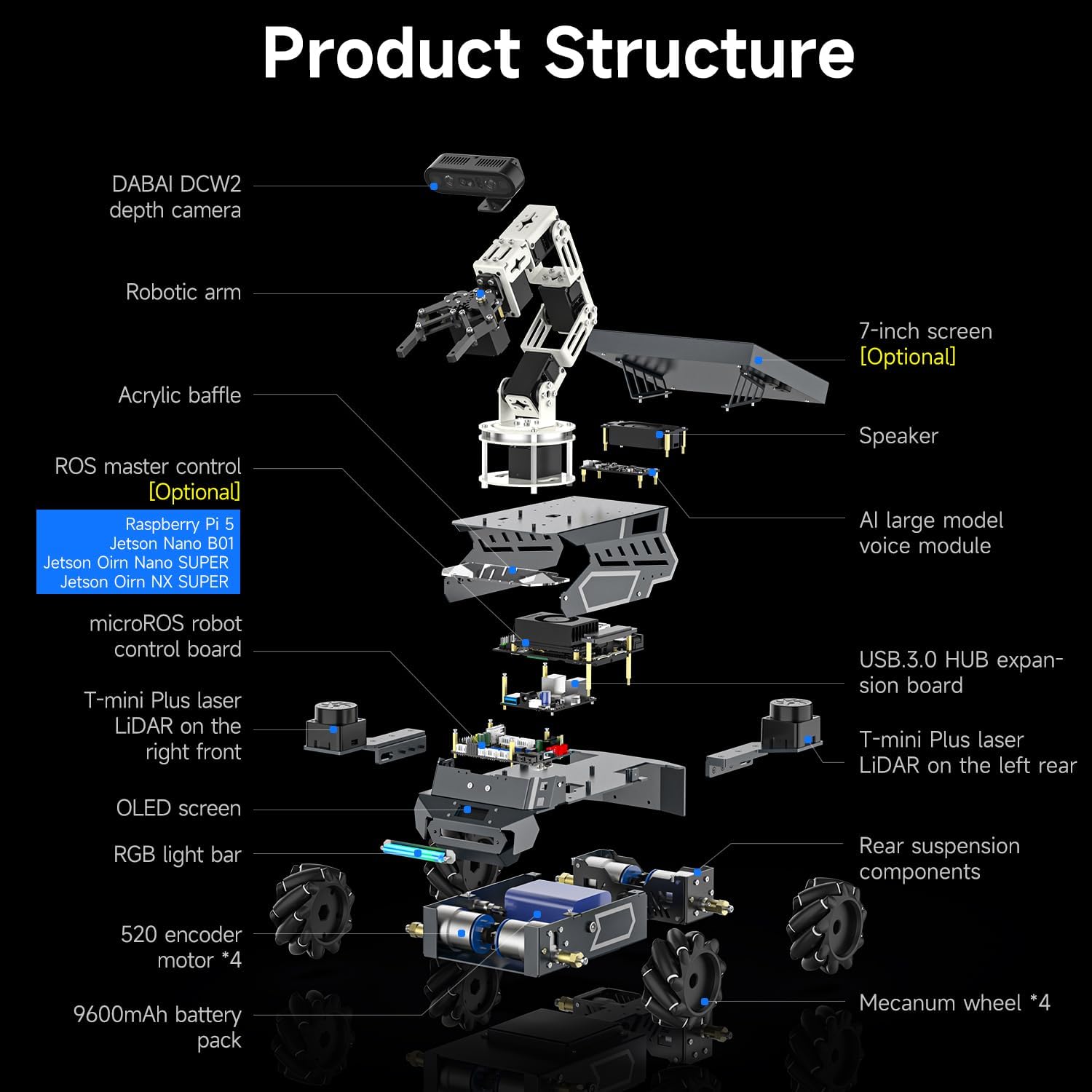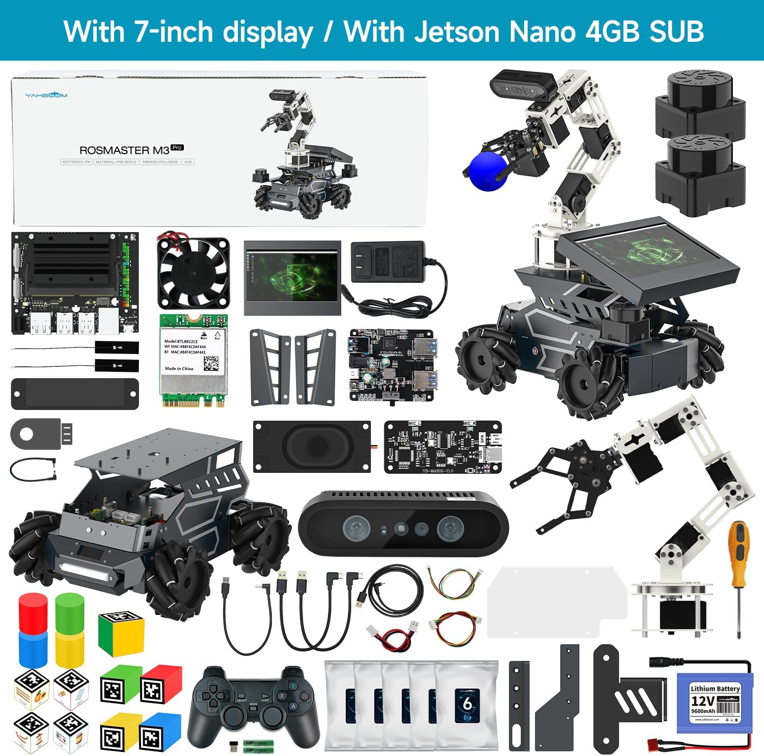 [Embodied Intelligence Experience] ROSMASTER M3 Pro uses the ROS2 system and the latest inference architecture, providing users with an enhanced user experience. It can see its surroundings, analyze its surroundings, and chat with users via voice, with support for free interruptions. Users don't need to issue specific voice commands; the robot will automatically understand the user's needs and execute them perfectly. [Three Built-in AI Models] The ROSMASTER M3 Pro integrates a large language model, a large speech model, and a large vision model. Equipped with an AI large-scale voice module and a speaker, the robot supports real-time voice-to-text conversion. When connected to the OpenRouter platform, it can understand voice commands in real time and respond flexibly. The DABAI DCW2 depth camera gives the robot vision, enabling it to understand and analyze nearby objects. [High-Performance Hardware]: The robot car features a large aluminum alloy chassis with four Mecanum wheels and a rear-wheel pendulum suspension design, enabling easy obstacle traversal and omnidirectional movement. A 6DOF robotic arm and depth camera combine to enable 3D intelligent gripping. Dual radars and a touchscreen (optional) facilitate data debugging. A choice of high-performance Jetson Orin development boards or Raspberry Pi motherboards are available. [Version Note] ROSMASTER M3 Pro has 10 versions: one with a 7-inch IPS touch screen and one without. Each version is divided into 5 different master controllers: Orin NX 16GB / Orin NX 8GB / Orin Nano 8GB / Jetson Nano B01 / Raspberry Pi 16GB. To ensure the efficient operation of the robot car, it is recommended to choose a high-computing power development board. [Systematic and Detailed Courses] With over 200 course materials, you'll quickly learn and experience the joy of AI. Yahboom's course code is fully open source. If you encounter technical issues, please contact Yahboom and our technical support team will assist you.