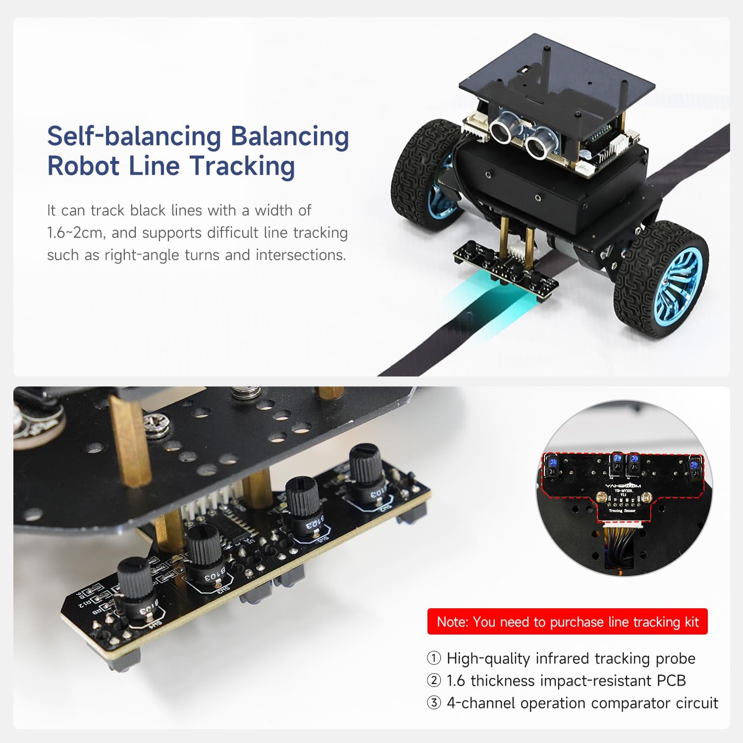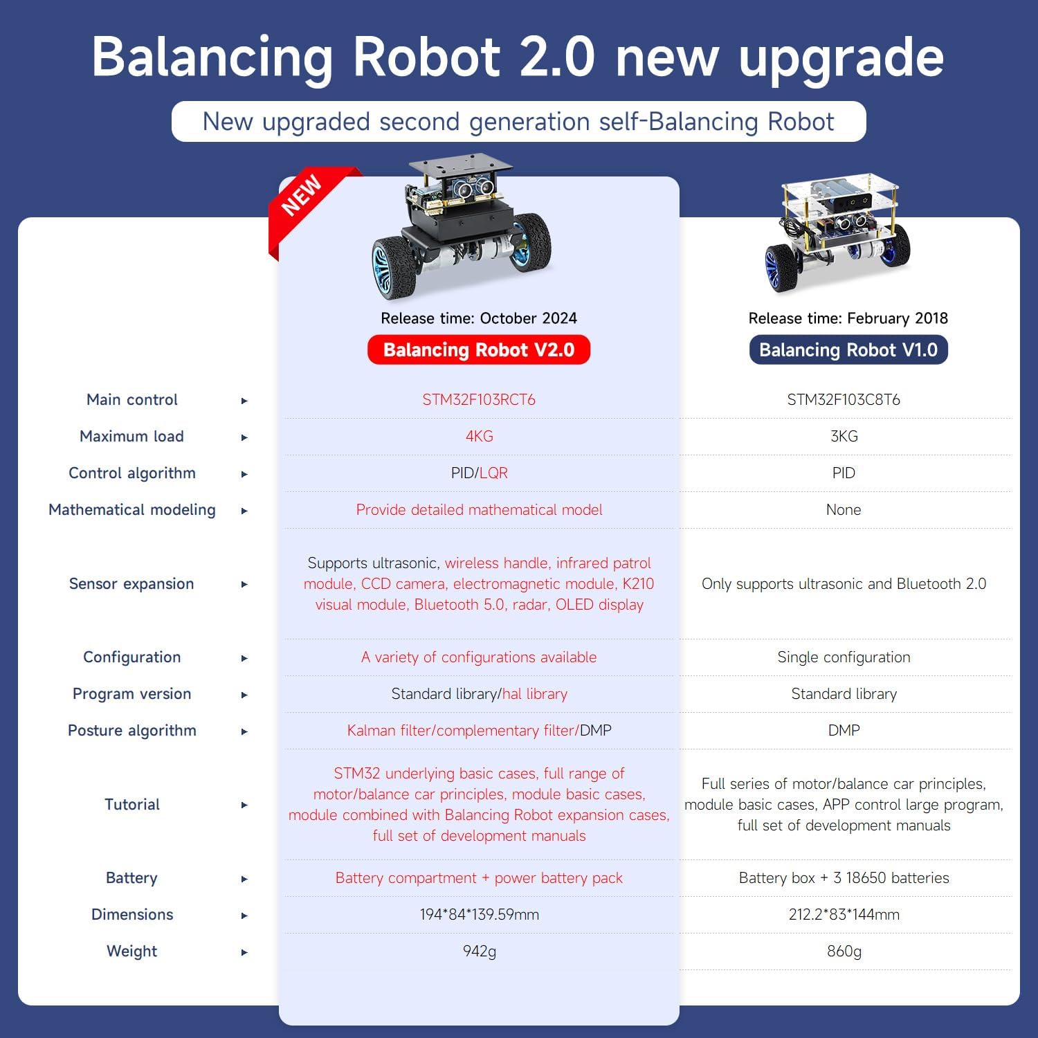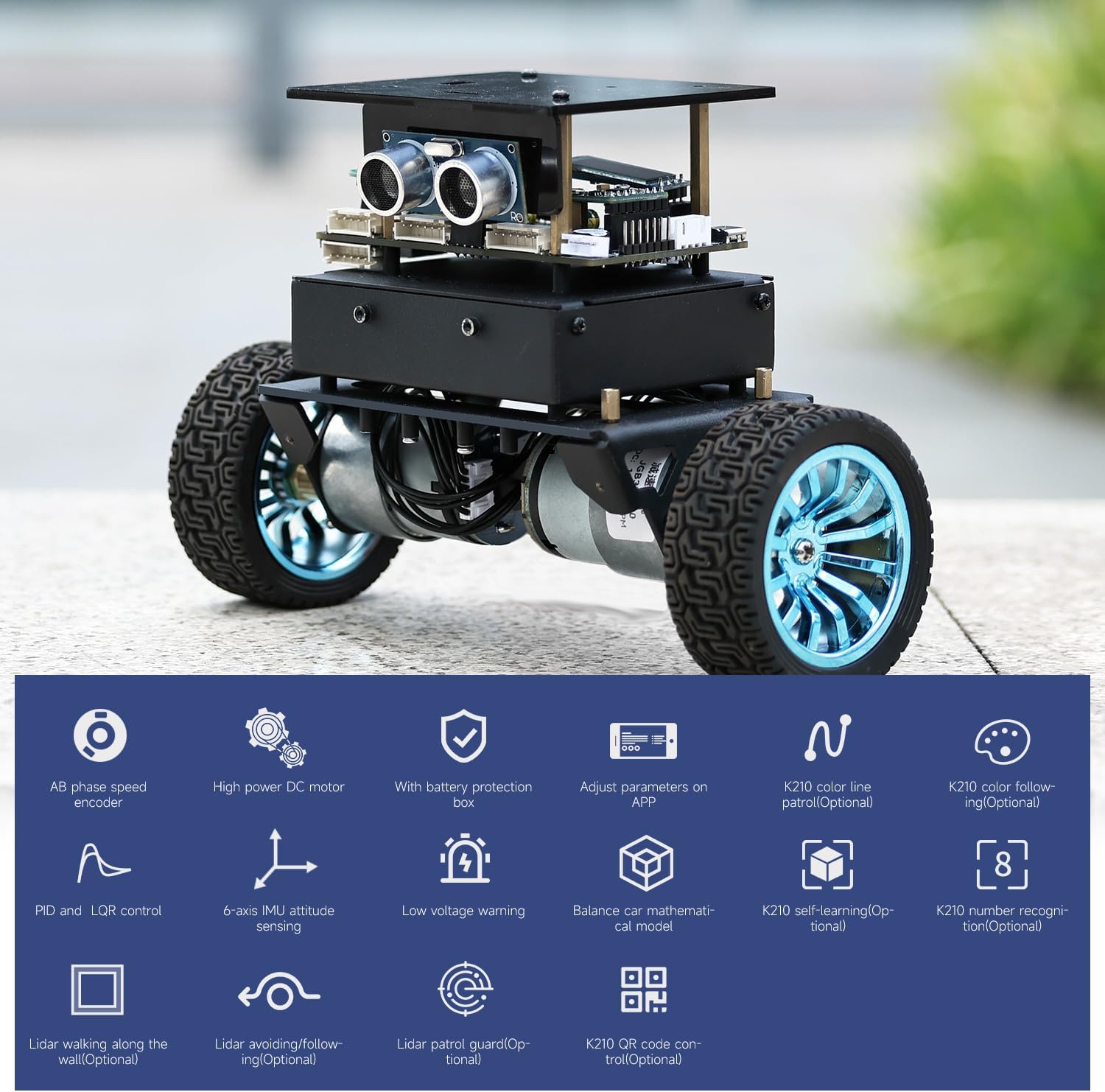【2-Wheel Self-balancing Robot Car Kit】This self-balancing robot car kit is designed for teenagers aged 16+ to learn coding, building and robotics. It is developed based on STM32F103RCT6, uses PID/LQR control algorithm, adopts Kalman filter/complementary filter/DMP attitude algorithm, and is equipped with an industrial-grade 6-axis MPU6050 gyroscope. It is the best choice for learning programming and robotics. 【Super Multi-Function Play&Novel Setting Method】The 2-wheel self-balancing robot comes with 20 functions to play. No additional program needs to be downloaded. You can switch between different modes by simply turning the wheels. It is full of fun. The basic functions of the robot car include posture recognition, ultrasonic following and obstacle avoidance, balance car climbing, and load-bearing mode can run normally under the condition of bearing 4KG. 【2 Control Modes】Supports mobile phone APP control, you can use button mode, gravity mode, and joystick mode to control the movement of the car, and display the car speed, distance, battery voltage and other data; for professional robot enthusiasts, the APP can provide PID debugging interface display and waveform display interface display. The car also supports 2.4G wireless handle remote control, which has more precise speed control and better control experience. 【Four Optional Sensors】 The four-way infrared patrol line allows the balancing car to automatically follow the black line and even make a super-sharp turn; the 2.4G wireless handle remote control can precisely control the car's speed; the radar module enables the car to achieve advanced functions such as obstacle avoidance, guarding, tracking, and patrolling; the K210 visual module can achieve functions such as color following, visual patrol line, and image code control. 【Full Set of Learning Materials】For robot enthusiasts, we provide comprehensive PID-specific source code and detailed documentation tutorials to help you get started quickly and gain in-depth understanding; and provide mathematical modeling, LQR control source code and library functions/HAL library and other source codes; control-related codes are all annotated in English, making it very easy to read the code.