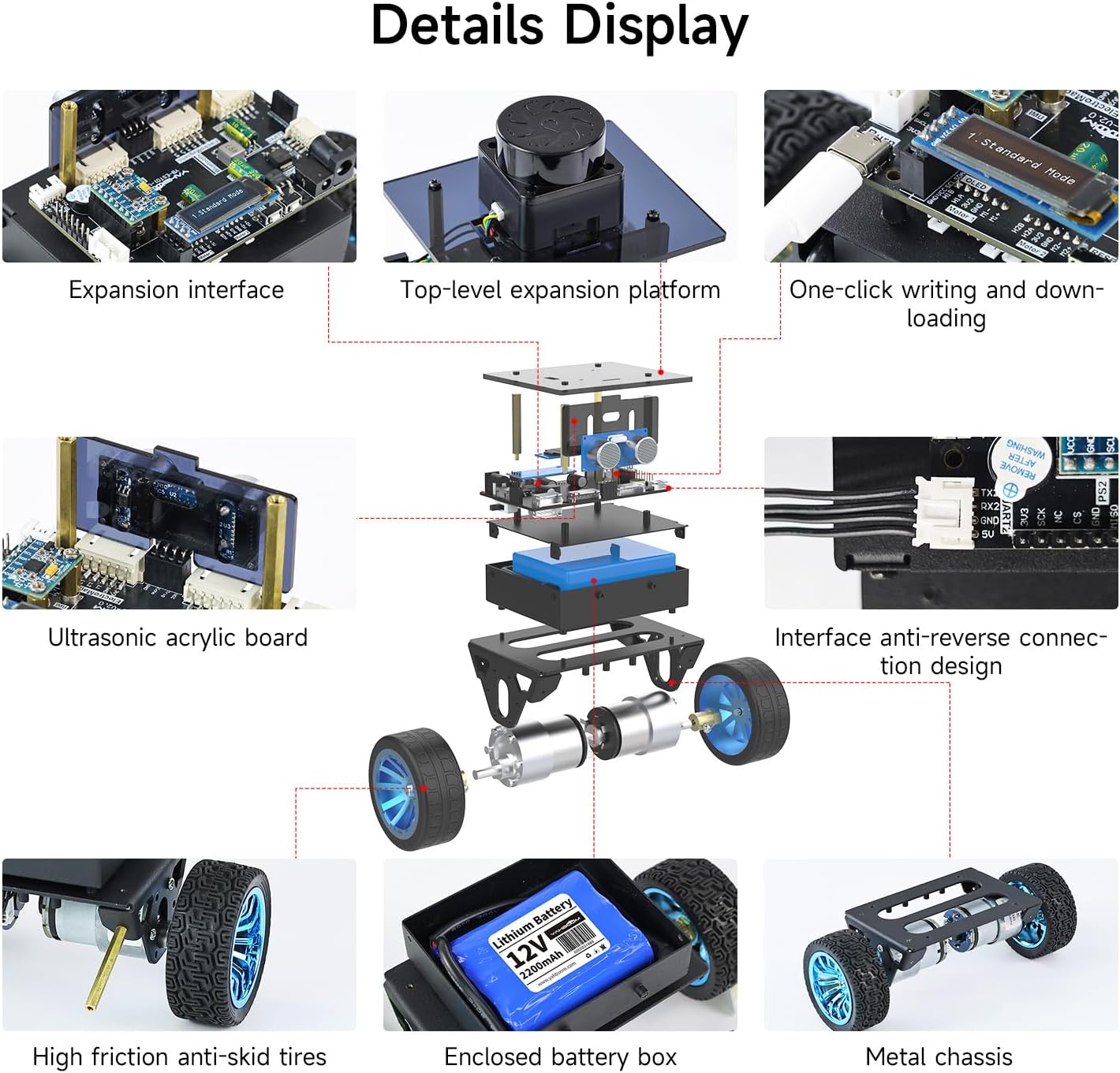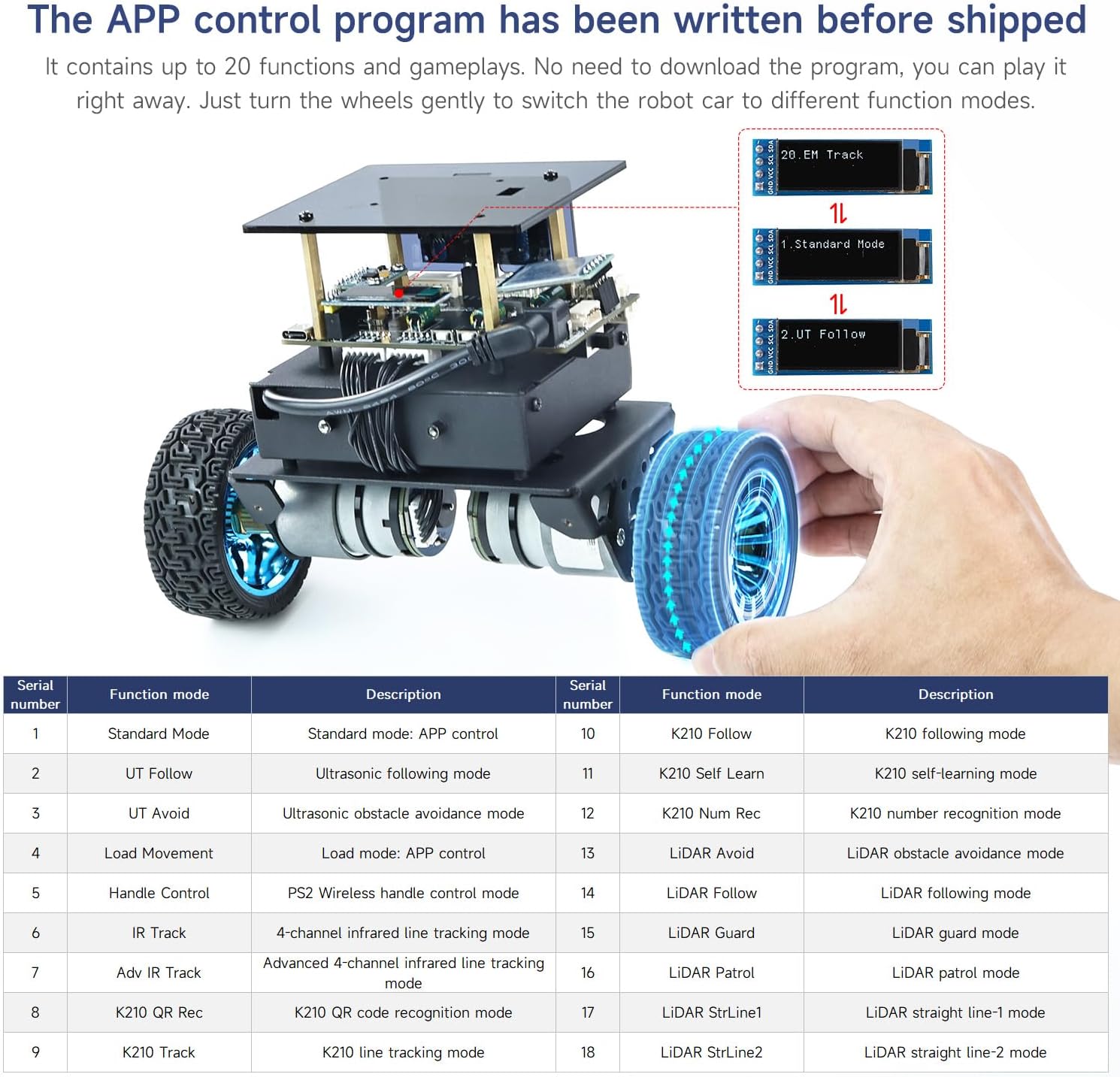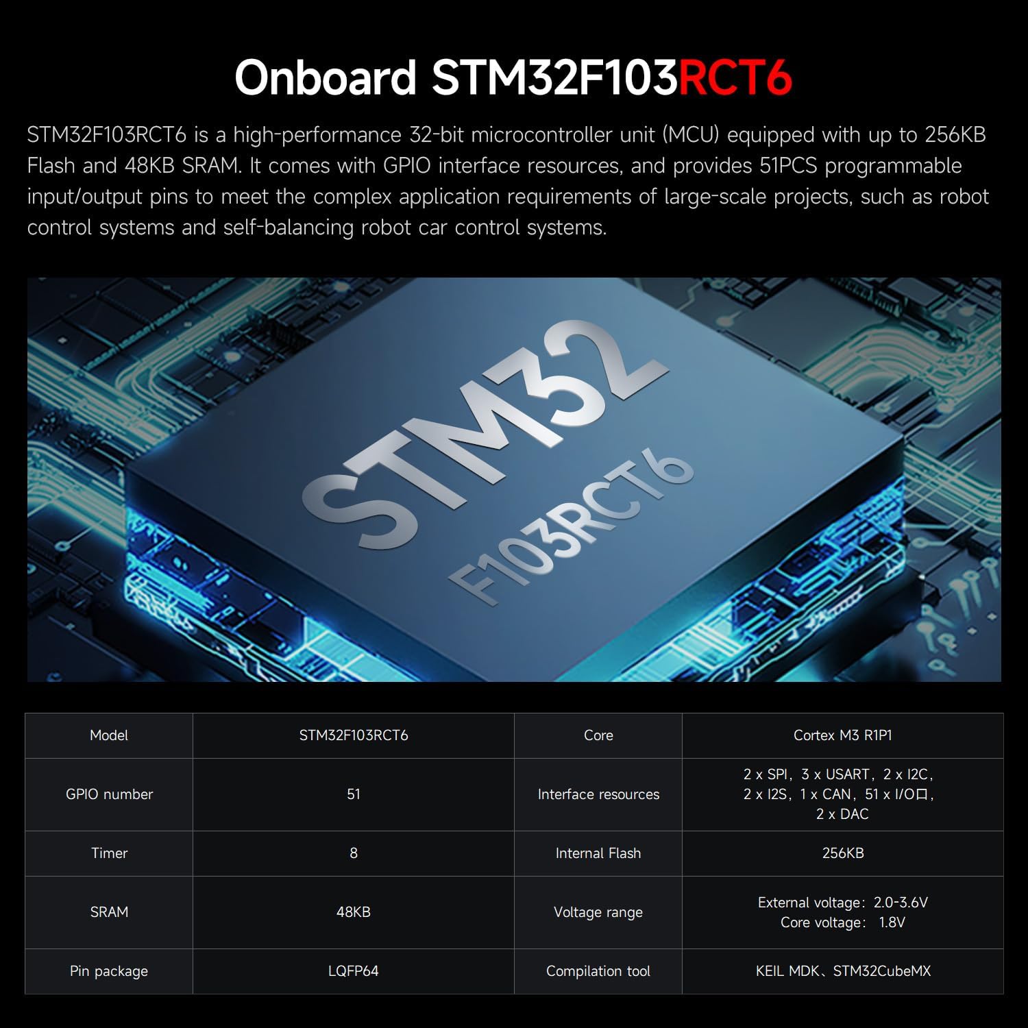 【2-Wheel Self-balancing Robot Car Kit】This self-balancing robot car kit is designed for teenagers aged 16+ to learn coding, building and robotics. It is developed based on STM32F103RCT6, uses PID/LQR control algorithm, adopts Kalman filter/complementary filter/DMP attitude algorithm, and is equipped with an industrial-grade 6-axis MPU6050 gyroscope. It is the best choice for learning programming and robotics. 【Super Multi-Function Play&Novel Setting Method】The 2-wheel self-balancing robot comes with 20 functions to play. No additional program needs to be downloaded. You can switch between different modes by simply turning the wheels. It is full of fun. The basic functions of the robot car include posture recognition, ultrasonic following and obstacle avoidance, balance car climbing, and load-bearing mode can run normally under the condition of bearing 4KG. 【2 Control Modes】Supports mobile phone APP control, you can use button mode, gravity mode, and joystick mode to control the movement of the car, and display the car speed, distance, battery voltage and other data; for professional robot enthusiasts, the APP can provide PID debugging interface display and waveform display interface display. The car also supports 2.4G wireless handle remote control, which has more precise speed control and better control experience. 【Four Optional Sensors】 The four-way infrared patrol line allows the balancing car to automatically follow the black line and even make a super-sharp turn; the 2.4G wireless handle remote control can precisely control the car's speed; the radar module enables the car to achieve advanced functions such as obstacle avoidance, guarding, tracking, and patrolling; the K210 visual module can achieve functions such as color following, visual patrol line, and image code control. 【Full Set of Learning Materials】For robot enthusiasts, we provide comprehensive PID-specific source code and detailed documentation tutorials to help you get started quickly and gain in-depth understanding; and provide mathematical modeling, LQR control source code and library functions/HAL library and other source codes; control-related codes are all annotated in English, making it very easy to read the code.