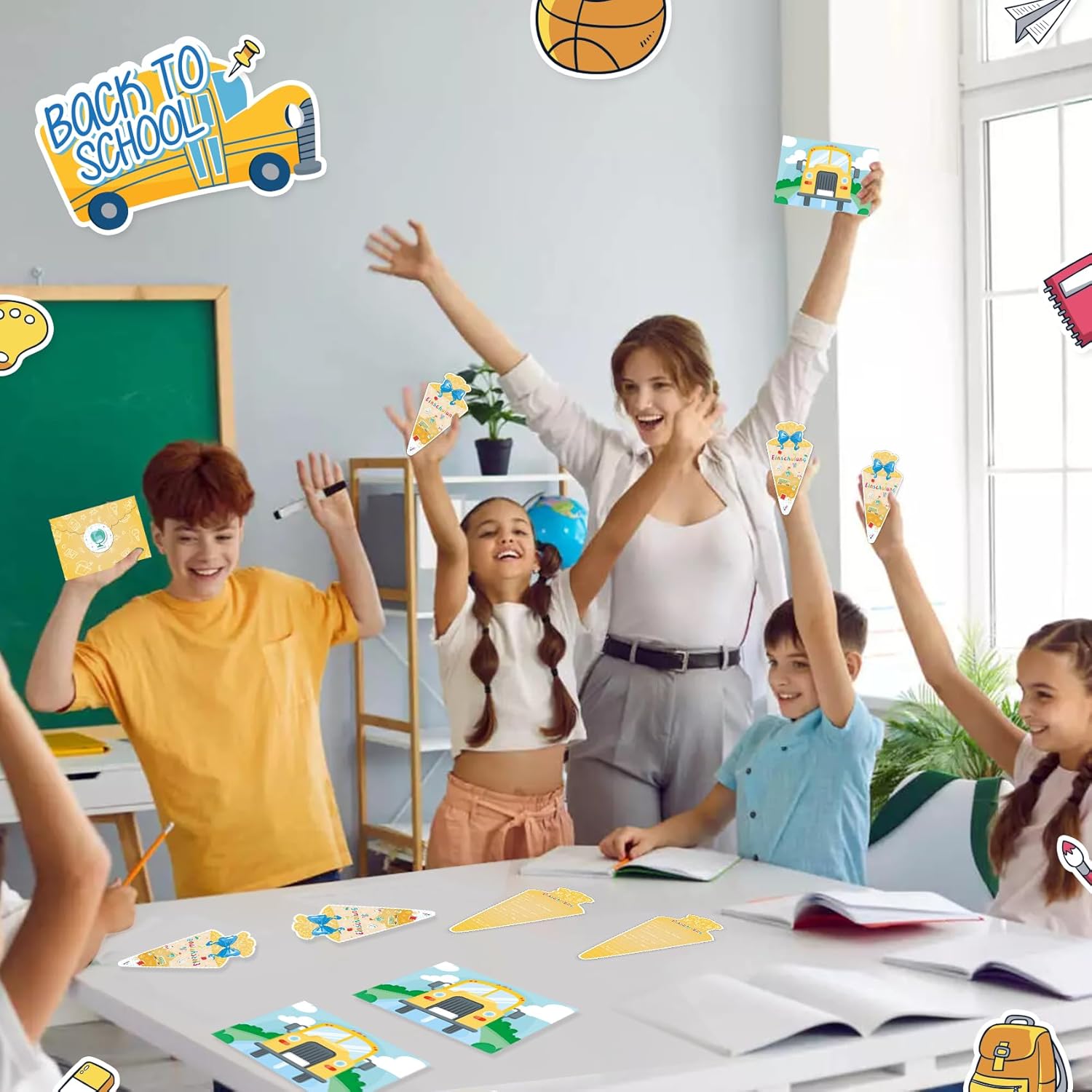 12 biglietti di invito – contengono 12 biglietti d'invito fatti a mano e 12 buste, 2 adesivi per l'inizio della scuola. Alta qualità: i biglietti sono realizzati in cartone robusto e resistono all'uso prolungato da parte dei bambini. Elementi scolastici: i biglietti sono stampati con divertenti elementi scolastici, scuolabus, globi, sacchetti per la scuola e molto altro ancora, perfetti per una festa per il primo giorno di scuola. Design semplice: il design adatto ai bambini facilita la comprensione del prossimo inizio della scuola. IDEE REGALO: i biglietti d'invito per l'inizio della scuola sono il regalo perfetto per ragazzi e ragazze per il primo giorno di scuola. Può essere utilizzata come decorazione per la festa di scuola, come regalo di addio per l'asilo o come piccolo regalo per compagni di classe e amici.