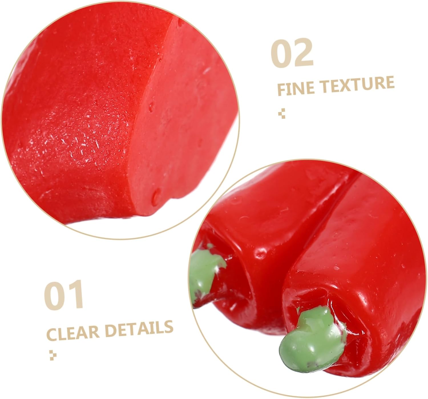 Fotografia creativa: questi mini peperoni artificiali servono come ottimo supporto per i fotografi che vogliono aggiungere un tocco creativo ai loro scatti, come decorazione di peperoncino per la cucina o come decorazione con verdure artificiali fai da te: ideali per creare eleganti mini paesaggi. Questi piccoli ornamenti vegetali permettono di creare scene uniche ed incantevoli. Figure di peperoncino artificiale, piccoli peperoncini artificiali Alto realismo: questi peperoncini in miniatura sono progettati in modo molto realistico e sono ideali per aggiungere un tocco di autenticità a qualsiasi ambiente. Mini peperoncini artificiali, statua vegetale artificiale Oggetti di scena creativi: questi mini peperoncini artificiali servono come eccellenti oggetti di scena per i fotografi che vogliono aggiungere un tocco creativo ai loro scatti. Mini peperoni artificiali realistici e decorativi Alto realismo: queste verdure artificiali realistiche sono progettate per sembrare molto simili ai peperoni, migliorando l'autenticità del tuo arredamento. peperoncini decorativi, ornamenti vegetali realistici