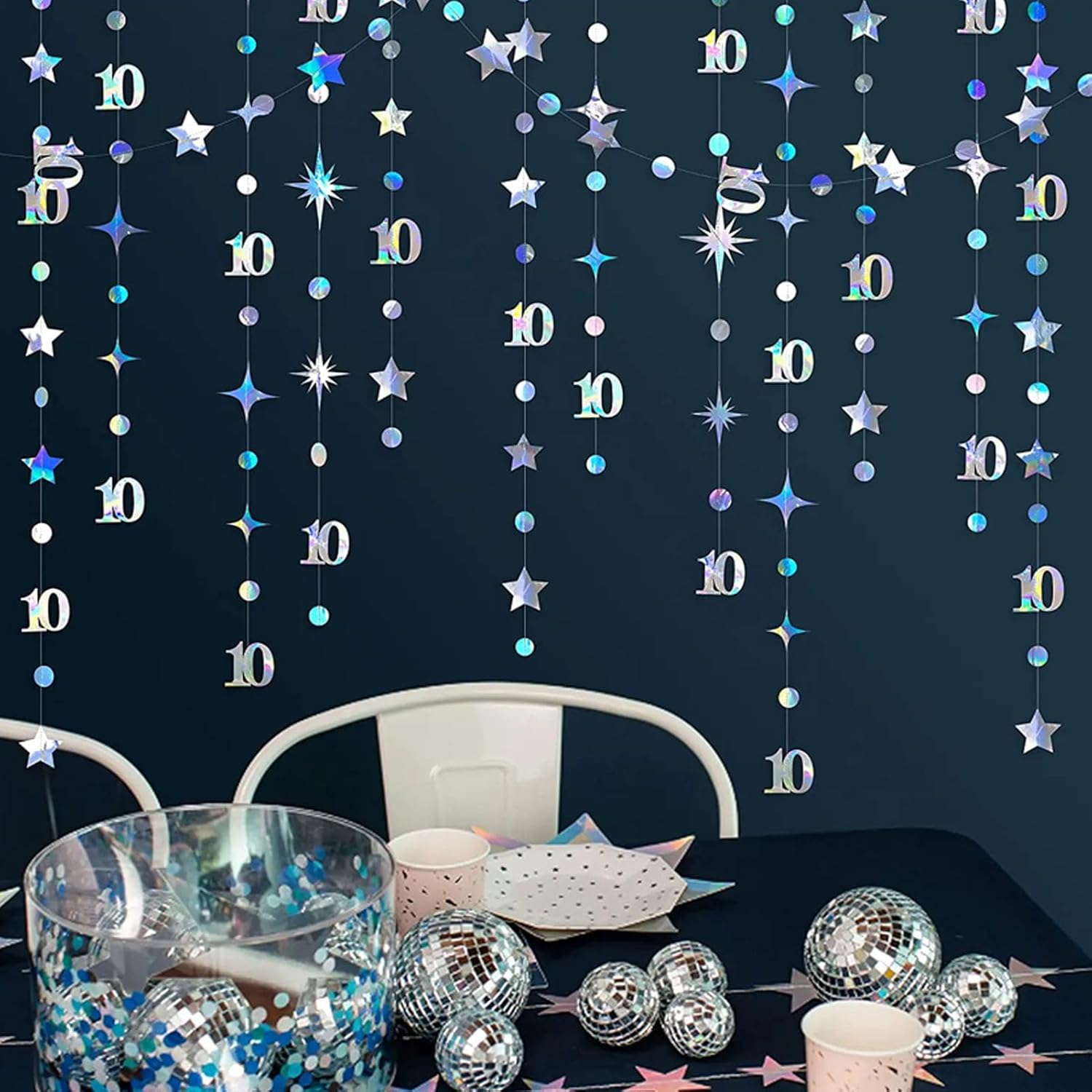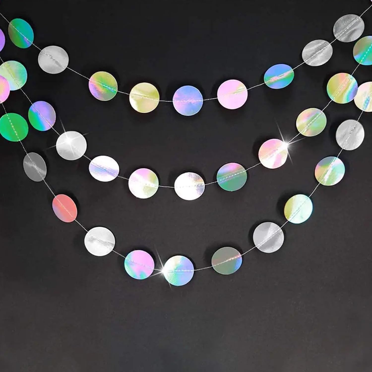 Decorazioni per feste iridescenti con glitter argento: elegante set di 4 ghirlande di cordoncini di carta rotondi colorati con cerchi lucidi da 1,96 pollici cuciti in cavi da 4 m/13 piedi, circa 56 punti per un totale di 52 piedi. Ideale per compleanni, matrimoni, baby shower, addio al nubilato e occasioni festive come decorazioni di anniversari di carnevale di Natale o Capodanno. Ghirlanda versatile e sofisticata: perfetta per matrimoni, feste di anniversario, compleanni importanti, lauree, rivelazioni di genere, vacanze, feste dei 16 dolci, feste in discoteca, Ramadan, feste di ringraziamento e fidanzamento. Migliora qualsiasi tema con l'eleganza dei glitter argento. DESIGN DUREVOLE E RIUTILIZZABILE: Realizzata in cartoncino spesso glitterato con filo resistente, questa ghirlanda non si piegherà e manterrà la sua lucentezza anche con un uso ripetuto. Una soluzione decorativa per un glamour duraturo in molteplici eventi. Ed è carta rotonda lucida fronte-retro Installazione e regolazione senza sforzo: basta districare e appendere a soffitti, pareti, tavoli o cabine fotografiche. Taglia la carta a qualsiasi lunghezza o superficie, inclusi porte, finestre, tendoni o fondali di eventi. Leggero per un utilizzo senza stress all'interno e all'esterno. Fondali adorabili per tutte le occasioni: crea fondali lussuosi per matrimoni, feste invernali, balli studenteschi, compleanni importanti o cene festive. Aggiunge uno scintillio speciale a baby shower, addio al nubilato, decorazioni del Ringraziamento o servizi fotografici di fidanzamento.
