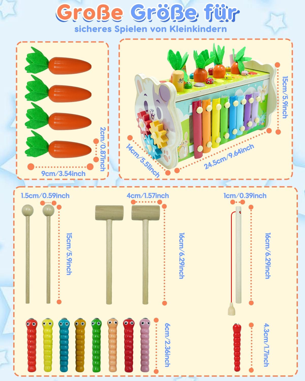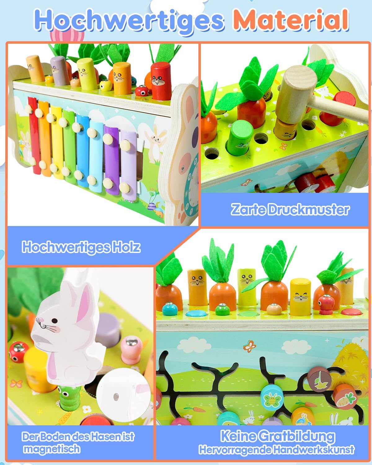 Giocattolo Montessori 8 in 1: questo giocattolo educativo per bambini a partire da 1 anno include 8 giochi: per la talpa, la raccolta delle carote, il martellamento dello xilofono, l'apprendimento dei numeri e dell'ora, rotazione degli ingranaggi, cattura insetti e ingranaggi. Combinare l'educazione con il divertimento: questo giocattolo Montessori combina diversi elementi come strati di colore e esercizi interattivi di abilità motorie. Il martellamento favorisce la coordinazione occhio-mano e le capacità motorie, rafforzando al contempo i muscoli delle braccia. Lo xilofono a 8 stadi supporta la percezione uditiva e lo sviluppo musicale. Il puzzle labirinto di numeri contribuisce al riconoscimento dei numeri e alla promozione mentale. Sicuro e durevole: questo giocattolo in legno è appositamente progettato per bambini a partire da 1 anno. Realizzato in legno naturale e vernice a base d'acqua, garantisce assoluta sicurezza e lunga durata. Lucidato più volte per bordi lisci e costruzione stabile, ideale per le mani dei bambini piccoli per afferrare e giocare Giocattolo educativo interattivo: contiene 2 morbidi martelli per giocare insieme a genitori e bambini. Questi giocattoli interattivi Montessori promuovono sia le abilità sociali che il legame genitore-figlio nel gioco insieme a bambini o fratelli! Il regalo perfetto per i bambini: in esclusiva confezione regalo, perfetto per il primo compleanno, Natale, Pasqua, Capodanno o qualsiasi occasione speciale. Sicuro, pedagogicamente prezioso e appositamente progettato per bambini da 1 a 3 anni – combina divertimento con la promozione precoce dell'apprendimento, adatto sia per ragazzi che per ragazze. La scelta premium per momenti interattivi e divertimento quotidiano