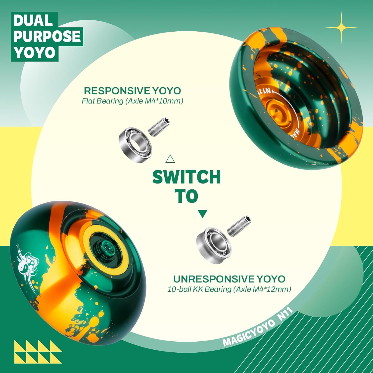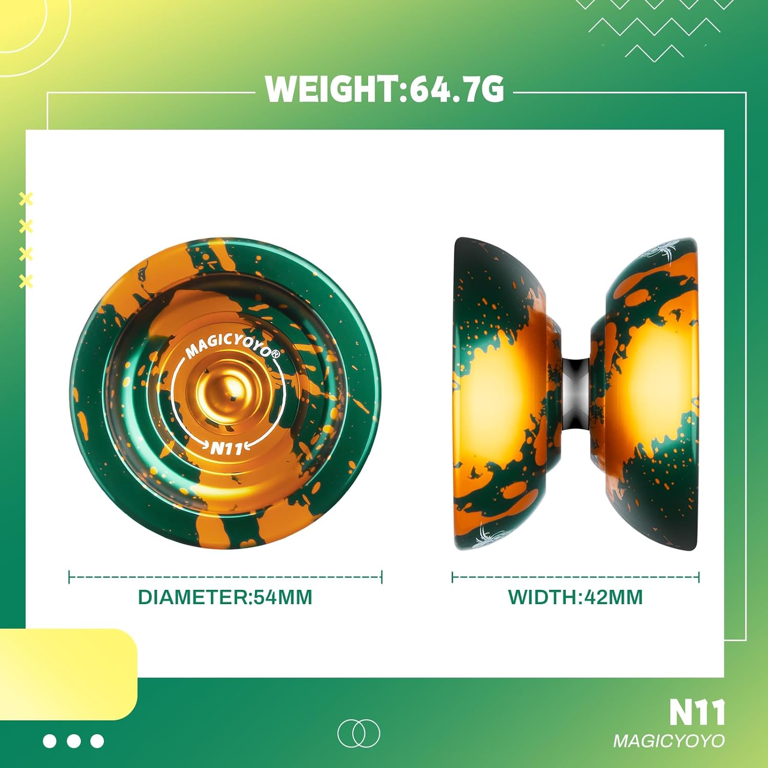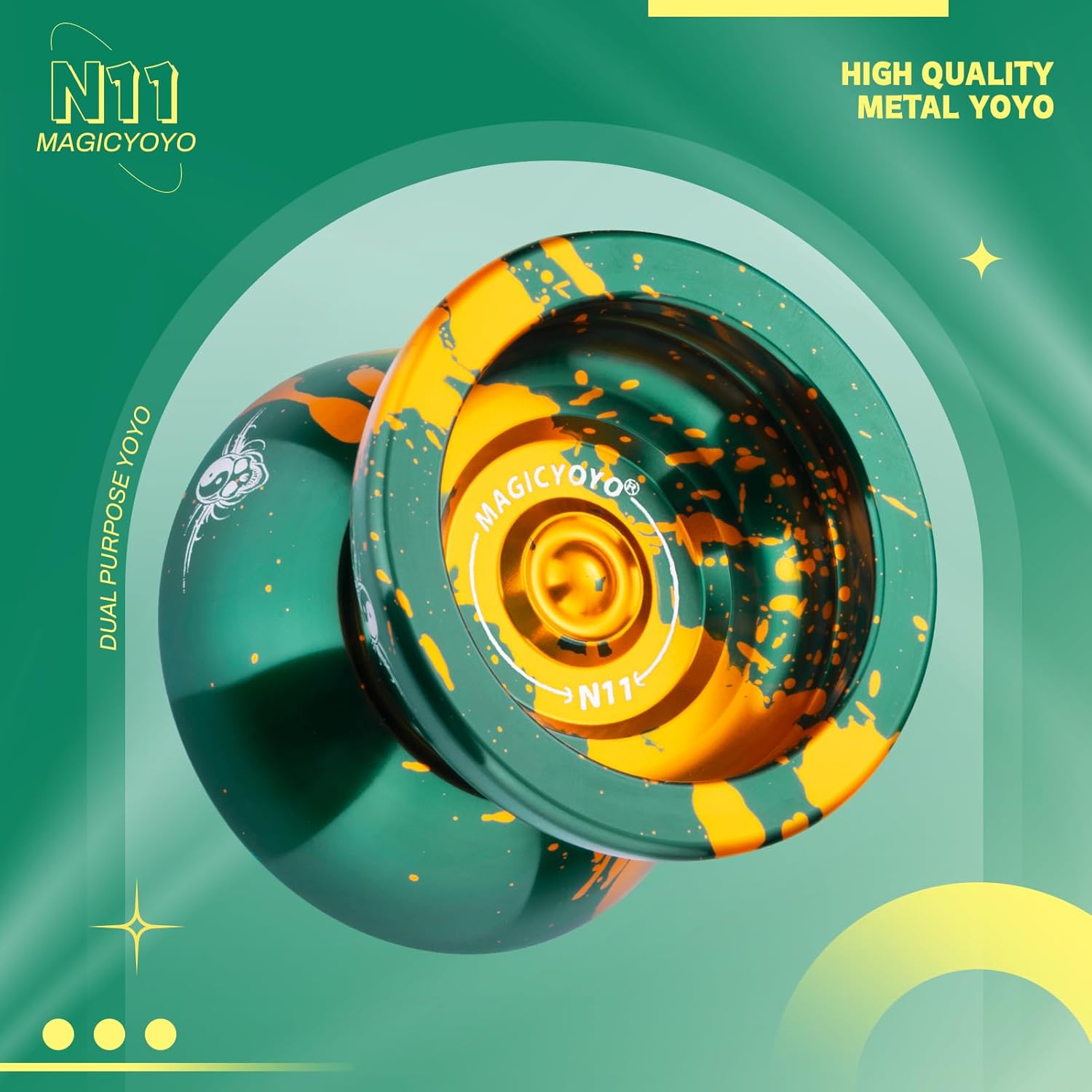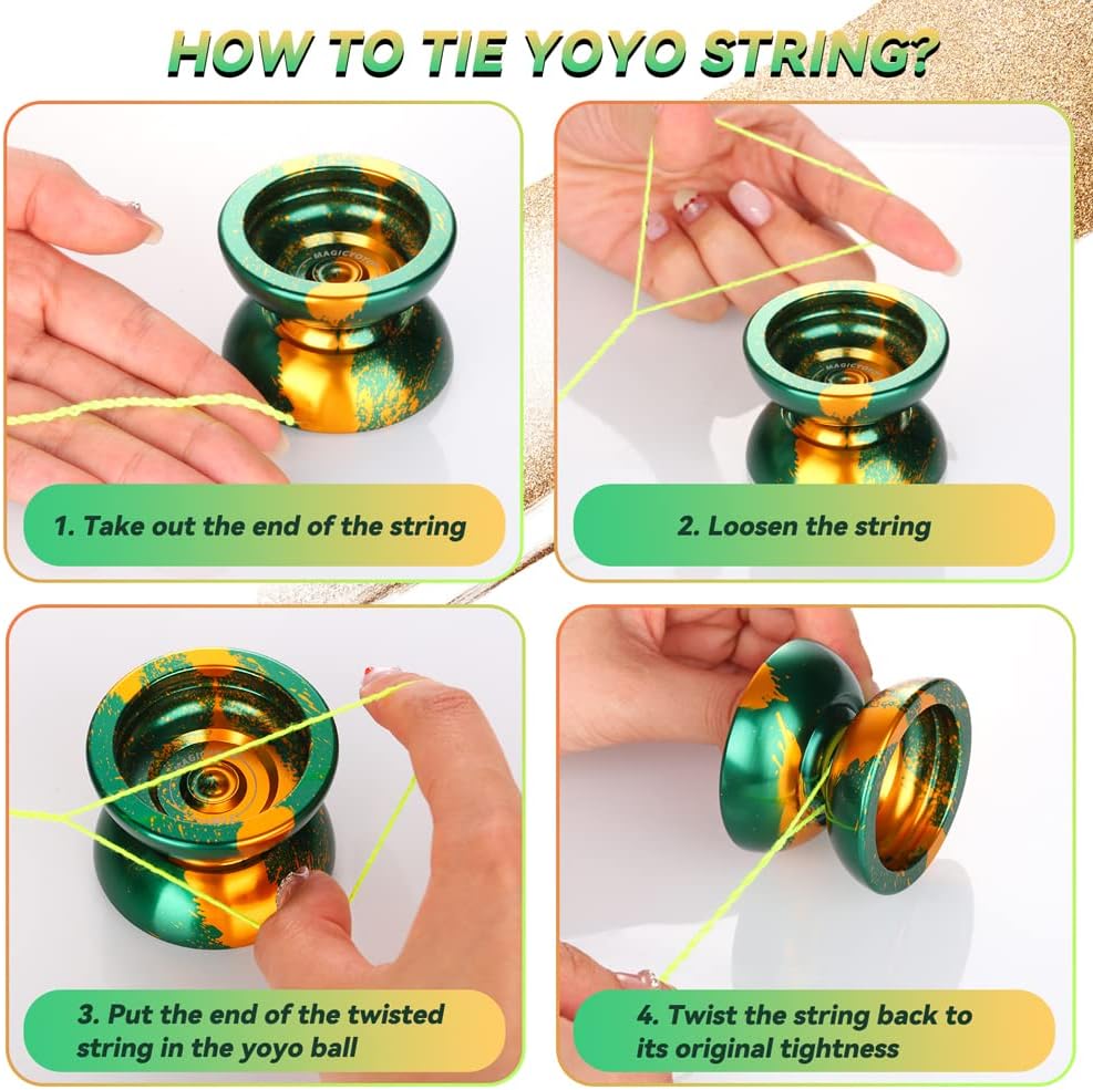 DUAL FUNCTION YOYO - MAGICYOYO N11 Green Golden è stato aggiornato a Yoyo reattivo professionale e Yoyo non reattivo. L'aggiornamento yoyo N11 ha una rotazione potente, un'eccellente stabilità e una grande presenza sulla corda yoyo. Trucco di stringa di stile (1A, 3A, 5A) YO YO FUN TO PLAY - Metallo yoyo N11 dotato di cuscinetto KK, un yoyo non reattivo, che significa che è necessario fare un trucco chiamato "bind" per restituire yoyo. Ricerca consigliata "come restituire yo yo yo non rispondente" e imparare altre abilità yo-yo su YouTube o TikTok. Quando sostituisci KK Bearing con Flat Bearing, diventa un yoyo reattivo, mentre lo yoyo sta girando, tornerà alla tua mano con un leggero tiro sulla corda SOLID ALLOY YOYO - Responsive yoyo N11 realizzato in alluminio 6061 di alta qualità trattato da ossidazione anodica, finitura lucida non sbiadisce mai e non facile da graffiare. La lega di metallo yoyo presenta una forma Butterfly, una migliore distribuzione del peso e prestazioni eccezionali! AGGIUNGERE PESO EXTRA PER YOYO N11 - Yoyo Peso: 64.7g. Pro trick yoyo viene fornito con 2 anelli di pesatura in gomma, se si desidera uno yoyo più pesante, si prega di aggiungere e lo yo-yo diventerà più pesante, ha liscio stabile e piacevolmente manovrabile sulla corda REGALO DI NATALE - Yoyo migliora la coordinazione del corpo, l'immaginazione, la flessibilità delle dita e la capacità di reazione cerebrale, tiene i bambini lontani da giochi per computer e telefoni. Incluso: 1 x MAGICYOYO N11 (verde oro), 2 x anelli di pesatura in gomma, 1 x cuscinetto KK, 1 x asse (M4 * 12mm), 1 x strumento di rimozione del cuscinetto, 1 x mini chiave Allen, 12 x corde Yoyo (colori casuali), 1 x borsa