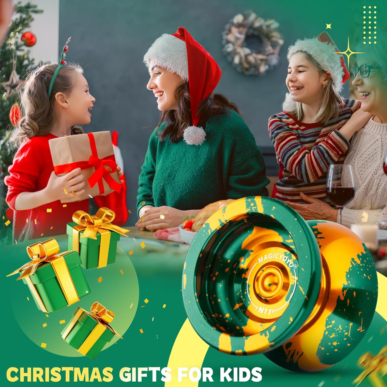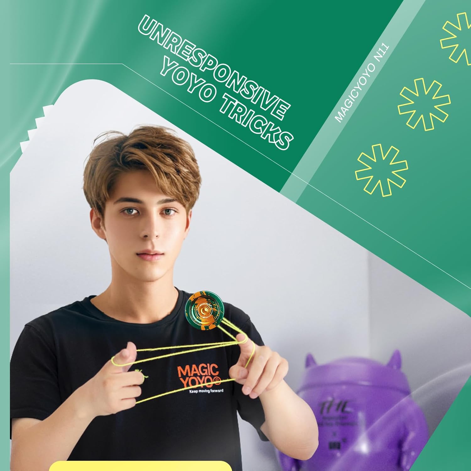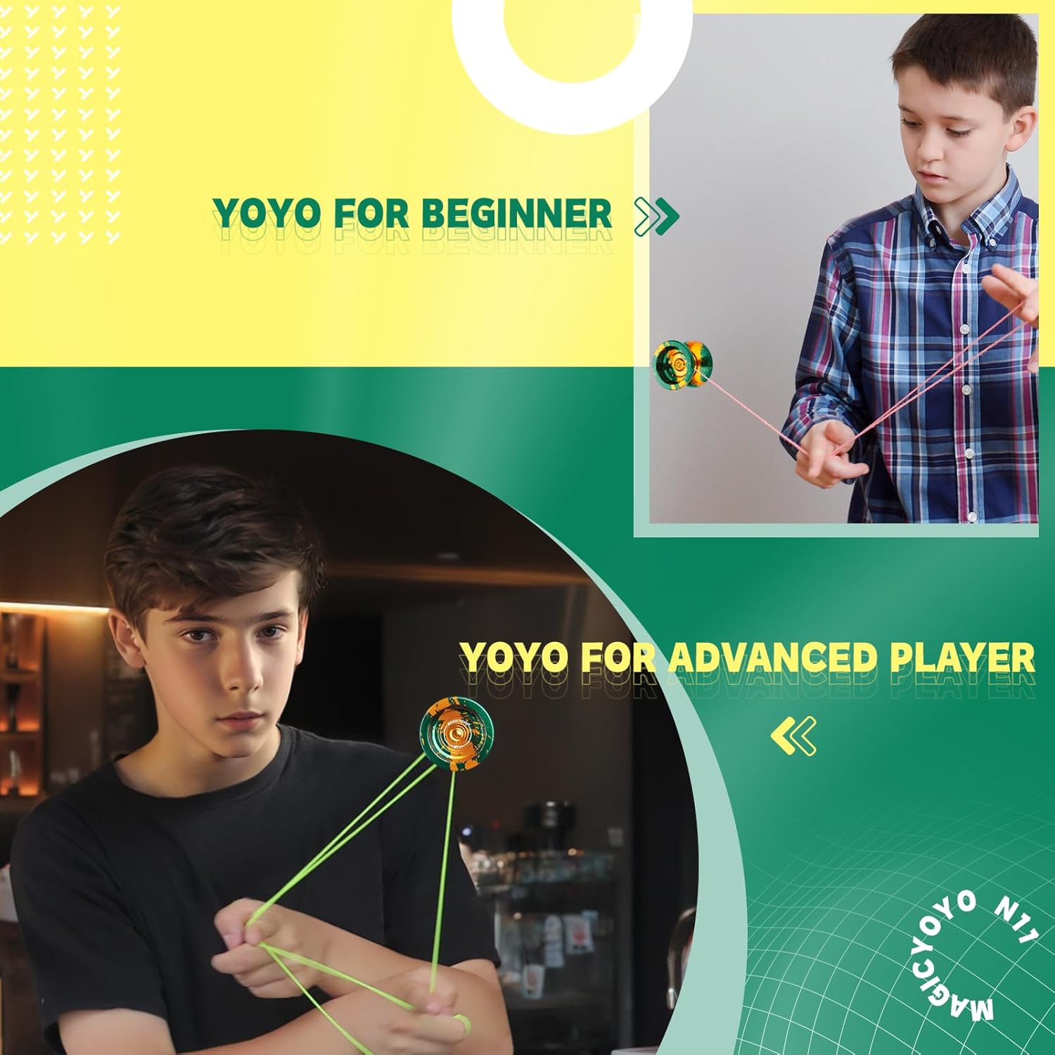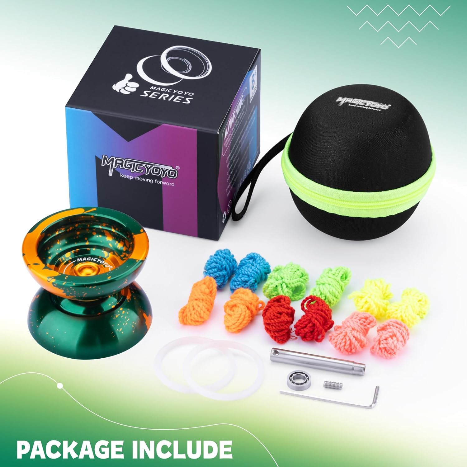 DUAL FUNCTION YOYO - MAGICYOYO N11 Green Golden è stato aggiornato a Yoyo reattivo professionale e Yoyo non reattivo. L'aggiornamento yoyo N11 ha una rotazione potente, un'eccellente stabilità e una grande presenza sulla corda yoyo. Trucco di stringa di stile (1A, 3A, 5A) YO YO FUN TO PLAY - Metallo yoyo N11 dotato di cuscinetto KK, un yoyo non reattivo, che significa che è necessario fare un trucco chiamato "bind" per restituire yoyo. Ricerca consigliata "come restituire yo yo yo non rispondente" e imparare altre abilità yo-yo su YouTube o TikTok. Quando sostituisci KK Bearing con Flat Bearing, diventa un yoyo reattivo, mentre lo yoyo sta girando, tornerà alla tua mano con un leggero tiro sulla corda SOLID ALLOY YOYO - Responsive yoyo N11 realizzato in alluminio 6061 di alta qualità trattato da ossidazione anodica, finitura lucida non sbiadisce mai e non facile da graffiare. La lega di metallo yoyo presenta una forma Butterfly, una migliore distribuzione del peso e prestazioni eccezionali! AGGIUNGERE PESO EXTRA PER YOYO N11 - Yoyo Peso: 64.7g. Pro trick yoyo viene fornito con 2 anelli di pesatura in gomma, se si desidera uno yoyo più pesante, si prega di aggiungere e lo yo-yo diventerà più pesante, ha liscio stabile e piacevolmente manovrabile sulla corda REGALO DI NATALE - Yoyo migliora la coordinazione del corpo, l'immaginazione, la flessibilità delle dita e la capacità di reazione cerebrale, tiene i bambini lontani da giochi per computer e telefoni. Incluso: 1 x MAGICYOYO N11 (verde oro), 2 x anelli di pesatura in gomma, 1 x cuscinetto KK, 1 x asse (M4 * 12mm), 1 x strumento di rimozione del cuscinetto, 1 x mini chiave Allen, 12 x corde Yoyo (colori casuali), 1 x borsa