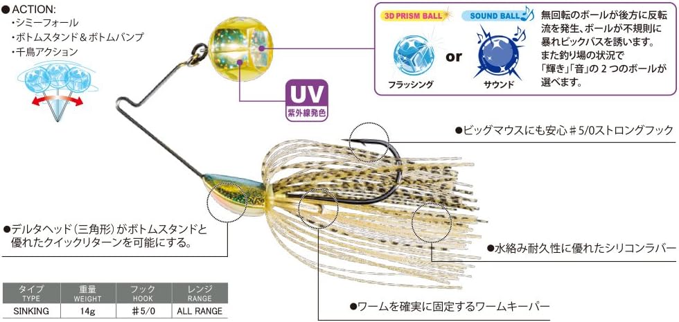 Questa nuova esca mai vista prima d'ora è estremamente versatile e può essere pescata come jig con un rimorchio in plastica morbida, come un'esca da spinner, e può anche essere utilizzata come esca. Disponibile in due finiture innovative, Prisma 3D o Painted Sound Ball che ha un'azione molto erratica che spinge grandi bassi selvaggi Dispone di una forte piega rotonda in nichel nero e una gonna morbida e resistente.