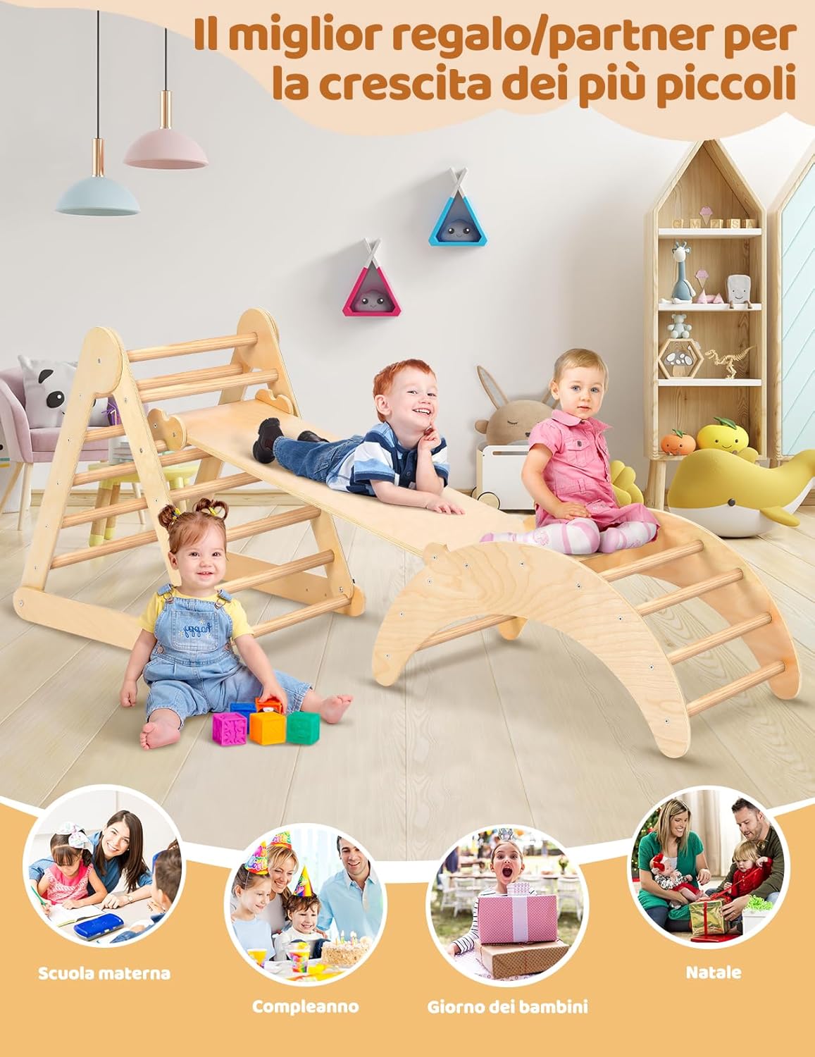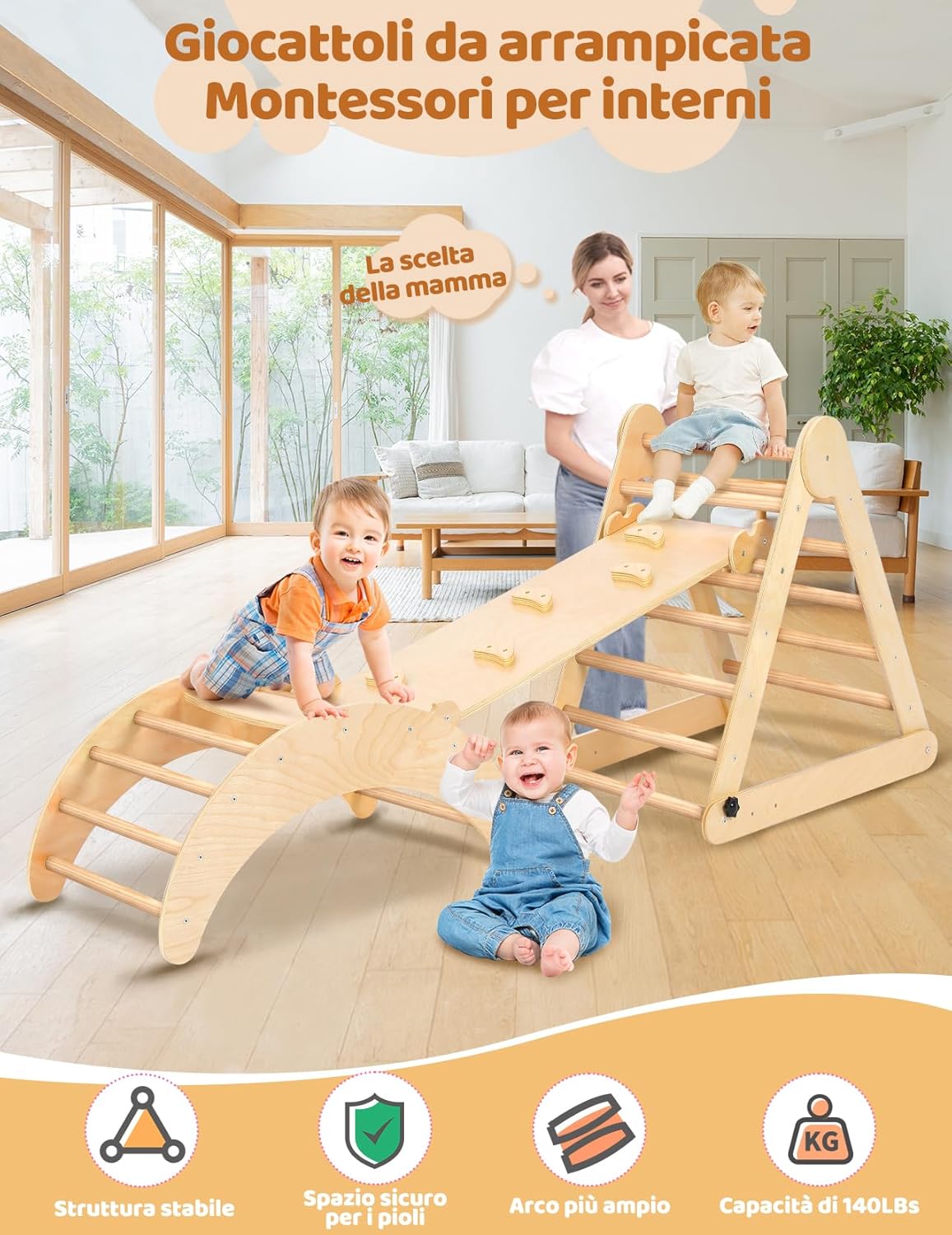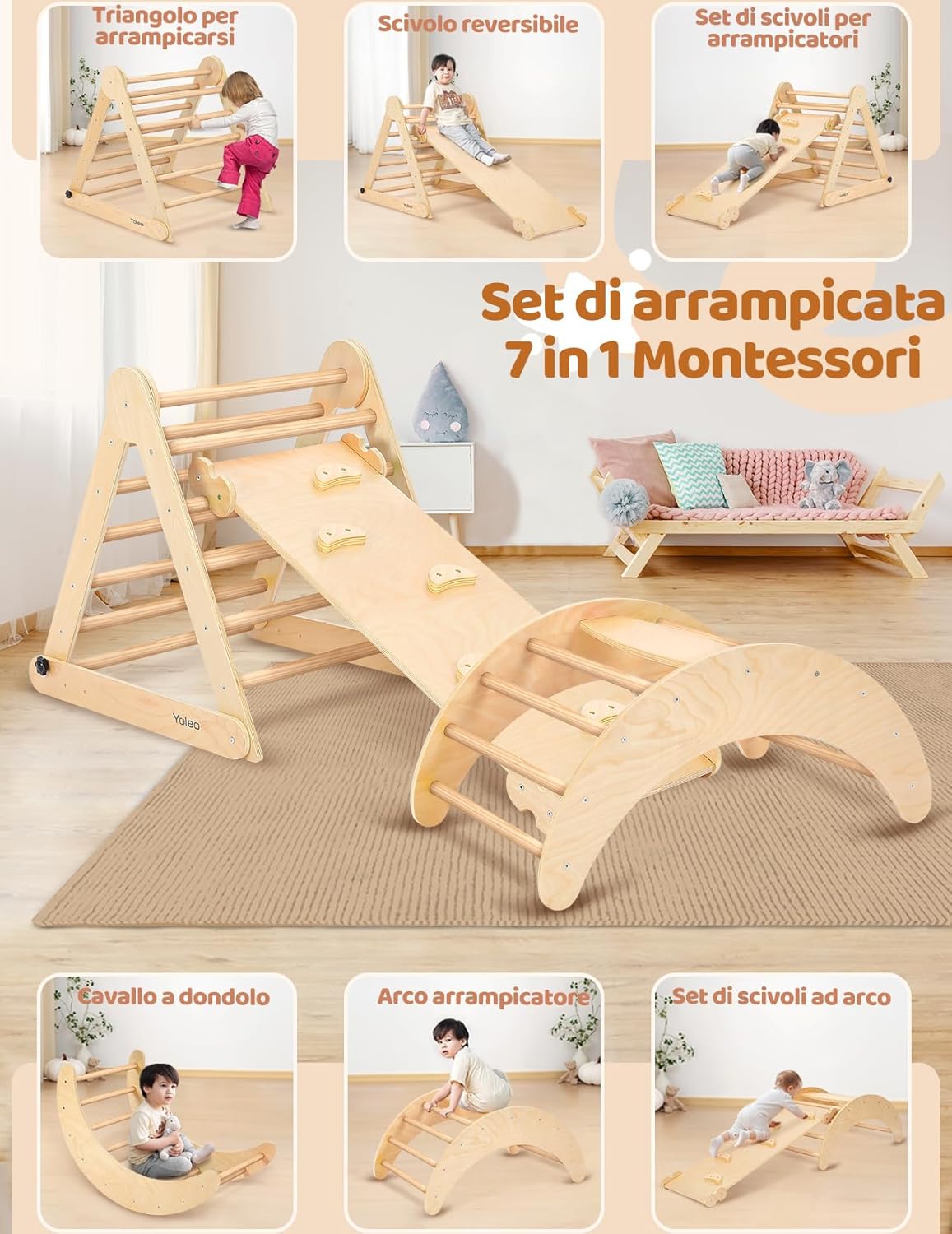PIÙ DI 7 COMBINAZIONI DI TRIANGOLO PIKLER: Questo set di triangoli per arrampicata è composto da 3 sezioni. Può essere utilizzato come triangolo o arco di arrampicata, sedia a dondolo, ponte di arrampicata, ecc. Diverse combinazioni porteranno divertimento e terranno i vostri piccoli lontani dallo smartphone. Inoltre, i giocattoli da arrampicata Montessori hanno lo scopo di potenziare le capacità sensoriali, imparare la consapevolezza del corpo e diventare più indipendenti SCIVOLO 2-IN-1 E ARCO MONTESSORIANO 3-IN-1: Lo scivolo offre due diverse esperienze di gioco. Un lato con rocce per afferrare e arrampicarsi, l'altro lato è levigato con superficie liscia per scivolare. L'arco di arrampicata è rinforzato con pannelli extra larghi sulla parte superiore, per garantire durata e sicurezza. Quando i bambini si stancano di arrampicarsi, la rampa può essere trasformata in un arco a dondolo o utilizzata come tunnel per giochi di fantasia STRUTTURA TRIANGOLARE STABILE CON SOLIDA BASE AD "H": Il set di arrampicata Montessori vanta un design unico, che garantisce una solida base per il gioco dei bambini. Inoltre, offre 3 livelli regolabili per l'angolo e l'altezza del triangolo, consentendo di personalizzare i livelli di sfida semplicemente regolando le viti nere inferiori. Capacità massima di peso 130 libbre, adatto a 2-3 bambini che giocano insieme DESIGN RAPIDO E PIEGHEVOLE, FACILE DA PIEGARE E RIPORRE: YOLEO triangolo arrampicatore offre un comodo design pieghevole rapido che consente di piegare e riporre facilmente. Questa caratteristica è particolarmente vantaggiosa per le mamme indaffarate che possono gestire senza sforzo il processo di piegatura e rendere facile per i genitori spostarlo all'interno o all'esterno. Quando non viene utilizzato, può essere comodamente ripiegato e riposto in un angolo MATERIALI PIÙ SPESSI E SOLIDI CON UNA LUCIDATURA SQUISITA: Realizzato in legno naturale di qualità superiore e vernice atossica, dopo centinaia di operazioni di lucidatura e levigatura, il set di arrampicata Yoleo pikler è più liscio, più forte, più sicuro e più durevole. Inoltre, la certificazione EN71 garantisce che questo set di arrampicata soddisfa i rigorosi standard di sicurezza dell'UE, fornendo ai genitori un punto di riferimento affidabile nella scelta dei giocattoli da arrampicata