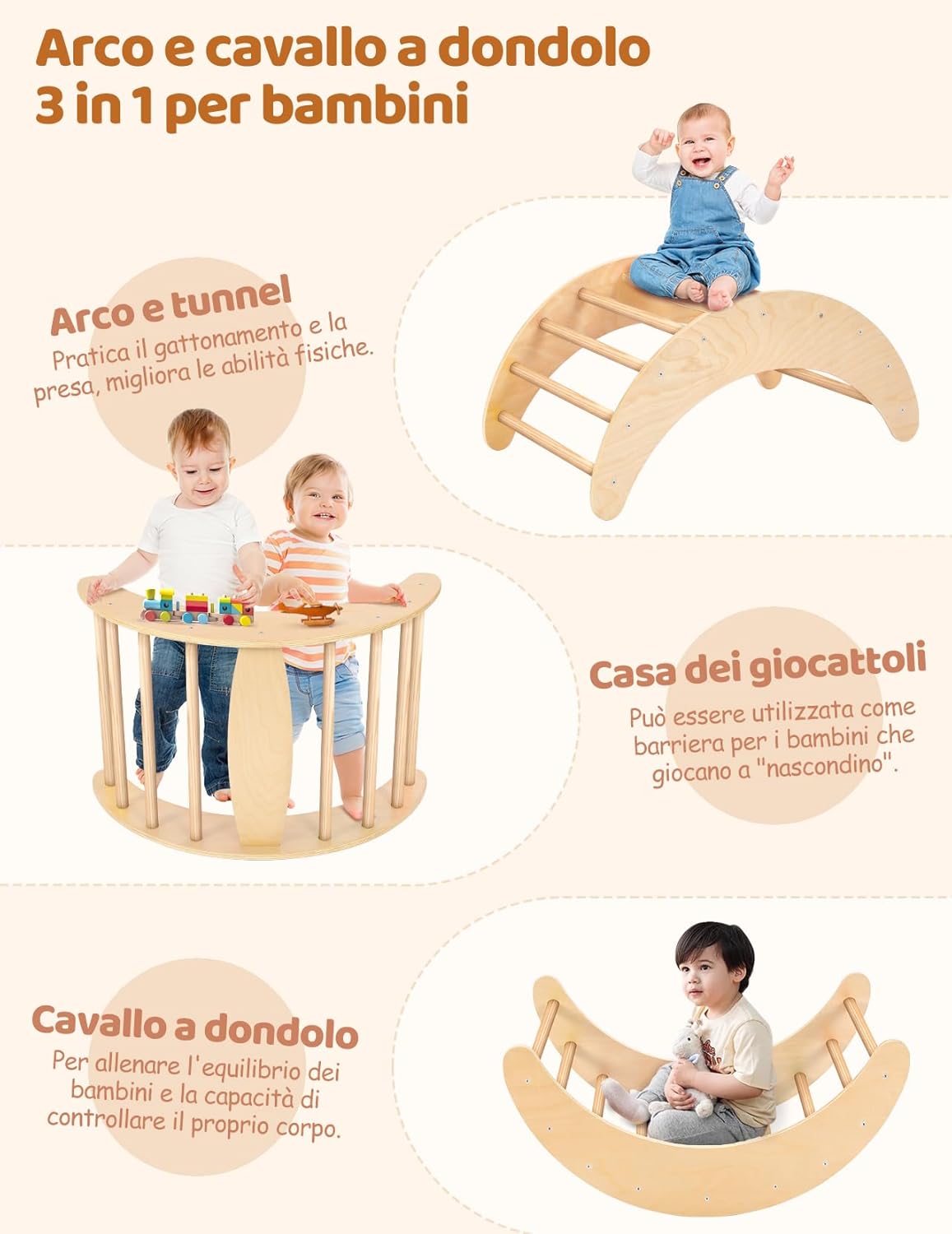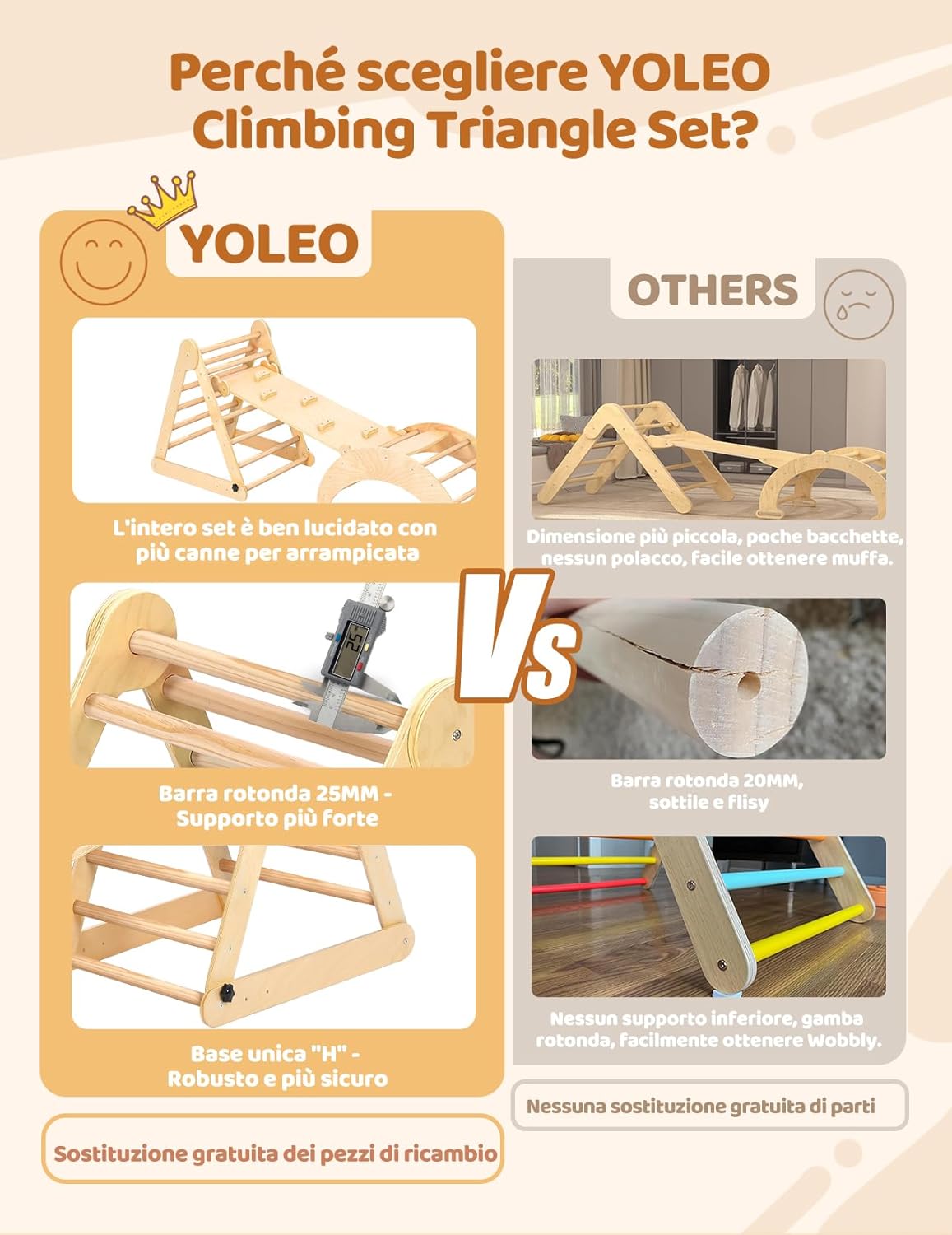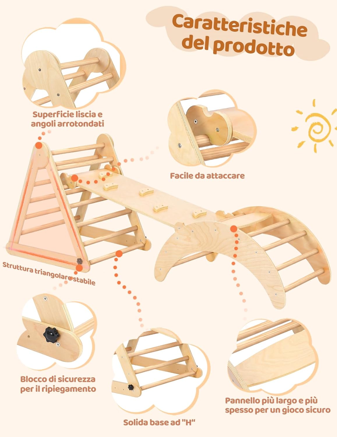 PIÙ DI 7 COMBINAZIONI DI TRIANGOLO PIKLER: Questo set di triangoli per arrampicata è composto da 3 sezioni. Può essere utilizzato come triangolo o arco di arrampicata, sedia a dondolo, ponte di arrampicata, ecc. Diverse combinazioni porteranno divertimento e terranno i vostri piccoli lontani dallo smartphone. Inoltre, i giocattoli da arrampicata Montessori hanno lo scopo di potenziare le capacità sensoriali, imparare la consapevolezza del corpo e diventare più indipendenti SCIVOLO 2-IN-1 E ARCO MONTESSORIANO 3-IN-1: Lo scivolo offre due diverse esperienze di gioco. Un lato con rocce per afferrare e arrampicarsi, l'altro lato è levigato con superficie liscia per scivolare. L'arco di arrampicata è rinforzato con pannelli extra larghi sulla parte superiore, per garantire durata e sicurezza. Quando i bambini si stancano di arrampicarsi, la rampa può essere trasformata in un arco a dondolo o utilizzata come tunnel per giochi di fantasia STRUTTURA TRIANGOLARE STABILE CON SOLIDA BASE AD "H": Il set di arrampicata Montessori vanta un design unico, che garantisce una solida base per il gioco dei bambini. Inoltre, offre 3 livelli regolabili per l'angolo e l'altezza del triangolo, consentendo di personalizzare i livelli di sfida semplicemente regolando le viti nere inferiori. Capacità massima di peso 130 libbre, adatto a 2-3 bambini che giocano insieme DESIGN RAPIDO E PIEGHEVOLE, FACILE DA PIEGARE E RIPORRE: YOLEO triangolo arrampicatore offre un comodo design pieghevole rapido che consente di piegare e riporre facilmente. Questa caratteristica è particolarmente vantaggiosa per le mamme indaffarate che possono gestire senza sforzo il processo di piegatura e rendere facile per i genitori spostarlo all'interno o all'esterno. Quando non viene utilizzato, può essere comodamente ripiegato e riposto in un angolo MATERIALI PIÙ SPESSI E SOLIDI CON UNA LUCIDATURA SQUISITA: Realizzato in legno naturale di qualità superiore e vernice atossica, dopo centinaia di operazioni di lucidatura e levigatura, il set di arrampicata Yoleo pikler è più liscio, più forte, più sicuro e più durevole. Inoltre, la certificazione EN71 garantisce che questo set di arrampicata soddisfa i rigorosi standard di sicurezza dell'UE, fornendo ai genitori un punto di riferimento affidabile nella scelta dei giocattoli da arrampicata