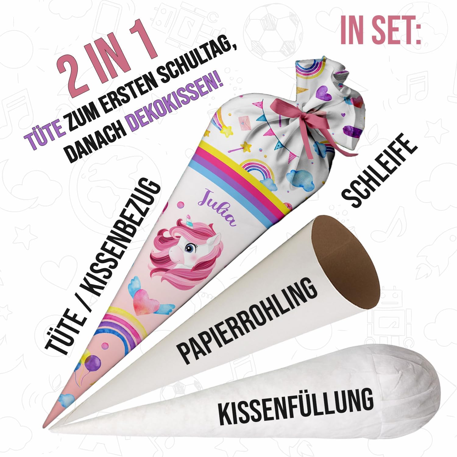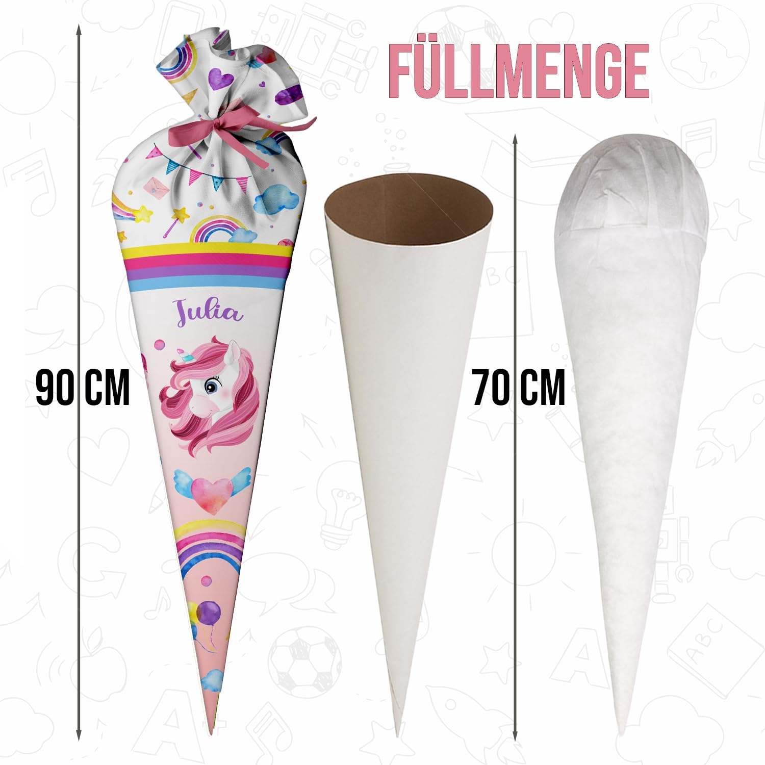 Il cono scolastico è realizzato in tessuto 100% poliestere. All'interno si trova un pezzo rotondo di cartone e un'imbottitura rimovibile in sfere di fibra cava di poliestere. Il tuo bambino potrà usare la borsa come cuscino più tardi! Rimetti semplicemente le palline di fibra cava, legala con un fiocco e il gioco è fatto. La borsa ha 70 cm da riempire (questa è anche quella grande per il cartoncino) + più tessuto nella parte superiore che puoi legare con un fiocco. Il nastro è incluso nel kit. Il colore dell'arco verrà inviato in modo casuale. La bustina di zucchero è personalizzata con il nome del bambino. Basta fare clic su "Personalizza ora", inserisci il tuo nome e aggiungi al carrello! Nel nostro negozio troverai gli accessori scolastici adatti affinché tuo figlio possa iniziare la scuola, ad es. cartelle, borse sportive e molto altro ancora