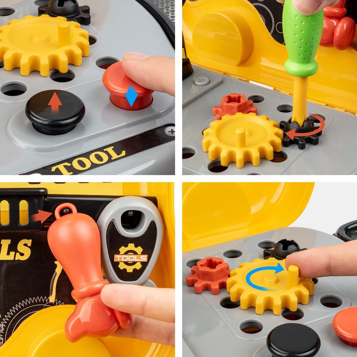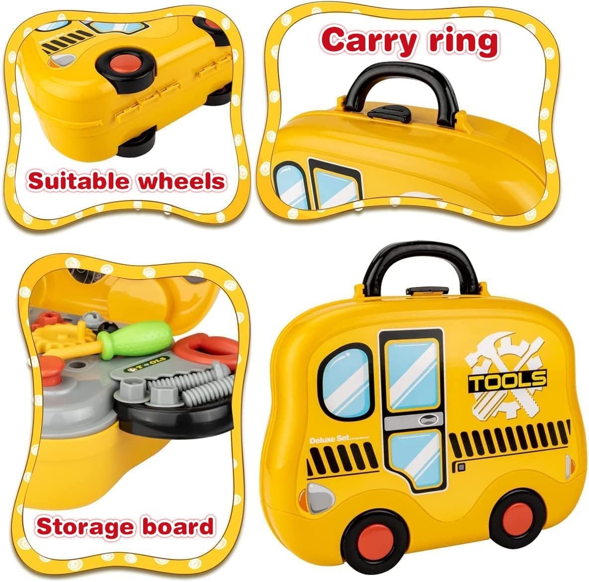 Non solo la cassetta porta attrezzi con 4 carrucole ma anche un banco da lavoro all'apertura. Gli strumenti giocattolo con apprendimento e divertimento possono incoraggiare tuo figlio a esplorare profondamente il lavoro dei falegnami. Può migliorare il loro spazio di immaginazione e la capacità di lavoro manuale e consente loro anche di apprendere le forme e il riconoscimento dei colori. Strumenti giocattolo tra cui chiavi inglesi, cacciaviti, seghe, martelli, ecc. Progettato per consentire ai bambini di acquisire esperienza pratica con gli strumenti. Questo è un buon giocattolo di apprendimento per i ragazzi a cui piace capire come funzionano le cose. Crediamo che questo strumento giocattolo sia il miglior regalo per i bambini dai 5 anni in su.