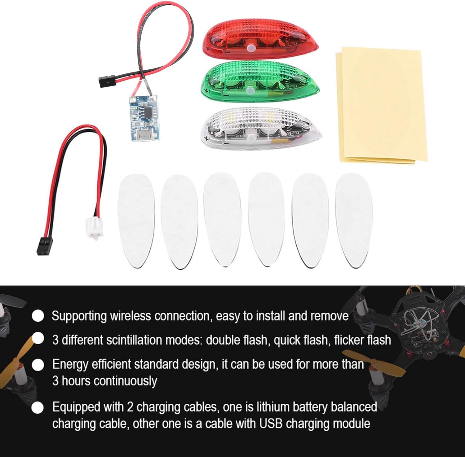 Forma a goccia d'acqua con design super aerodinamico, che rende il volo divertente È leggero, il che non aggiungerà ulteriore peso al drone Supporta la connessione wireless, facile da installare e rimuovere La luce a LED è luminosa e visibile, visibile in raggio di 500 metri, bella e resistente Le luci del drone sono progettate per l'ala fissa