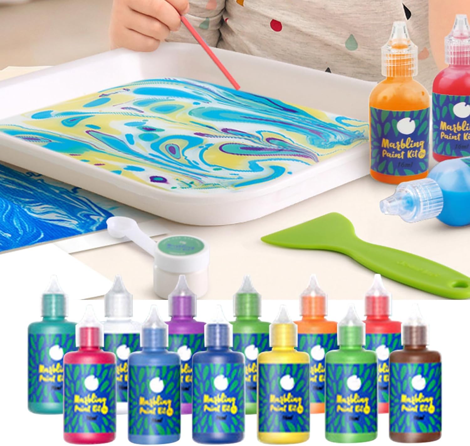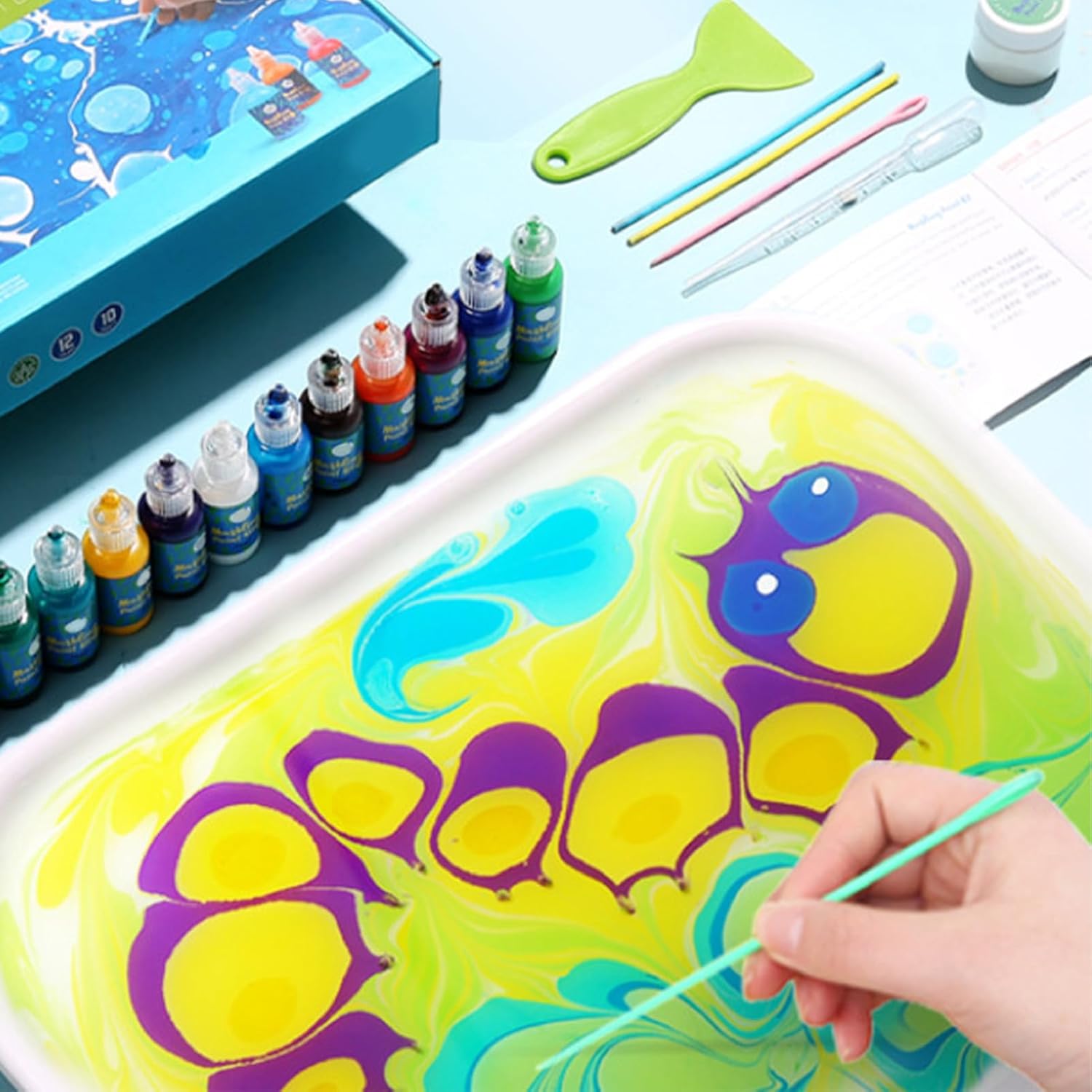 [Scuoti prima di dipingere] La vernice per l'arte dell'acqua offre una varietà di colori vibranti, quindi ricorda di scuotere la bottiglia di coloranti prima di iniziare il tuo capolavoro artistico. [Colori vibranti e design unici] Segui le istruzioni per creare motivi luminosi e colorati facendo roteare la vernice sull'acqua e trasferendola sulla carta. [Affascinante kit artistico di pittura ad acqua] Questa vernice marmorizzata affascina sia i bambini che gli adulti, rendendo la pittura un'attività divertente e coinvolgente. [Ogni occasione] Questo kit di verniciatura marmorizzato è un ideale per la famiglia e gli amici, una sorpresa creativa per Natale o compleanni e una preziosa fornitura d'arte per i bambini. [Facile da usare per tutte le età] Il kit di immersione Hydro è semplice e adatto a bambini di tutte le età e adulti, garantendo un'esperienza creativa piacevole.