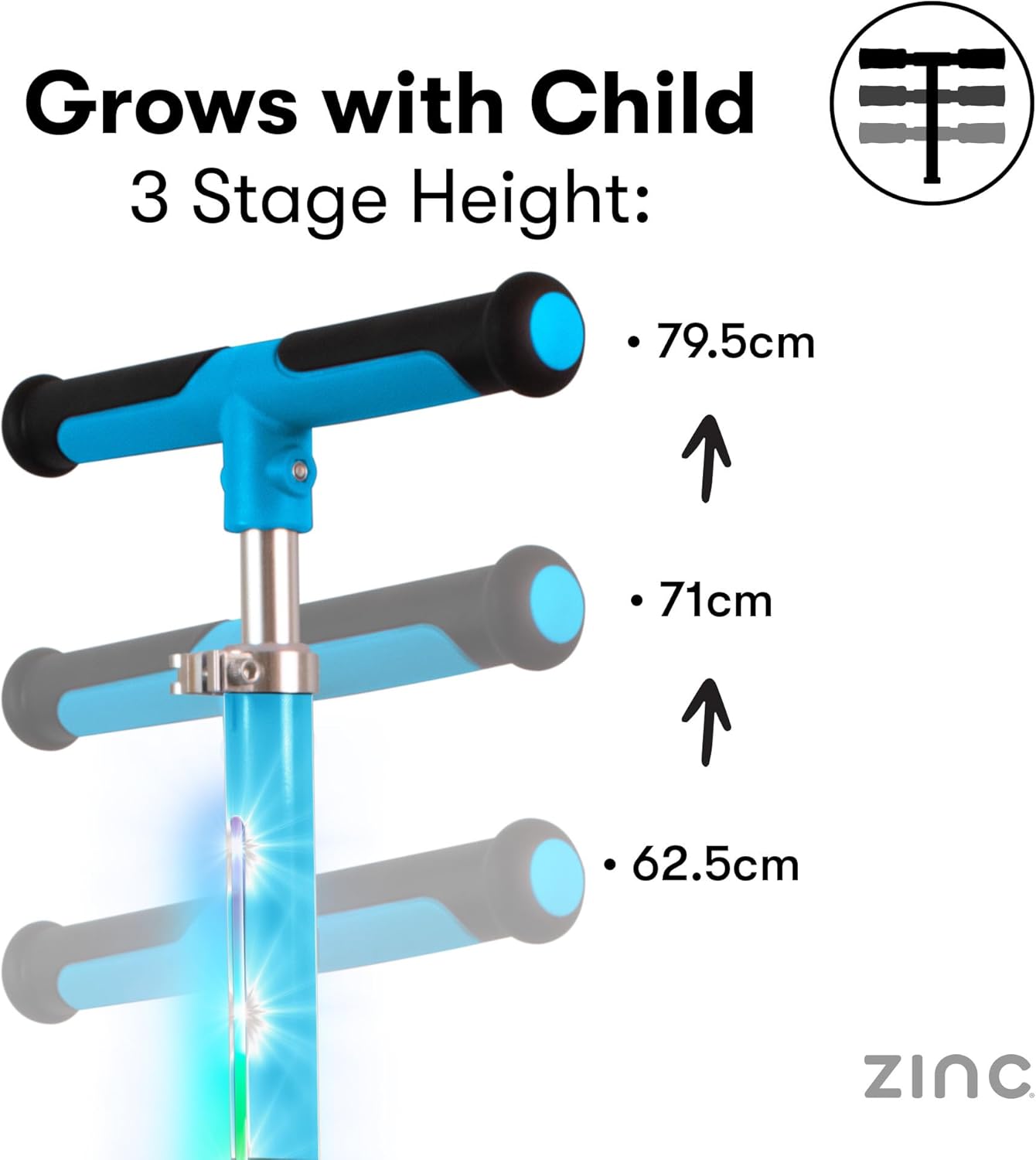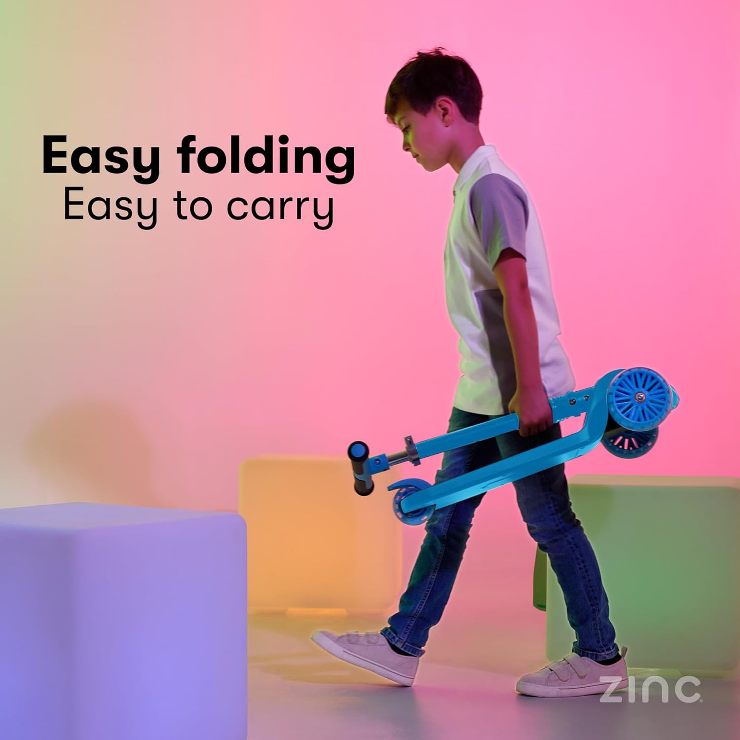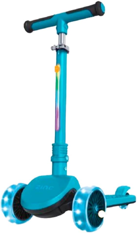 Manubrio regolabile per bambini in crescita: con tre opzioni di altezza regolabili (62,5 cm, 71 cm, 79,5 cm), il monopattino Zinc Shine cresce con il tuo bambino, fornendo comfort e controllo per i bambini di tutte le dimensioni. Perfetto per bambini dai 3 anni in su. Design stabile e fluido: il monopattino Zinc Shine è dotato di due grandi ruote anteriori da 120 mm e una ruota posteriore da 80 mm per una maggiore stabilità e una guida fluida. La pedana antiscivolo garantisce uno scooter sicuro e sicuro, sia a casa che al parco. Pieghevole e portatile per divertimento in viaggio: il meccanismo di piegatura facile del monopattino Zinc Shine lo rende perfetto per le famiglie in movimento. Compatto e comodo da trasportare, è ideale per gite al parco, vacanze o semplicemente per riporre a casa. Ruote a LED senza batteria per un divertimento extra: illumina la guida del tuo bambino con le ruote LED luminose senza batteria di Zinc Shine. Ogni giro e movimento crea uno splendido display luminoso, rendendo ogni scoot un'avventura accattivante, giorno o notte. Attacco luminoso con 20 funzioni di luce abbagliante: lo scooter Zinc Shine dispone di un attacco luminoso con 20 funzioni di luce personalizzabili, alimentato da 3 batterie AA (non incluse). Illumina le strade con colori e motivi vivaci, perfetto per le passeggiate serali.