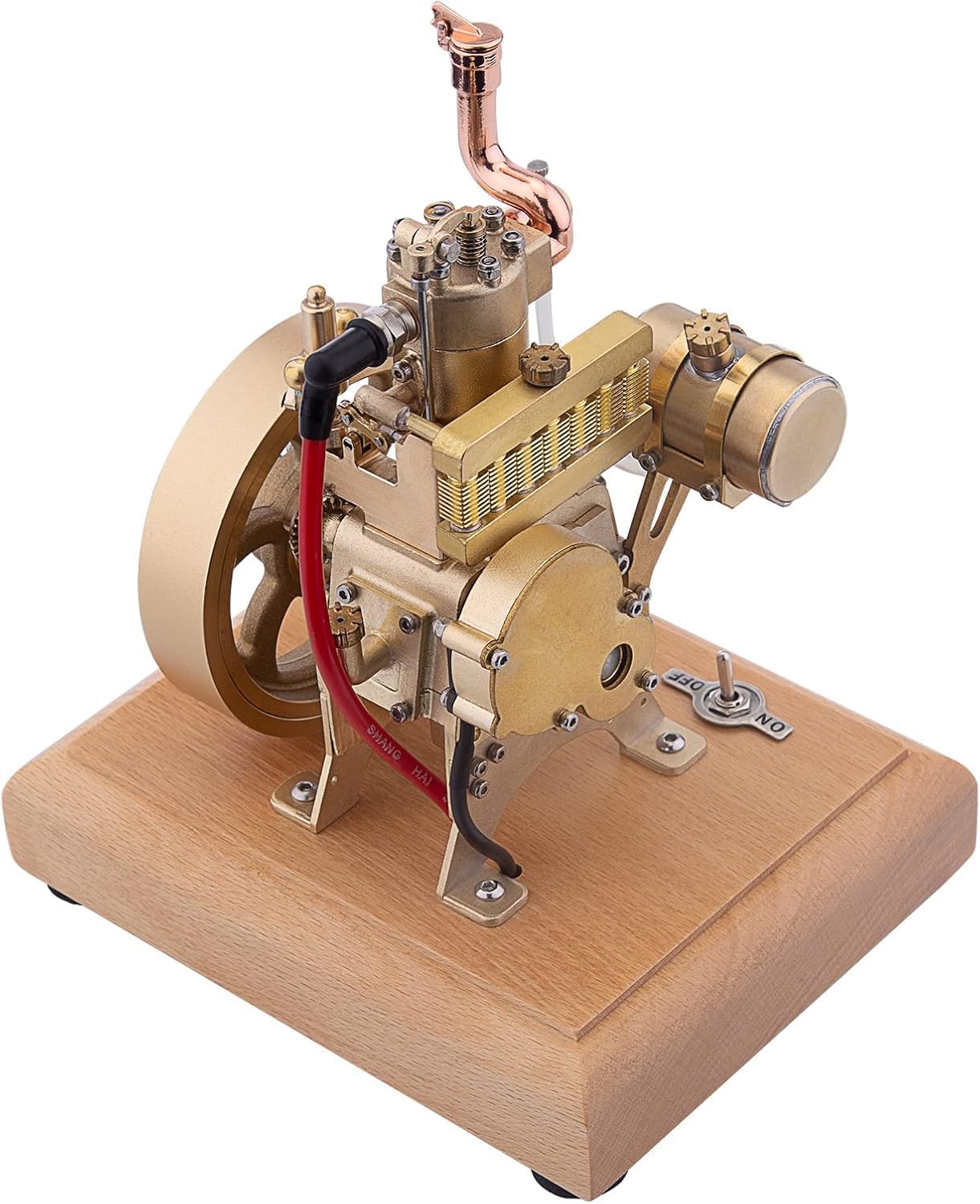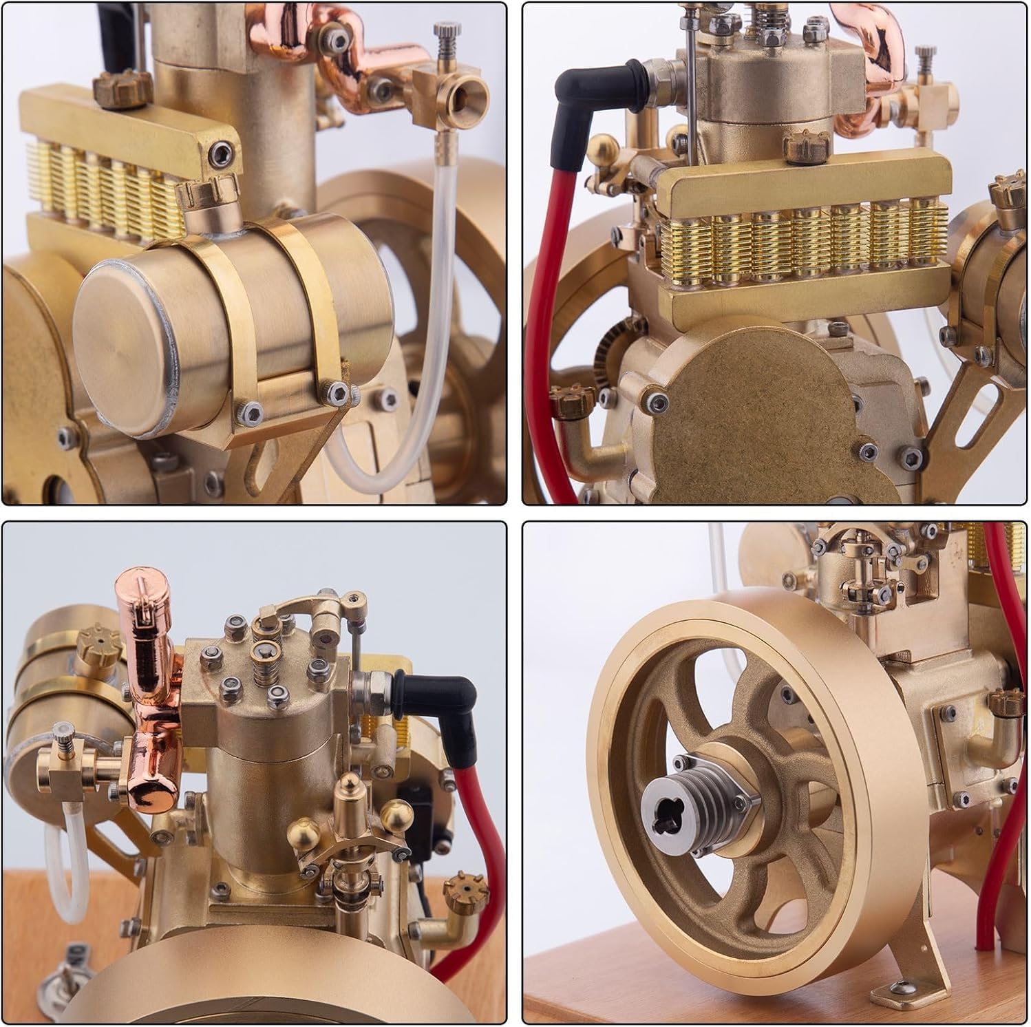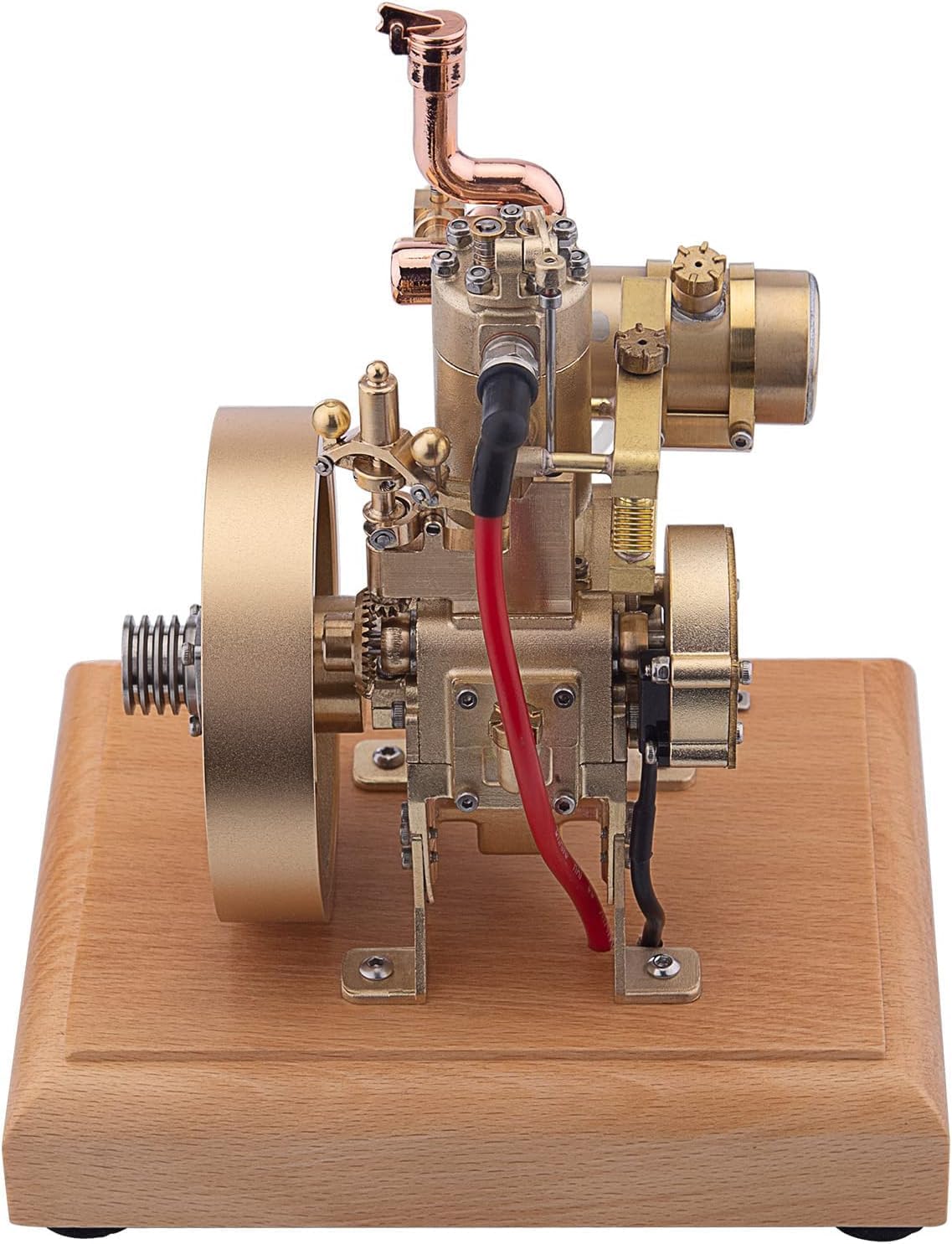Mini motore: questo motore monocilindrico verticale raffreddato ad acqua, realizzato in ottone e acciaio inossidabile, è dotato di una base in legno per un facile posizionamento e movimentazione. È dotato di un meccanismo di limitazione della velocità e di un radiatore, che garantisce funzionalità ed estetica. Squisita fattura: questo motore per modelli desktop mostra un'eccellente fattura, producendo un'onda sonora emozionante durante il funzionamento, aggiungendo al fascino dei suoi meccanismi meccanici. Le sue prestazioni sono senza compromessi e saranno apprezzate dagli appassionati. Metodi di avviamento del motore: in primo luogo, controllare il circuito del motore dalla base in legno e collegare il tubo del carburante del serbatoio. Quindi, installare 3 batterie AA (4,5 V) per l'alimentazione. Quindi, riempire il serbatoio con benzina 95#. Ruotare il volano in senso orario sul lato destro del motore per consentire al carburante miscelato di entrare nel cilindro. Assicurarsi che non ci sia aria nel tubo del carburante. Infine, accendere l'inte NOTA: Se l'accensione e la compressione del cilindro vanno bene ma il motore non si avvia, potrebbe essere necessario regolare lo spillo del carburatore. Dopo aver serrato lo spillo dell'olio principale sul carburatore, allentare l'anello da 1/4 e avviare il volano per garantire il corretto rapporto di miscela di benzina e aria. Ricordarsi di spegnere l'interruttore di alimentazione quando la macchina non è in uso. Regalo perfetto per il modello: questo storico motore vintage non è solo un'aggiunta perfetta per gli appassionati di modellismo e i collezionisti nel tempo libero, ma anche un eccellente regalo personalizzato per gli appassionati di meccanica in occasioni come compleanni e Natale. È adatto dai 14 anni in su.
