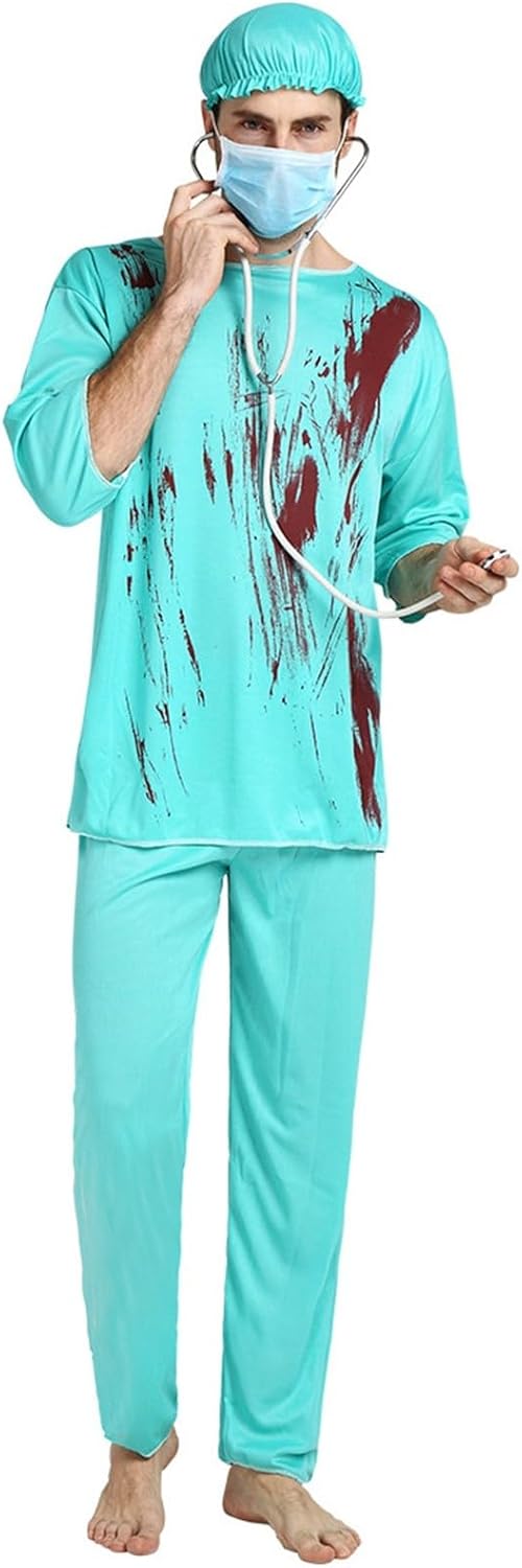 Costume da zombie da dottore da uomo, in tessuto ricco di dettagli, con top e pantaloni, maschera medica, spaventoso, adatto per Halloween, carnevale, feste spaventose
