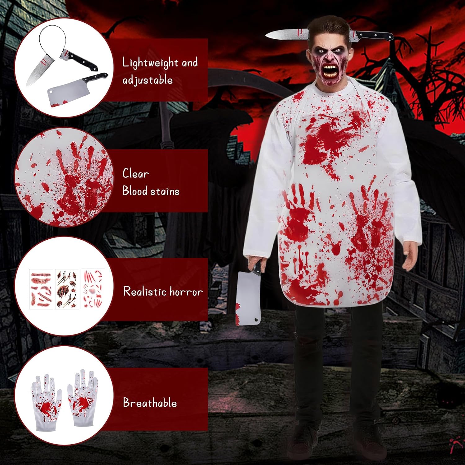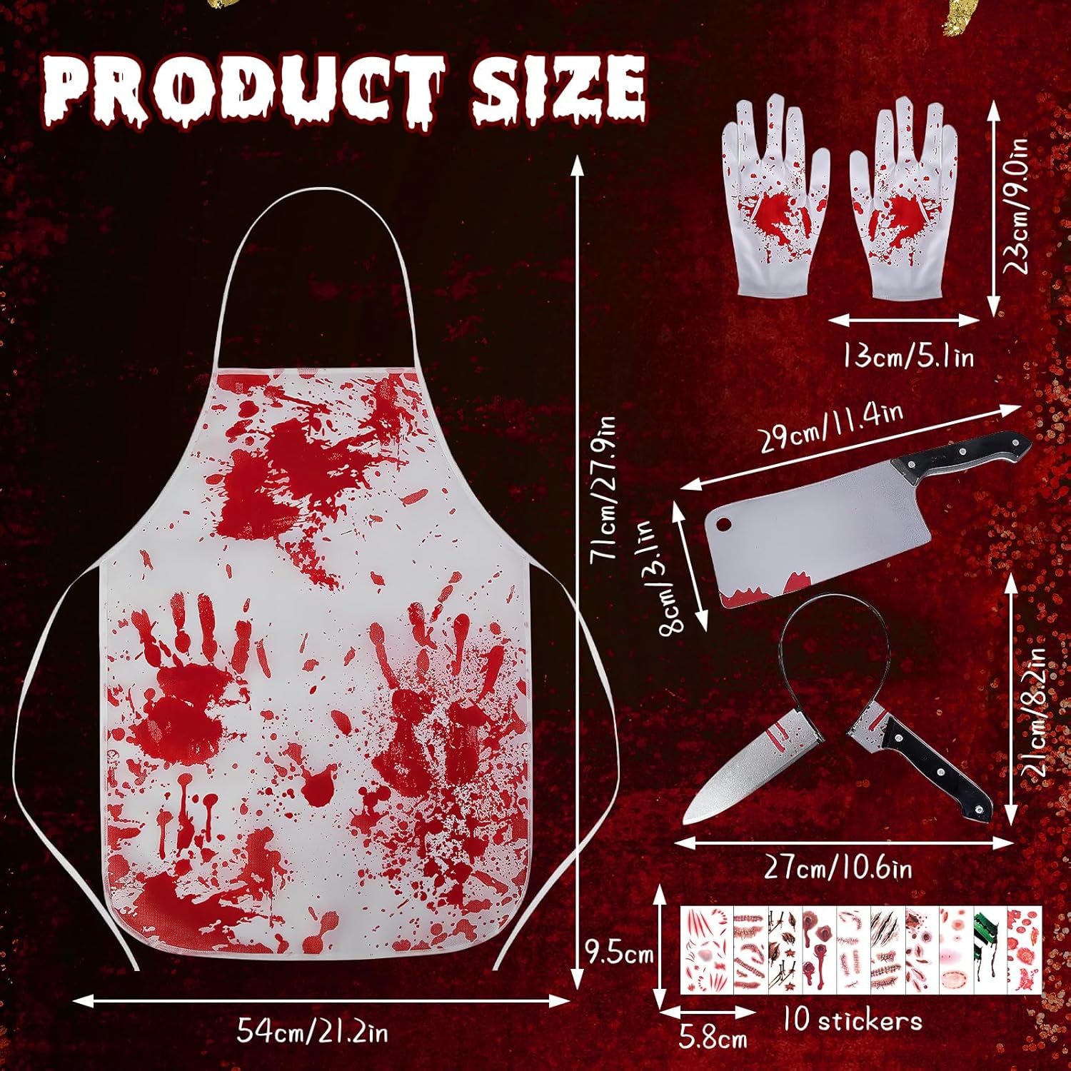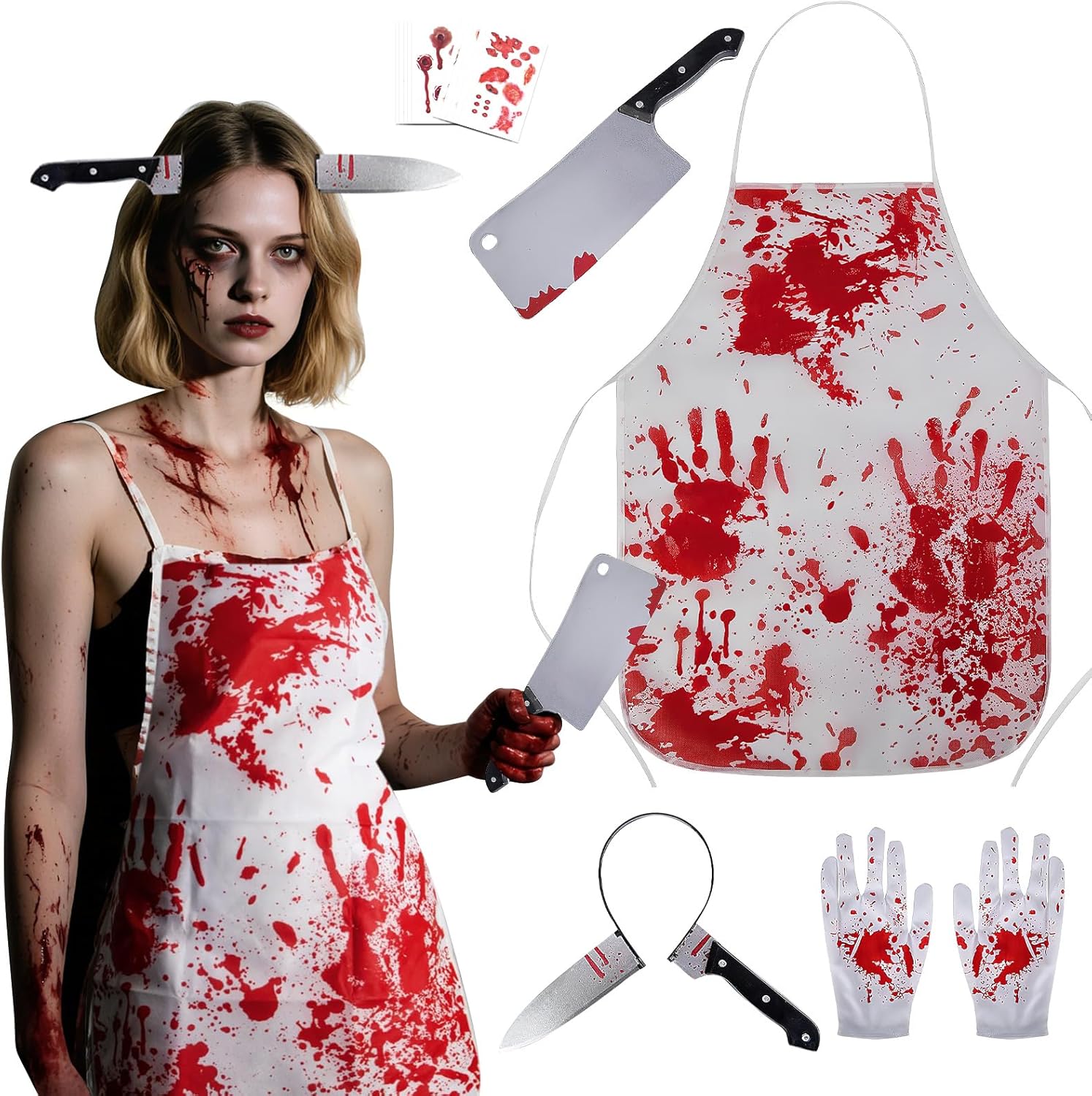 Descrizione prodotto ZoneYan Grembiule di Halloween, Costume da Macellaio con Guanti Mannaia, Grembiule Insanguinato, Coltello Testa Fascia, Adesivi per Tatuaggi Horror, per Festa di Halloween Carnevale Cosplay Con questo spaventoso e sanguinante set da macellaio, sarai al centro dell'attenzione alla tua festa di Halloween! Il nostro set, accuratamente progettato, include tutto il necessario per creare senza sforzo un look horror professionale. Che si tratti di una festa a tema, di una casa stregata o di fare scherzi, questo set garantirà divertimento senza fine e urla a non finire! 🔥 Caratteristiche: Design horror realistico: il grembiule e i guanti insanguinati presentano motivi realistici con macchie di sangue, mentre il copricapo tempestato di coltelli crea un effetto visivo sorprendente. Con 10 adesivi 3D con tatuaggi a cicatrice, puoi facilmente creare un effetto cinematografico e sanguinante e completare il tuo look spaventoso. Materiale sicuro e confortevole: il grembiule e i guanti sono realizzati in morbido poliestere traspirante per un comfort ottimale. Il coltello e il copricapo sono realizzati in plastica ecologica con una superficie liscia e senza bordi per un'applicazione senza problemi. Adatto alla maggior parte delle persone: il grembiule da macellaio insanguinato misura 71 cm x 54 cm (circa 28 x 21 pollici) ed è dotato di cinghie regolabili, che lo rendono adatto a uomini, donne e adolescenti di tutte le taglie. Durevole e facile da rimuovere: i tatuaggi con cicatrici aderiscono saldamente e durano dai 3 ai 7 giorni (a seconda del tipo di pelle e del livello di attività). Possono essere facilmente rimossi con una salvietta imbevuta di alcol o uno struccante senza lasciare residui o danneggiare la pelle. 📏 Specifiche: Colori: Bianco, Rosso Dimensioni grembiule: 71 x 54 cm (circa 28 x 21 pollici) Dimensioni coltello da cucina: 8 x 29 cm Dimensioni coltello fascia: 27 x 21 cm Dimensioni tatuaggio: 5,8 x 9,5 cm Dimensioni guanto: 23 x 13 cm Materiale grembiule: Tessuto non tessuto Materiale fascia: Plastica ABS Materiale mannaia: Plastica ABS Materiale guanto: Poliestere Materiale tatuaggio: Adesivi medici a base d'acqua 📦Contenuto della confezione: 1 Macellaio sanguinario grembiule 1 fascia per capelli di Halloween con coltello in testa 1 mannaia 1 paio di guanti insanguinati 10 tatuaggi con cicatrici ⚠️Note: Questo prodotto è destinato esclusivamente all'uso come costume e intrattenimento durante le feste. Evitare di utilizzarlo durante la guida o di notte per evitare malintesi. Tenere il tatuaggio fuori dalla portata dei bambini. Si consiglia di testare il tatuaggio su una piccola area del braccio prima dell'uso. In caso di reazione allergica, interrompere immediatamente l'uso. Sebbene il coltello sia di plastica, non agitarlo né puntarlo verso gli occhi per evitare lesioni. Il grembiule è lavabile a mano e deve essere appeso ad asciugare al riparo dalla luce solare diretta. Gli altri accessori devono essere puliti con un panno umido e conservati in un luogo fresco e asciutto. Avviso di sicurezza Nessun avvertimento applicabile