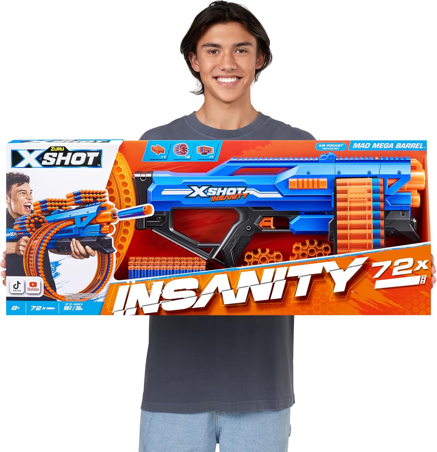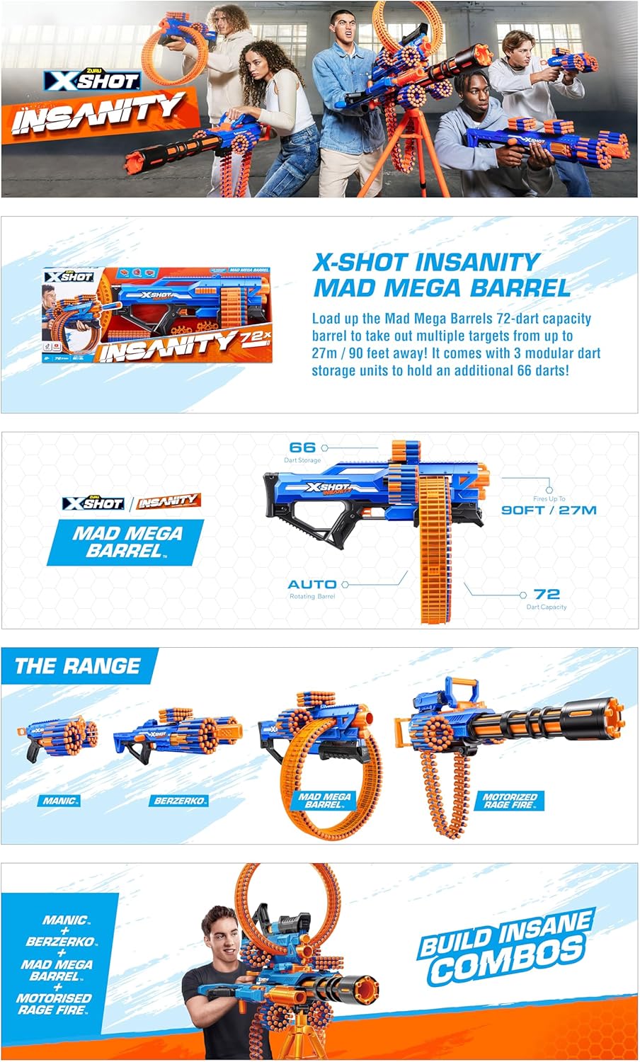 72 Dart Barrel: il Mad Mega Barrel ha una capacità di 72 freccette follemente grande. È così grande che è pazzo! Potenza di tiro: Avere una battaglia folle e distruggere avversari fino a 27m / 90 piedi di distanza con questo potente blaster! Archiviazione freccette: carica il mad Mega Barrel Blaster con 66 freccette aggiuntive con le 3 unità modulari di archiviazione per freccette. Freccette con tecnologia Air Pocket: include 72 freccette con tecnologia Air Pocket per un'esplosione ulteriore, veloce e più precisa! Insane Blaster: Lasciati stupire dalla X-Shot Insanity Mad Mega Barrel Blaster. Combina il Mad Mega Barrel con altri Insanity Blaster per creare il blaster più EPIC che tu abbia mai visto!