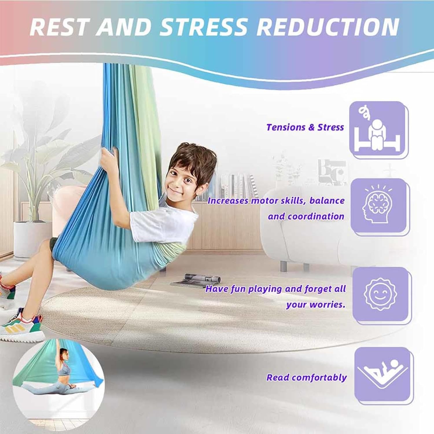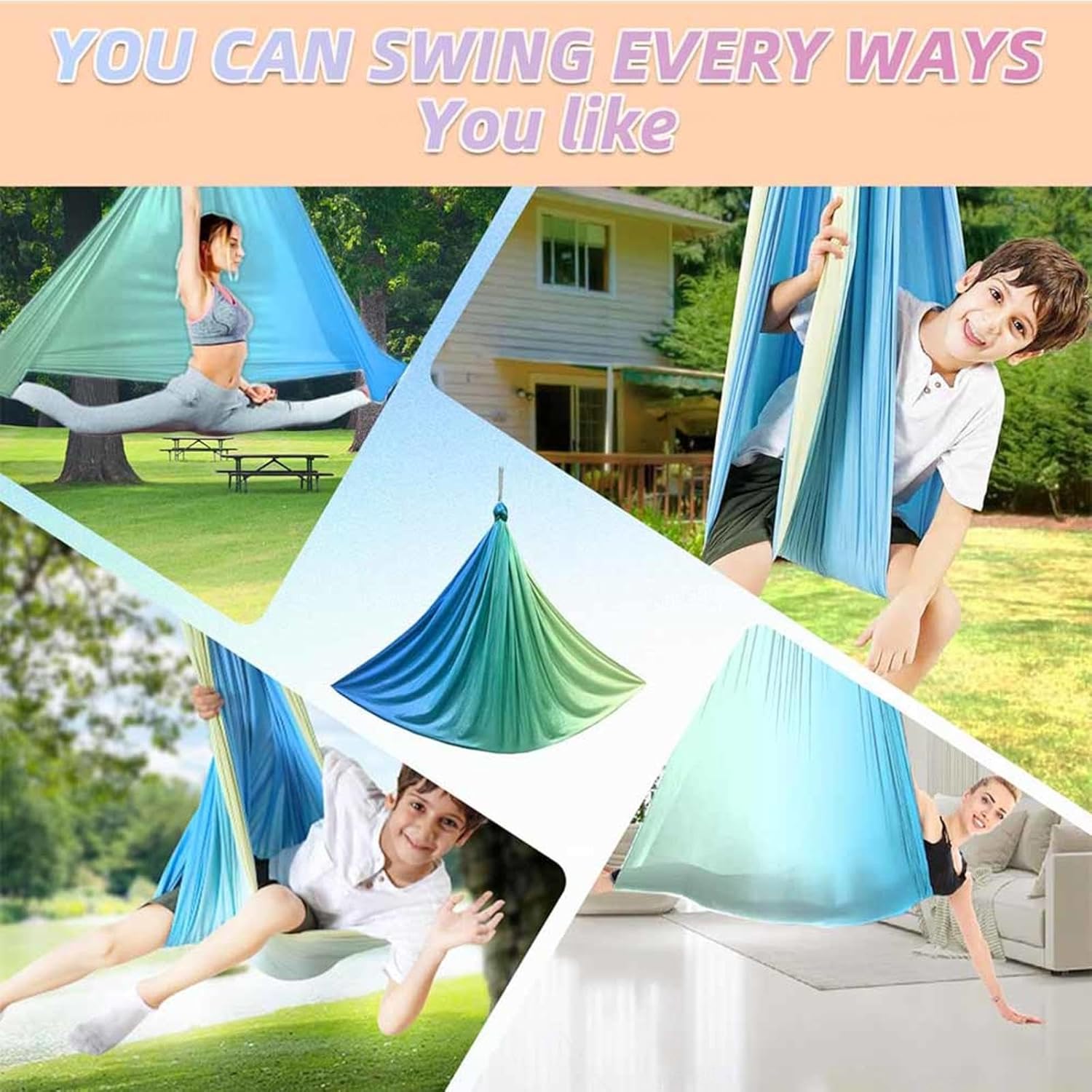 【Asciugamano da altalena】 I nostri asciugamani da altalena sono progettati per promuovere la consapevolezza del corpo dei bambini. Forniscono feedback aggiuntivi per diverse parti del corpo e sono particolarmente utili per i bambini con disturbi di elaborazione e capacità di pianificazione motoria. Inoltre, supportano lo sviluppo della consapevolezza spaziale e corporea. 【Materiale Premium】 Asciugamano da altalena realizzato in Lycra rinfrescante di alta qualità: traspirante, elastico e delicato sulla pelle. Il morbido tessuto avvolge il corpo come una seconda pelle, donando sollievo senza costringere. 【Multifunzionale】Sedia sospesa per interni ideale per la terapia di integrazione del tessuto altalena, per il relax a casa o come ausilio al movimento. Promozione ludica della pianificazione motoria e della percezione corporea. 【Antiscivolo e facile da montare】 Questi calzini integrali per bambini sono antiscivolo e sicuri, sono dotati di accessori completi, sono facili da montare e lavabili in lavatrice. 【Divertimento ed 𝐒esperienza interna】Sono progettati per creare un nuovo posto in cui i bambini possano giocare e rilassarsi divertendosi e 𝐒impressioni interiori si combinano. Può dare ai bambini un effetto simile ad un abbraccio e una sensazione di sicurezza