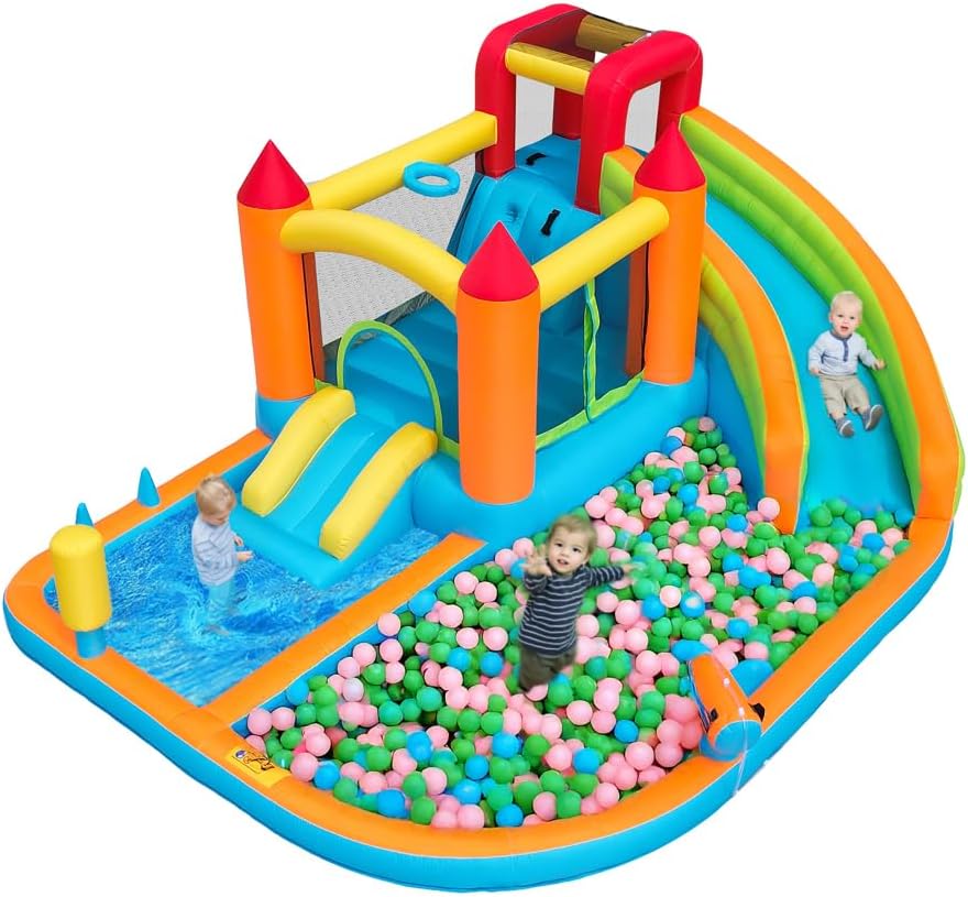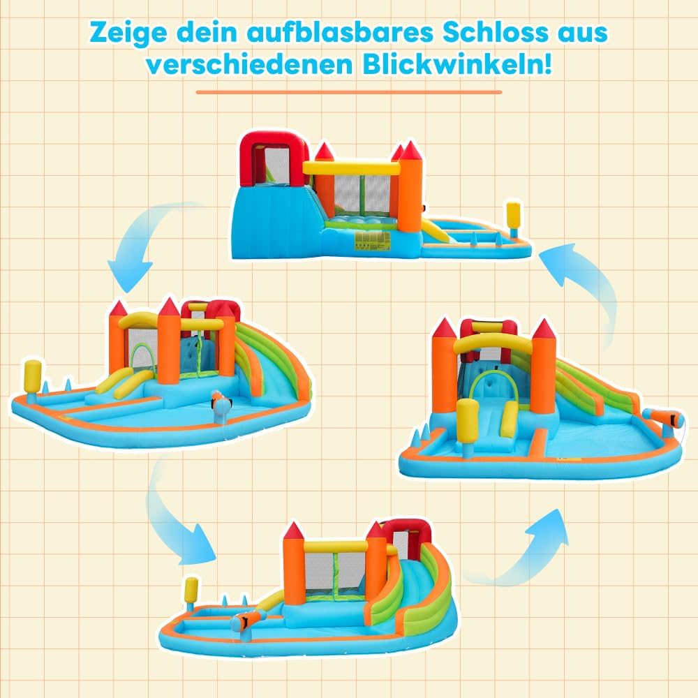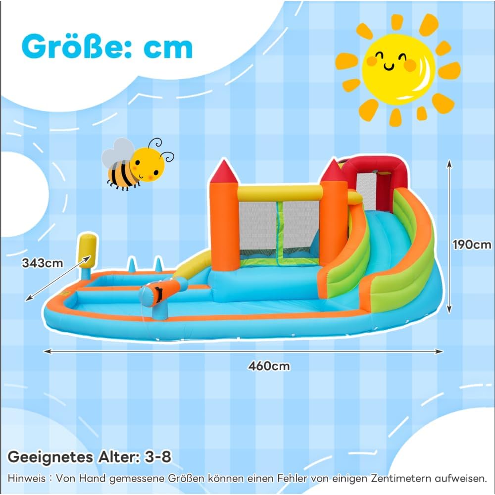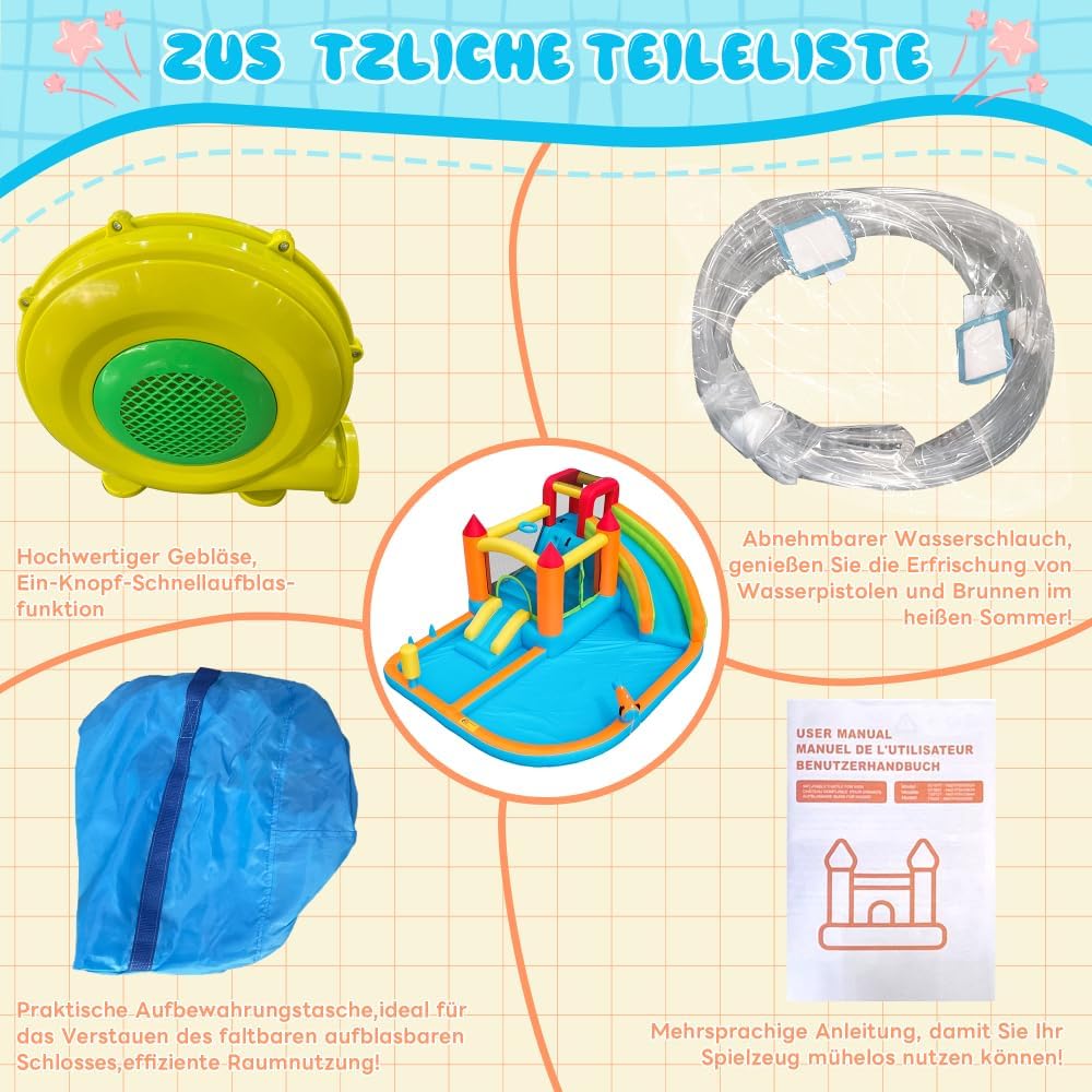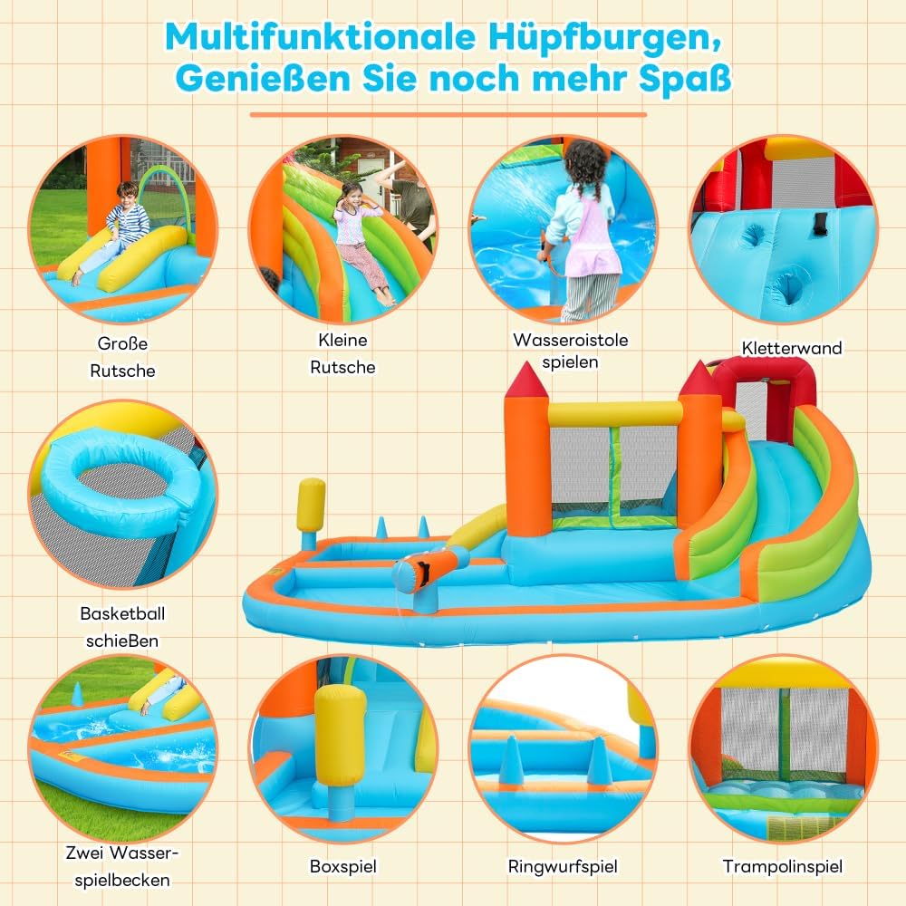 【Design di gioco multifunzionale】: include scivolo acquatico, trampolino, canestro da basket, pistole ad acqua, parete da arrampicata, pali da gioco di boxe, pali da gioco di lancio dell'anello e altro per soddisfare le diverse esigenze di gioco dei bambini. 【Adatto per l'uso asciutto e bagnato: in estate può essere collegato a un tubo da giardino per consentire i giochi d'acqua e fornire freschezza; negli altri periodi dell'anno può essere utilizzato come un normale gonfiabile, adatto a tutte e quattro le stagioni. 【Tessuto Oxford impermeabile di alta qualità】: realizzato in tessuto Oxford impermeabile ecologico e durevole, resistente agli strappi, sicuro ed ecologico, con una lunga durata. 【Gonfiaggio rapido】: contiene un ventilatore da 450 W di alta qualità che gonfia il gonfiabile in pochi minuti: comodo e fa risparmiare tempo. 【Certificazione di sicurezza】: certificato professionalmente EN-71, i materiali e il design sono conformi agli standard di sicurezza dei giocattoli per bambini, offrendo ai genitori tranquillità.