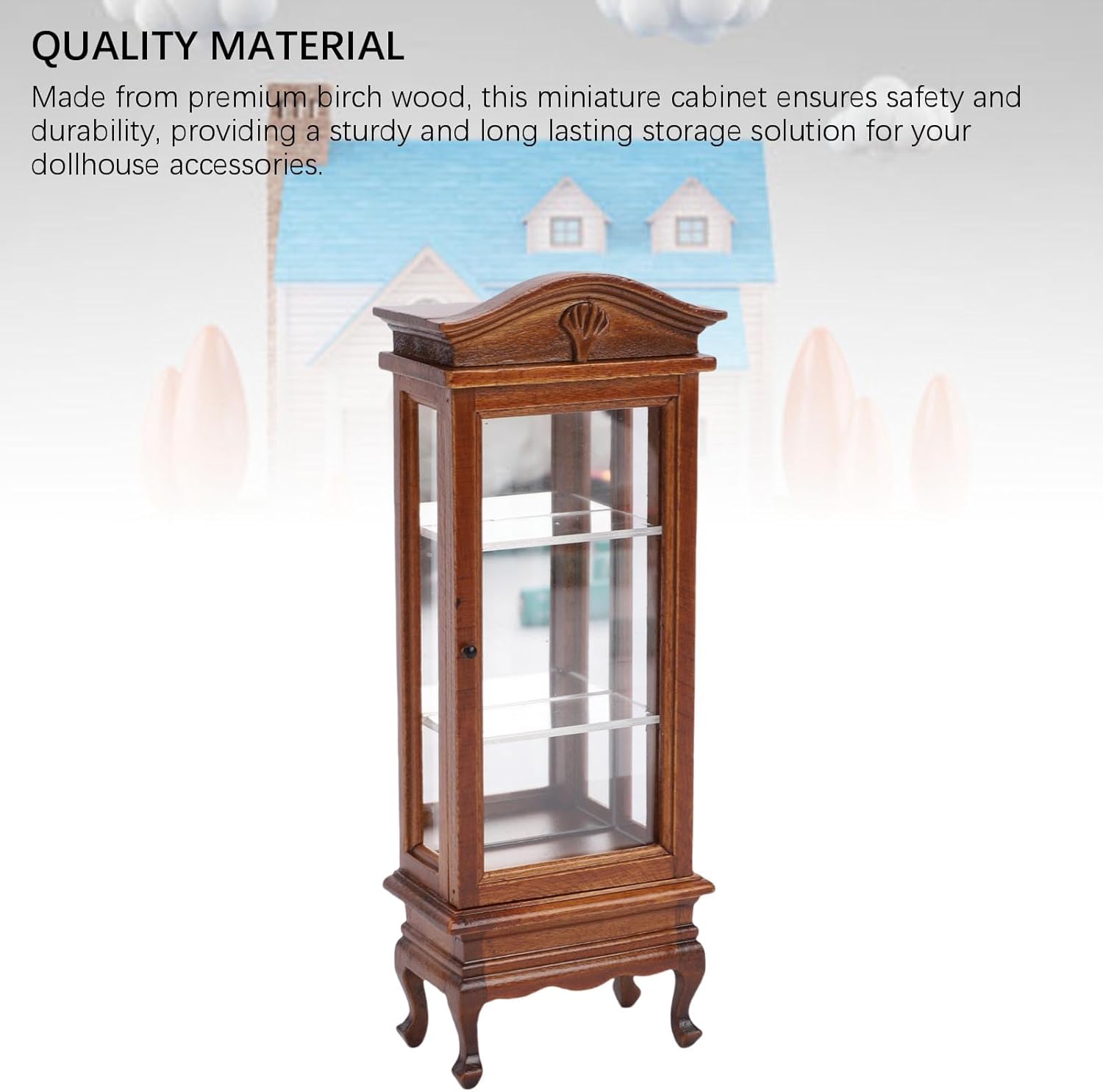 Legno di betulla: realizzato in legno di betulla, questo armadio garantisce sicurezza e durata per lo stoccaggio di lunga durata di accessori per la casa delle bambole. Dettagli squisiti: con alto realismo e dettagli intricati, questo scaffale di visualizzazione in miniatura migliora il fascino visivo della tua casa delle bambole. Elegante Design dell' Top: il Top Arch distintivo offre funzionalità sia di visualizzazione che di stoccaggio, aggiungendo un tocco elegante all'arredamento della casa delle bambole. Design ridimensionato realisticamente: questo mobile in miniatura per mobili per la casa delle bambole è perfettamente ridimensionato per le Box/Cover delle bambole 1:12, migliorando la tua esperienza di gioco. Uso versatile: servire come giocattolo e un display decorativo, creando un'atmosfera vivace e opzioni di gioco in espansione nella tua casa delle bambole.