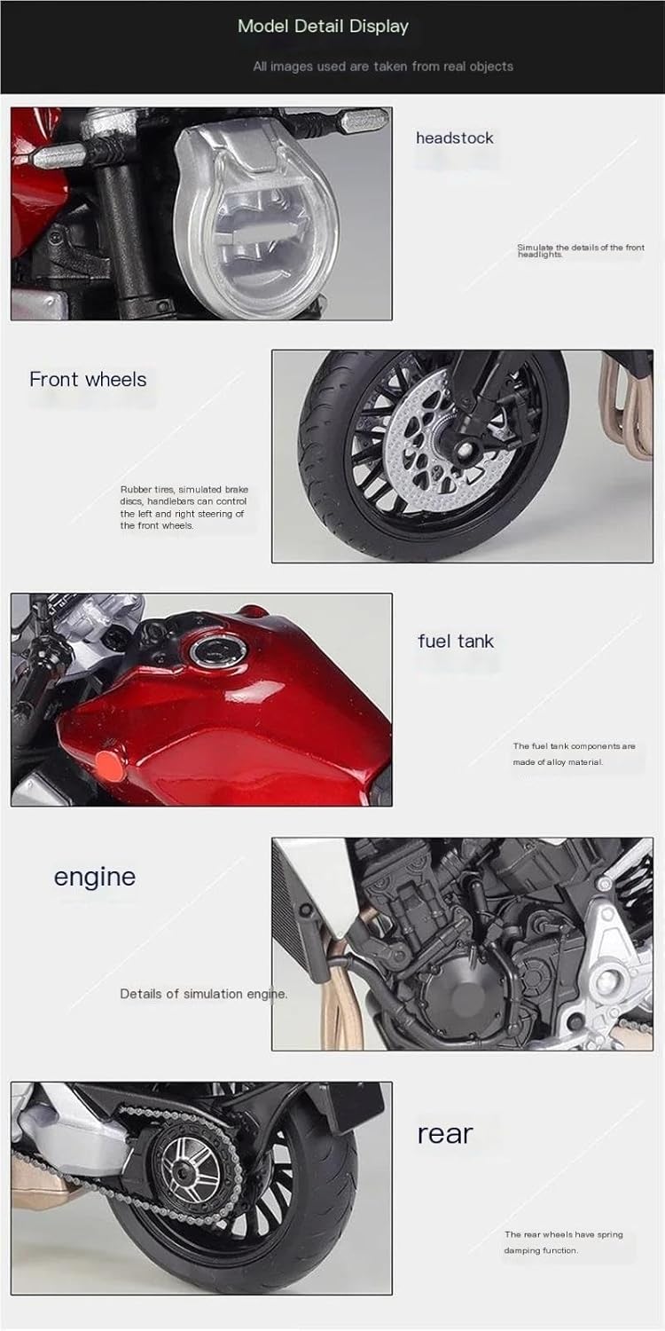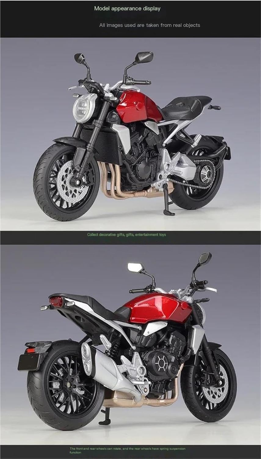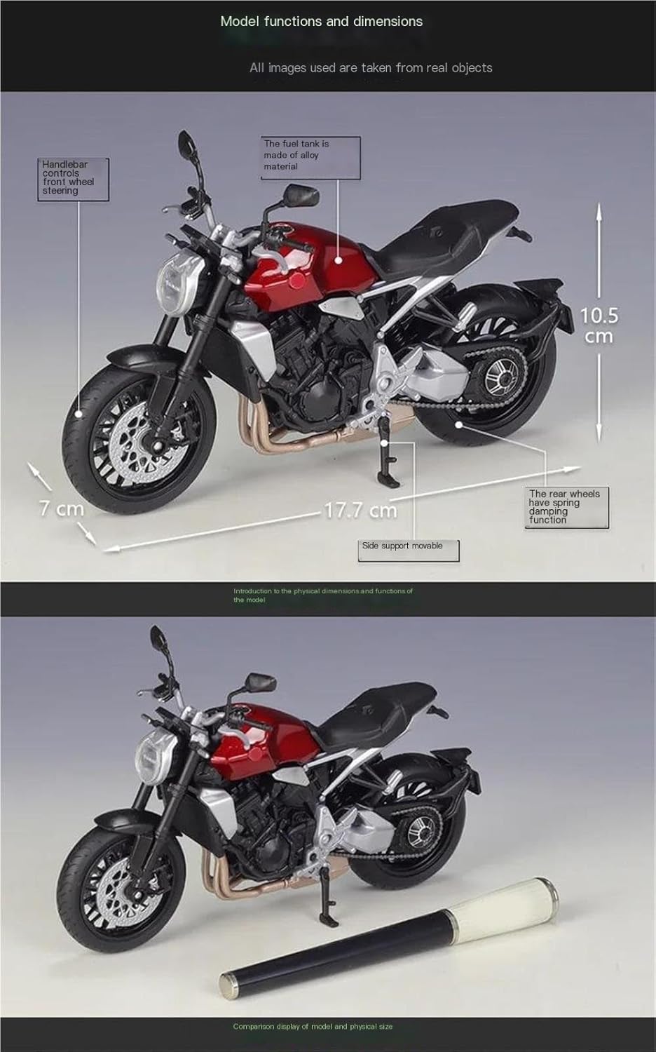Modello di motocicletta per CB1000R CB 1000 R Modelli di motociclette giocattolo in scala 1:12, la ruota anteriore e il manubrio possono oscillare da un lato all'altro, cavalletto mobile, sospensione posteriore a molla Il modello di motocicletta è un modello squisito realizzato in stretta conformità con la forma, la struttura, il colore, gli interni e altre proporzioni del veicolo originale. È un modello in miniatura del veicolo originale ed è progettato per riprodurre l'aspetto del veicolo originale. La finitura liscia e senza sbavature e la vernice lucida e uniforme dimostrano una maestria artigianale eccezionale. Questo modello incarna lo stile di una motocicletta, soddisfacendo l'amore degli appassionati per i modelli nostalgici.
