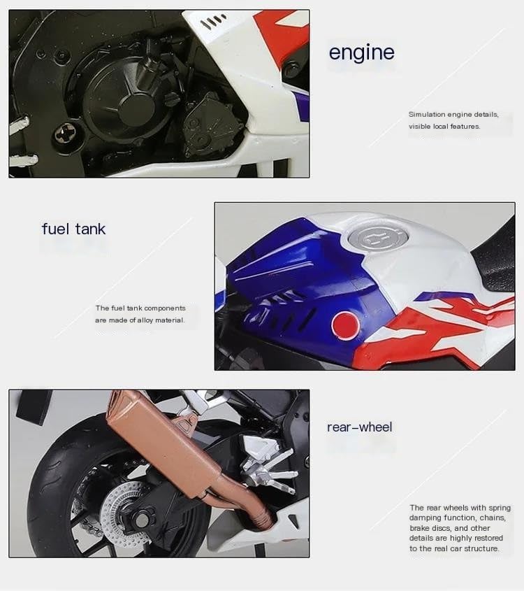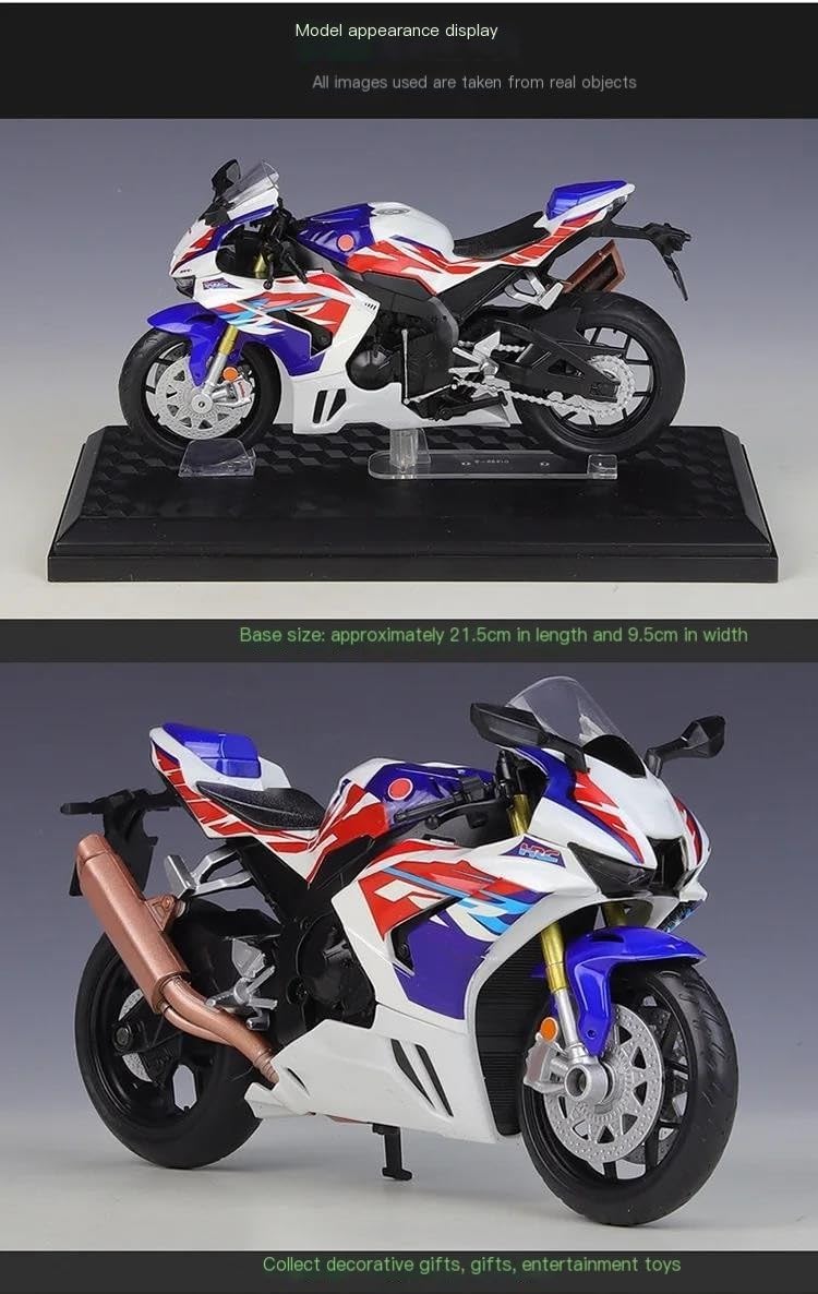 Modellini di moto giocattolo in scala 1:12, parti squisite progettate secondo le proporzioni originali dell'auto, cruscotto, pedali del freno e dell'acceleratore sono progettati per essere realistici e precisi. la modalità di simulazione della motocicletta è piena di personalità, così bella. Ottima per la collezione e l'arredamento dell'ufficio domestico. Modello di motocicletta per Cbr1000rr R Fireblade Sp Cbr1000 rr Realizzato in resistente lega di zinco, è resistente alle cadute e all'usura, garantendo la durevolezza del modello e la sua lunga conservazione. La finitura della vernice è uniformemente liscia, con colori vivaci e duraturi che resistono allo sbiadimento e alle scheggiature, garantendo un aspetto costantemente brillante.