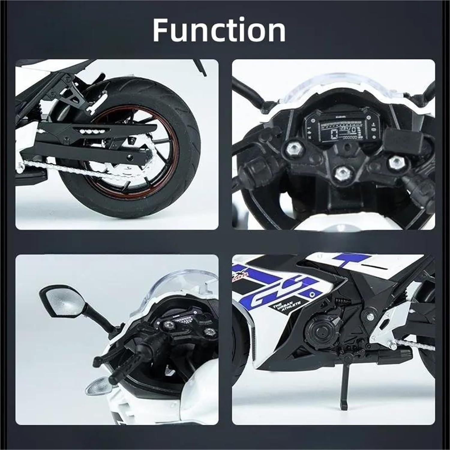 Modello di motocicletta per GSX-250R GSX250R Modello di motocicletta giocattolo in scala 1:12, parti squisite progettate secondo le proporzioni originali dell'auto, cruscotto, pedali del freno e dell'acceleratore sono progettati per essere realistici e precisi. Il modello di motocicletta è un modello squisito realizzato in stretta conformità con la forma, la struttura, il colore, gli interni e altre proporzioni del veicolo originale. È un modello in miniatura del veicolo originale ed è progettato per riprodurre l'aspetto del veicolo originale. Modello di auto di simulazione La finitura liscia e senza sbavature e la vernice lucida e uniforme dimostrano una maestria artigianale eccezionale. Questo modello incarna lo stile di una motocicletta, soddisfacendo l'amore degli appassionati per i modelli nostalgici.