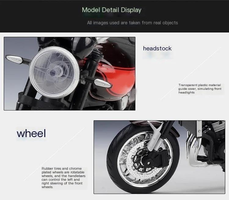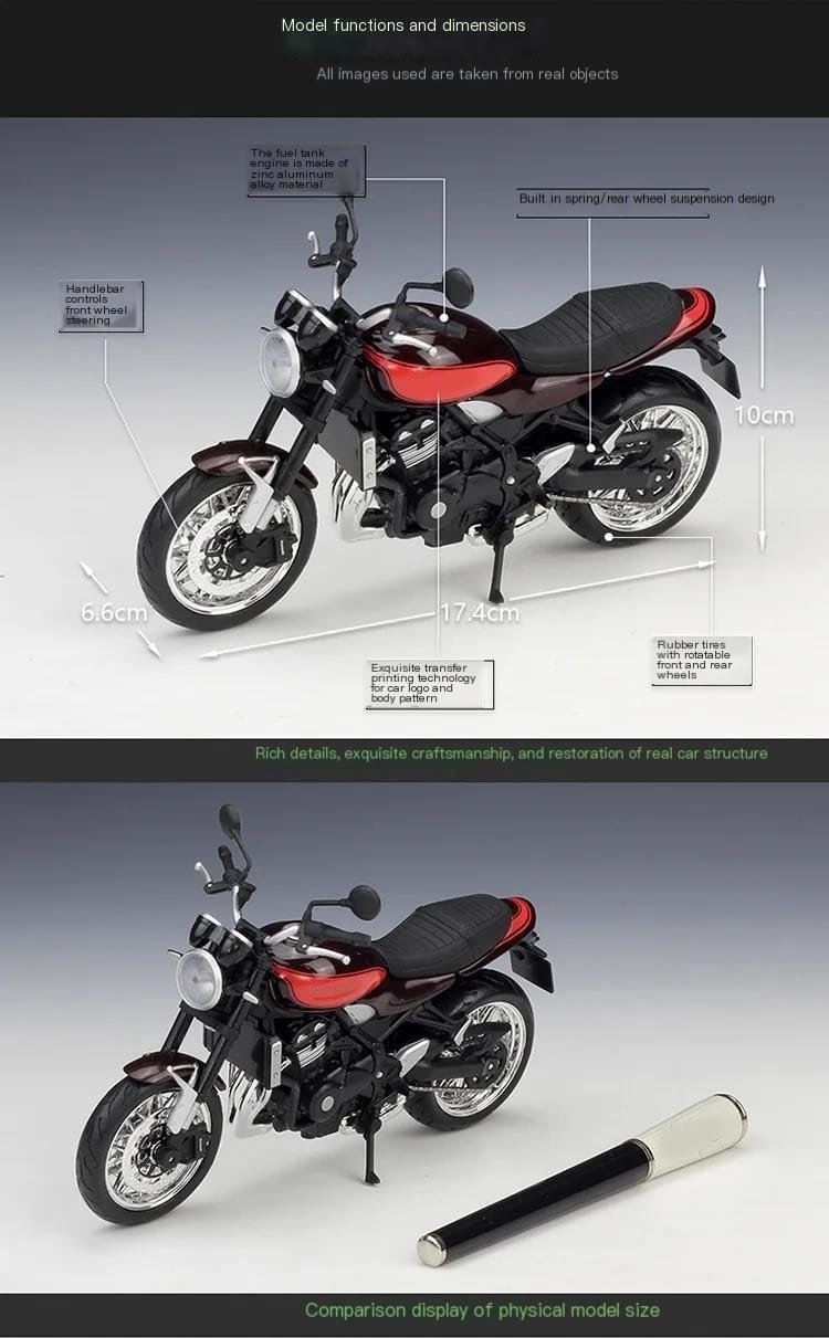 Modellini di moto giocattolo in scala 1:12, parti squisite progettate secondo le proporzioni originali dell'auto, il cruscotto, i pedali del freno e dell'acceleratore sono progettati per essere realistici e precisi. la modalità di simulazione della motocicletta è piena di personalità, così bella. Nuova originalità, bella fattura. Il modello di motocicletta è un decoro sul desktop per ufficio/casa. Modello di motocicletta per Z900rs Z 900 rs Realizzato in resistente lega di zinco, è resistente alle cadute e all'usura, garantendo la durevolezza del modello e la sua lunga conservazione. La finitura della vernice è uniformemente liscia, con colori vivaci e duraturi che resistono allo sbiadimento e alle scheggiature, garantendo un aspetto costantemente brillante.
