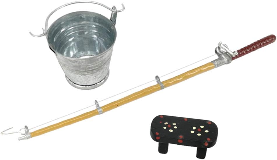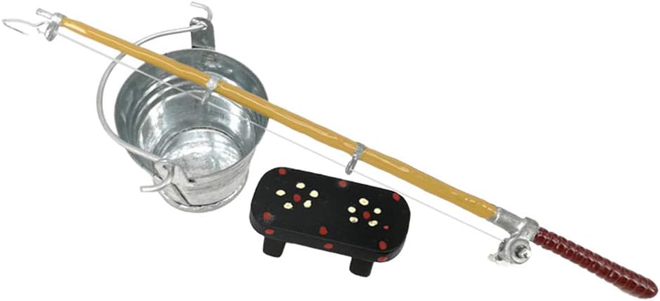 Scala: 1:12 Decorazione in miniatura per casa delle bambole. Lo stile moderno e la lavorazione eccellente lo rendono attraente. Per la decorazione della casa delle bambole del modello di paesaggio del giardino. Questo set di secchio in ferro in miniatura + canna da pesca + panca è una buona aggiunta per i kit per la casa delle bambole. Bel accessorio per il giocattolo della casa delle bambole, che lo renderà più moderno e reale.