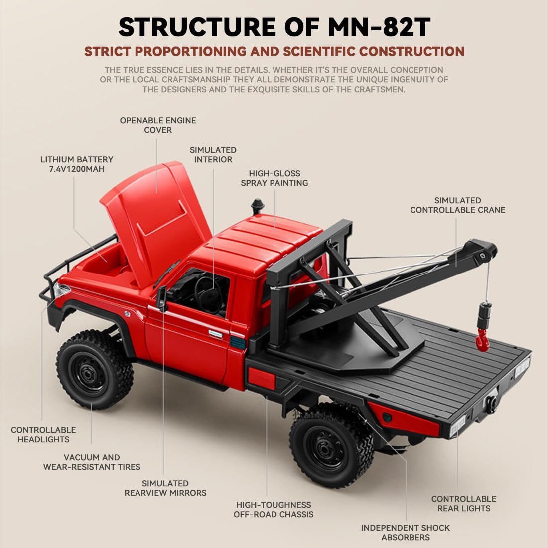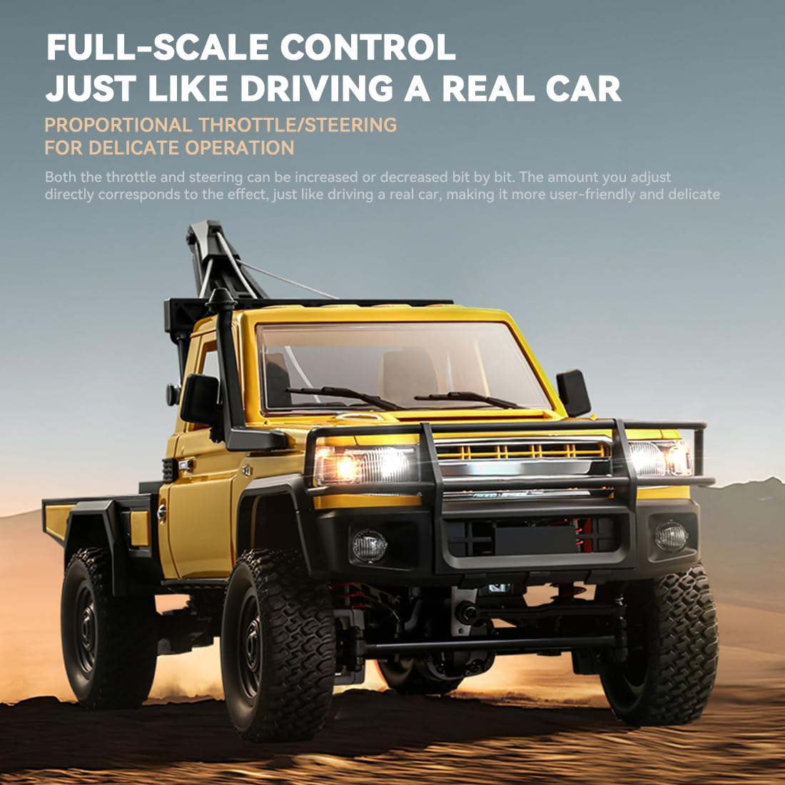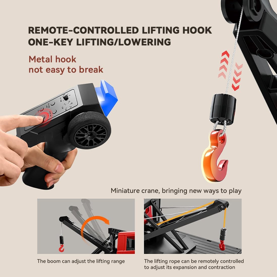 Controllo preciso con telecomando a due stadi completamente proporzionale: perfetto per crawler RC e camion giocattoli: facile regolazione della velocità di guida con controllo preciso e reattivo – ideale per terreni impegnativi o manovre precise. Sistema di illuminazione realistico: vivi la vera atmosfera del veicolo con fari anteriori, indicatori di direzione e luci di retromarcia, un punto forte per qualsiasi modello di gru giocattolo o giocattolo. Sistema di sollevamento funzionale: la gru giocattolo perfetta con corda sollevabile, braccio estensibile e gancio controllabile, per lavori di sollevamento e trasporto realistici come per i modelli di grandi dimensioni. Robusta costruzione all-terra: sia come giocattolo RC Crawler o camion pesante: la costruzione antiurto e gli pneumatici antiscivolo rendono ogni terreno un'avventura. Design orientato alla sicurezza: grazie all'illuminazione sincronizzata, alla costruzione a prova di caduta e ai bordi arrotondati, giocare con questa gru giocattolo o RC Crawler è sicuro e spensierato.
