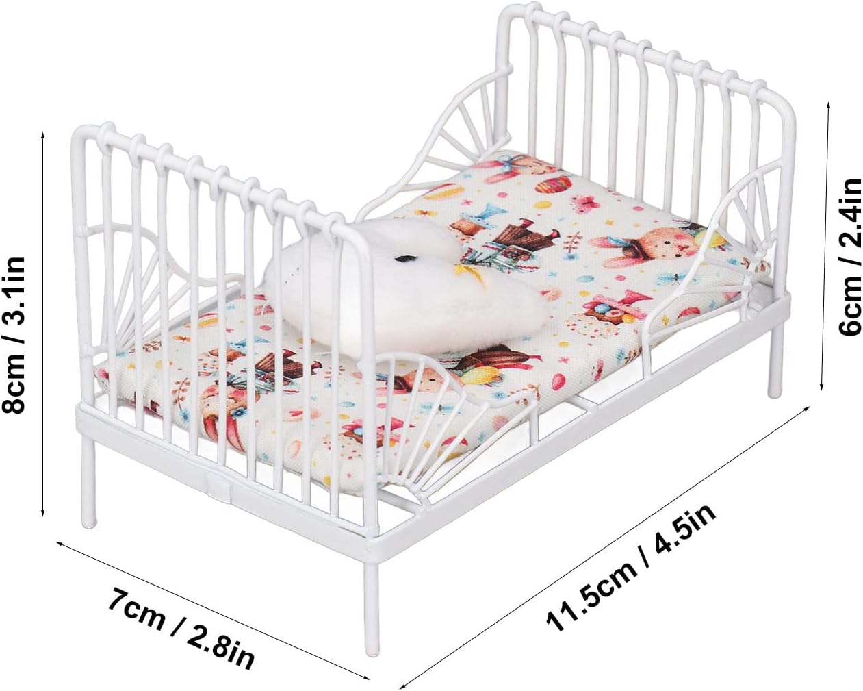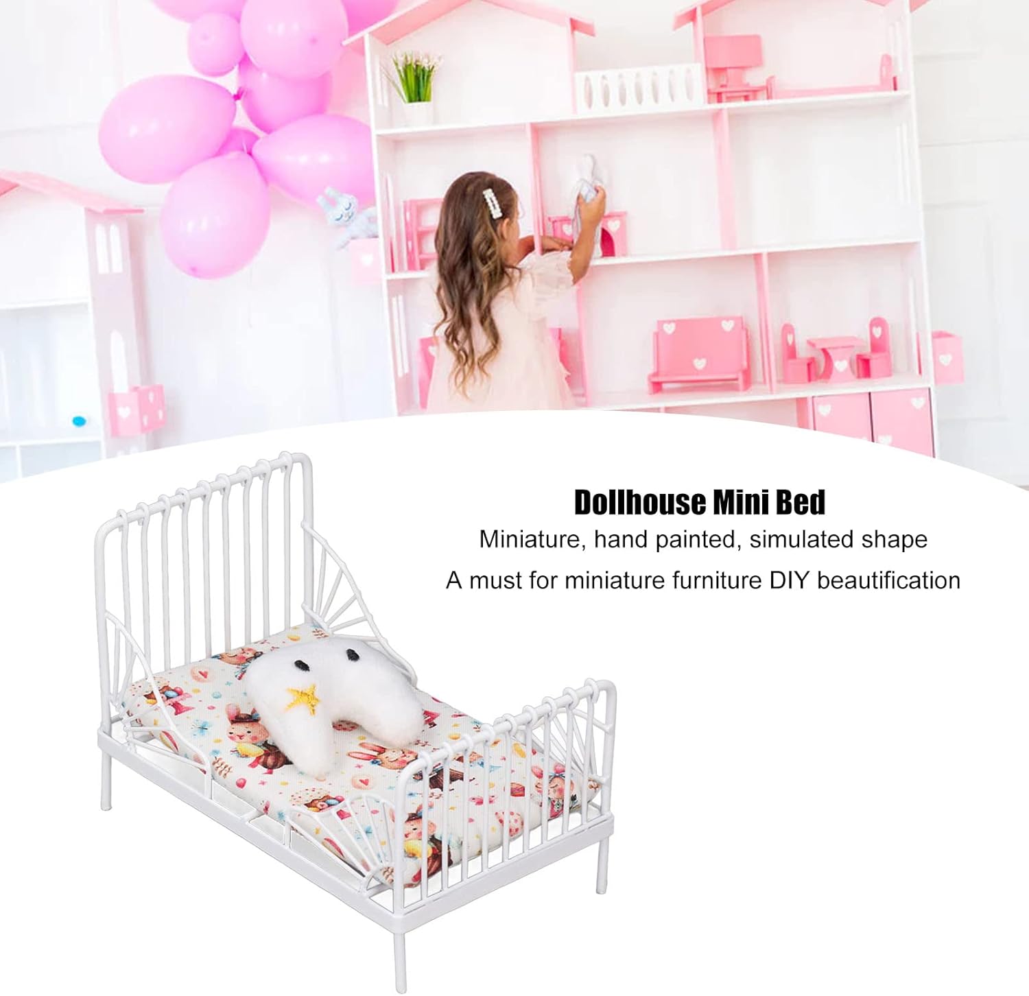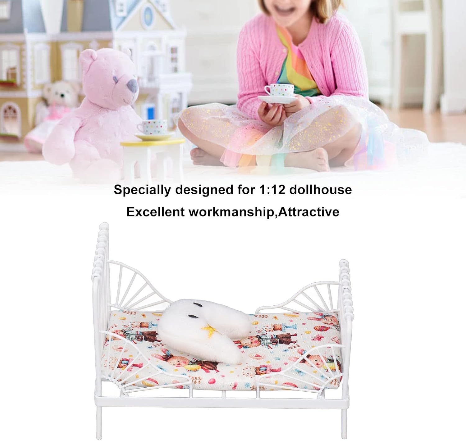 Adatto al gioco di ruolo: questo set da letto per bambole 1:12 in scala migliora il gioco immaginativo, rendendo bello sia gli scenari di gioco di ruolo che per il gioco di ruolo. Frame di metallo premium: realizzato in metallo robusto, questo telaio del letto garantisce la longevità e la sicurezza, la libertà da sostanze chimiche dannose, fornendo tranquillità a genitori e bambini. Attenzione ai dettagli: progettato meticolosamente su una scala 1:12, questo letto in miniatura mette in mostra un'eccezionale artigianato, rendendolo una squisita aggiunta a qualsiasi arredamento delle bambole. Esteticamente gradevole: con il suo design affascinante e le caratteristiche attraenti, questo mini mobile per camere da letto funge da elemento decorativo essenziale per il salotto delle bambole. Carino e accogliente: i deliziosi motivi sui fogli e sul materasso aggiungono un tocco di calore e stile, adattandosi perfettamente a vari temi della casa delle bambole e migliorando l'estetica generale.