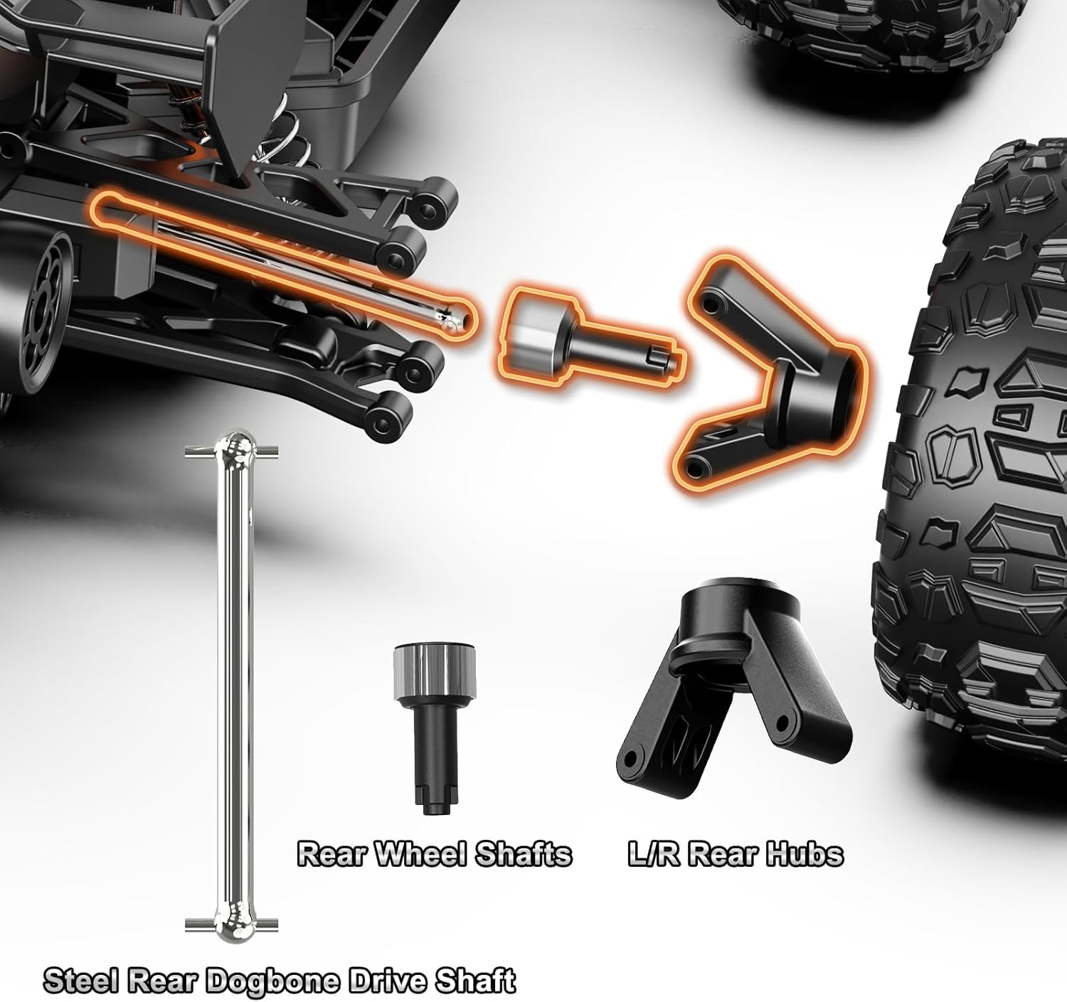 Numero Componenti: Y14301-2-QHUS Elenco degli accessori: 1 CVD anteriore, 1 albero di trazione posteriore, 1 braccio di sospensione sinistro e destro, 1 collegamento sterzo L/R, 1 supporto mozzo anteriore L/R e mozzi sterzo, 1 maglie superiori anteriori e posteriori (2 pezzi), perni di sospensione 2,5 x 47 mm x 2