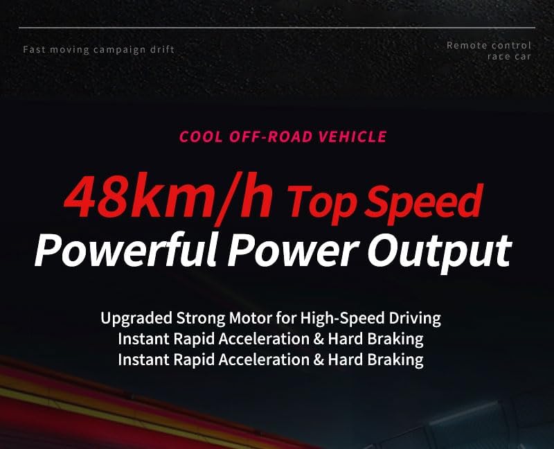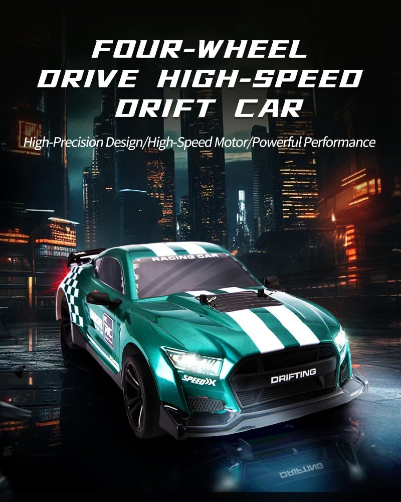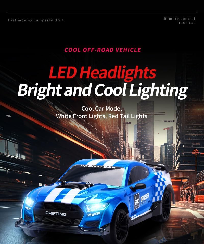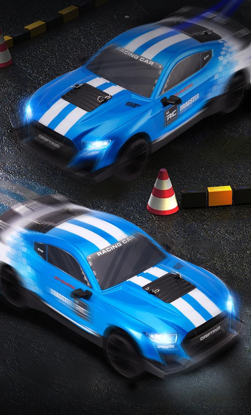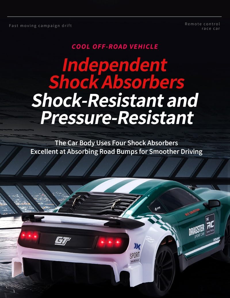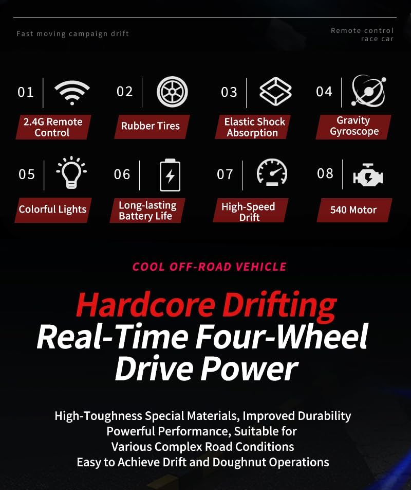 Il veicolo è pronto per l'uso subito dopo aver disimballato. Gli utenti non devono assemblare o regolare nulla; basta caricarlo e iniziare a giocare immediatamente. Questa auto telecomandata è dotata di un potente motore RS540 e può raggiungere velocità di 48 km/h. Questo lo rende perfetto per gli appassionati di corse e hobbisti. Il sistema di controllo remoto da 2,4 GHz garantisce un funzionamento stabile e senza interferenze, in modo che più auto possano guidare contemporaneamente senza interruzioni del segnale. Dotata di due set di ruote, tra cui ruote lisce e ruote da corsa in gomma antiscivolo, questa auto da deriva RC può adattarsi a diversi terreni e stili di corsa. Con i suoi fari a LED e fanali posteriori, questa auto da deriva RC non solo offre un'eccellente visibilità durante le corse notturne, ma aggiunge anche un tocco elegante alle tue avventure ad alta velocità. Il suo design a basso baricentro del telaio migliora la stabilità in curve taglienti e manovre ad alta velocità, rendendolo ideale per la deriva, la corsa e il divertimento fuoristrada.