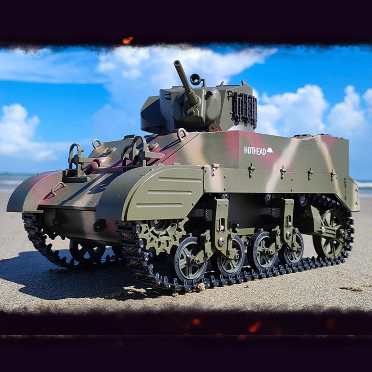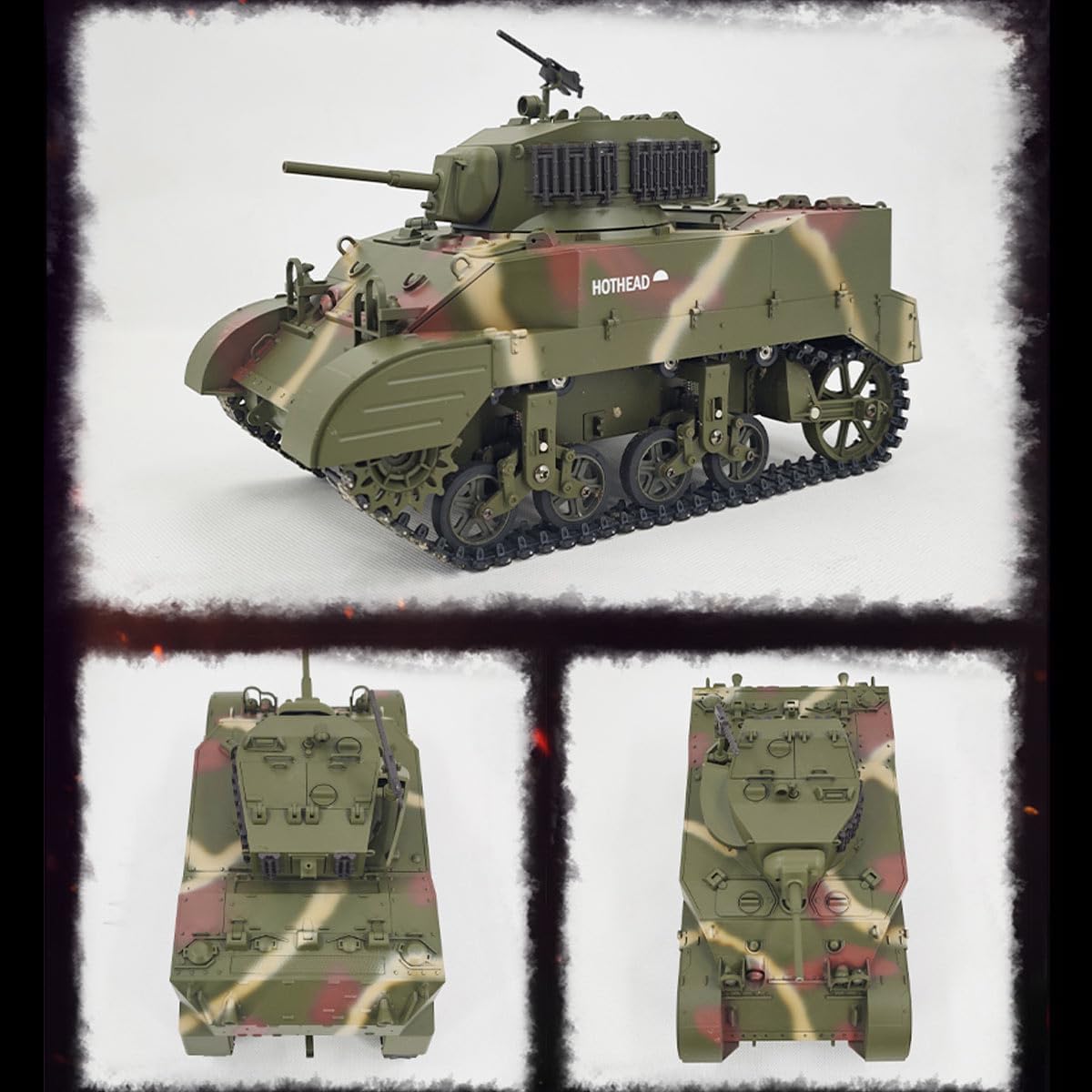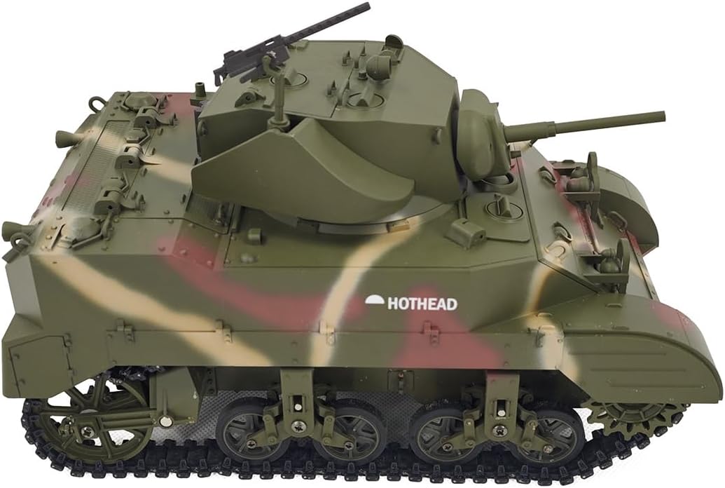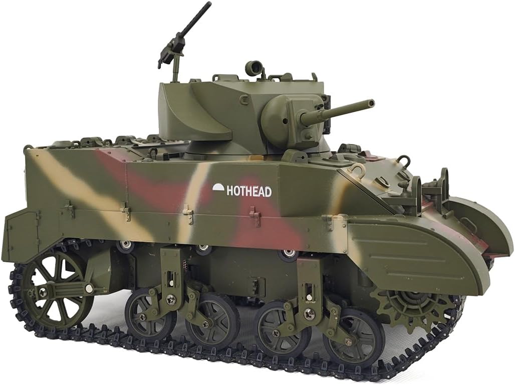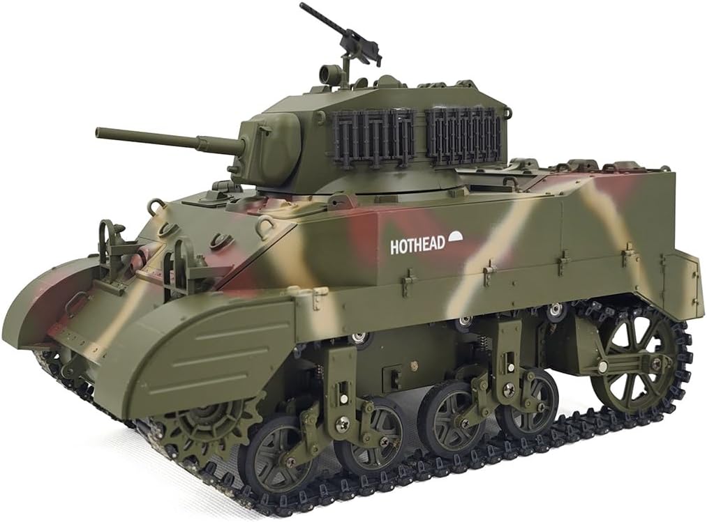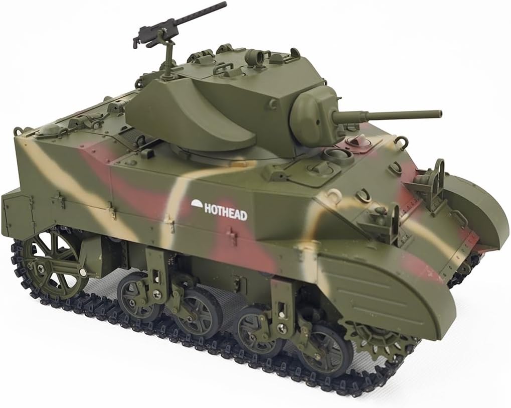 Design da collezione di alta qualità: costruito con una combinazione di plastica e metallo di alta qualità, questo modello di carro armato militare è altamente giocabile. Porte completamente funzionali aggiungono ulteriore realismo per collezionisti e hobbisti. Sistema di controllo remoto .2.4G: prova il controllo proporzionale con modalità a doppia velocità (velocità realistica a piena velocità), rotazione della torretta a 360° e funzioni di movimento precise, tra cui avanti, retromarcia, accelerazione e rotazione sul posto. Fumo realistico, effetti sonori leggeri: dotato di un sistema di scarico telescopico, azione di rinculo del cannone sincronizzata ed effetti sonori dinamici, portando una vera immersione in combattimento agli appassionati di RC. .Carro armato RC ad alte prestazioni: questo carro armato leggero Stuart M5A1 in scala 1/16 è un modello realistico con simulazione di movimento avanzata, una torretta rotante a 350° e un'elevazione della canna a 30° per un'esperienza realistica sul campo di battaglia. Protezione doppia batteria: offre protezione da sovraccarico, sicurezza ad alta temperatura e protezione da sovraccarico a bassa tensione, garantendo una lunga durata e sicura per sessioni di gioco prolungate.