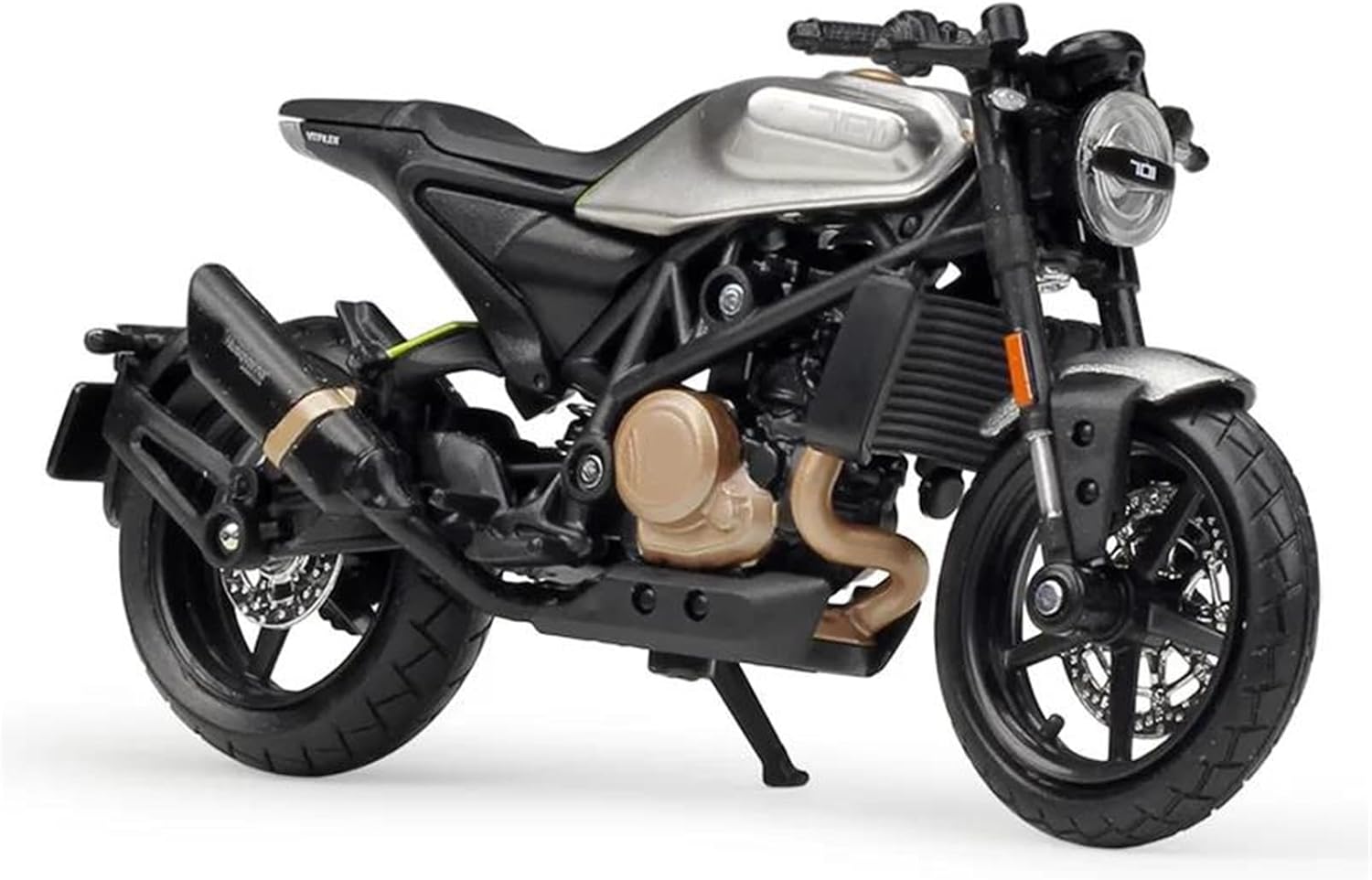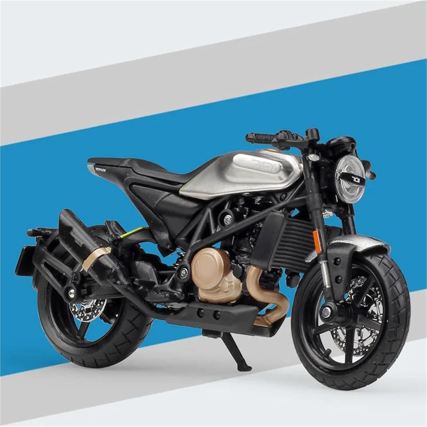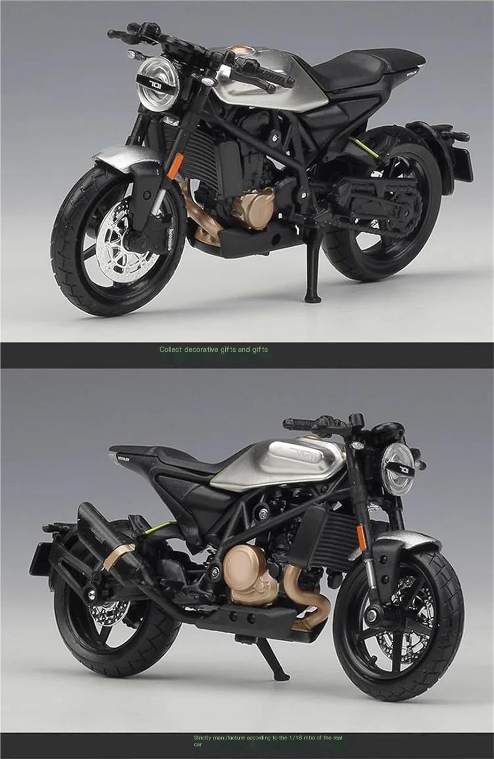 Modello di motocicletta per Vitpilen 701 2018 Il modello di motocicletta è un modello squisito realizzato in stretta conformità con la forma, la struttura, il colore, gli interni e altre proporzioni del veicolo originale. È un modello in miniatura del veicolo originale ed è progettato per riprodurre l'aspetto del veicolo originale. Modello di motocicletta di simulazione 1:18 Modellini di auto giocattolo per motociclette, le ruote anteriori e il manubrio possono oscillare da un lato all'altro. Portapacchi per attività, Sospensione posteriore a molla, Ruota libera Realizzato in resistente lega di zinco, è resistente alle cadute e all'usura, garantendo la durevolezza del modello e la sua lunga conservazione. La finitura della vernice è uniformemente liscia, con colori vivaci e duraturi che resistono allo sbiadimento e alle scheggiature, garantendo un aspetto costantemente brillante.