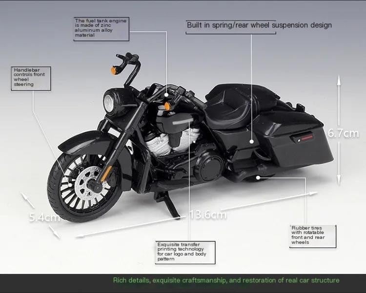 Modello di moto in scala 1:18, parti squisite progettate secondo le proporzioni originali dell'auto, il cruscotto, i pedali del freno e dell'acceleratore sono progettati per essere realistici e precisi. La modalità moto di simulazione è piena di personalità, davvero fantastica. Ideale per la collezione e la decorazione dell'home office. Modello di motocicletta per H&arley Road King Special 2017 Aumenta il realismo e il riconoscimento del modello. Il colore è vivido e rimane tale anche dopo una lunga esposizione.