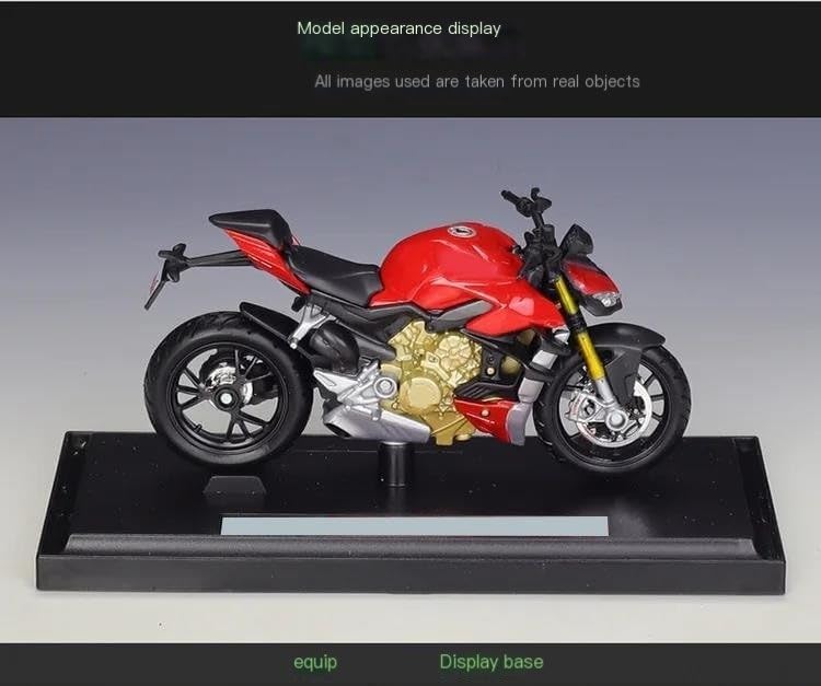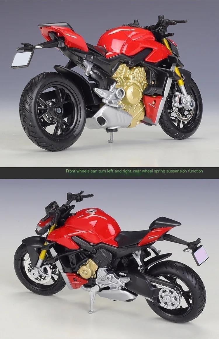 Modellini di moto giocattolo in scala 1:18, parti squisite progettate secondo le proporzioni originali dell'auto, cruscotto, pedali del freno e dell'acceleratore sono progettati per essere realistici e precisi. la modalità di simulazione della motocicletta è piena di personalità, così bella. Le ruote anteriori e il manubrio possono oscillare da un lato all'altro. Portaoggetti, Sospensione posteriore a molla, Ruota libera Modello di motocicletta per Super Naked V4 S La finitura liscia e senza sbavature e la vernice lucida e uniforme dimostrano una maestria artigianale eccezionale. Questo modello incarna lo stile di una motocicletta, soddisfacendo l'amore degli appassionati per i modelli nostalgici.