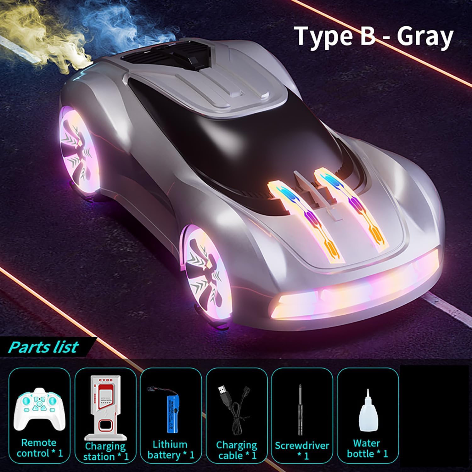 Illuminazione fredda, abbinata a effetti sonori dinamici. Guida multidirezionale: capace di derive ad alta velocità e scivolamenti di coda taglienti. Il sistema di spruzzatura simula effetti di fumo di scarico reali per un'esperienza di guida coinvolgente. Design innovativo simulato della stazione di ricarica, con porta di ricarica di tipo C.