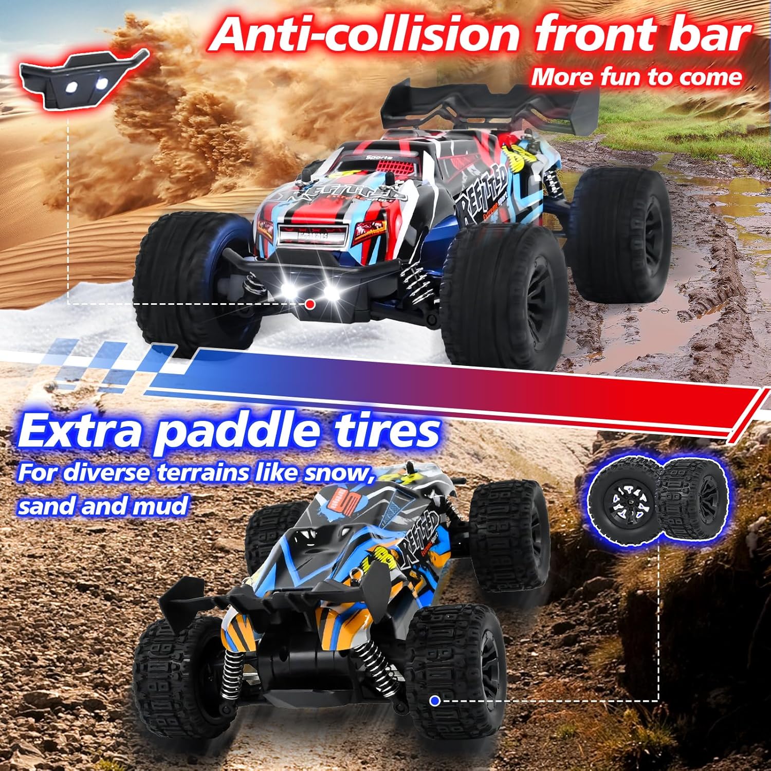 🏎️🏎️【1:20 Monster RC Truck】Aperto il pacchetto, riceverete 1 x 1:20 monster rc buggy, 1 x corpo intercambiabile, 1 x telecomando, 2 x batterie ricaricabili e 1 x manuale di istruzioni. Il monster truck ha un aspetto gradevole e una struttura robusta, che sicuramente fornirà una bella esperienza introduttiva ai principianti dell'rc. 🎮🎮【Doppia Forma con Design Leggero】Viene fornito con due scocche intercambiabili (modello monster corazzato/modello racing), ognuna con bellissimi motivi graffiti. Con luci a led, vola di notte come una bestia fuori dalla gabbia, permettendo al bambino di godere di un doppio stile e di un doppio divertimento! 🏎️🏎️【Veicolo RC Fuoristrada per Tutti i Terreni】Nuovo camion veloce in scala 1:20, trazione posteriore con motore ad alta coppia, facile da scalare. I pneumatici di alta qualità, il guscio impermeabile e il design del sistema antivibrazioni consentono al monster truck rc di guidare liberamente su sabbia/ghiaia/ghiaia e altre superfici stradali complesse. 🔋🔋【Doppia Durata della Batteria】Viene fornito con 2 batterie ricaricabili di serie, con un'autonomia di circa 25-30 minuti. Questa auto rc è dotata di un sistema radio a 2,4 GHz, che consente di guidare più auto rc contemporaneamente senza interferire l'una con l'altra. Adatto a principianti o a piloti esperti, genitori e bambini possono divertirsi in una gara di inseguimento. 🎁🎁【Regalo Perfetto per Bambini di 3-8 Anni】Questo rc buggy è anti-caduta e resistente all'usura, il telecomando è progettato ergonomicamente e può essere facilmente afferrato dalle piccole mani del bambino, adatto sia per i ragazzi che per le ragazze, è il miglior regalo di festa/compleanno/natale per sviluppare l'intelligenza e l'abilità sportiva dei bambini.