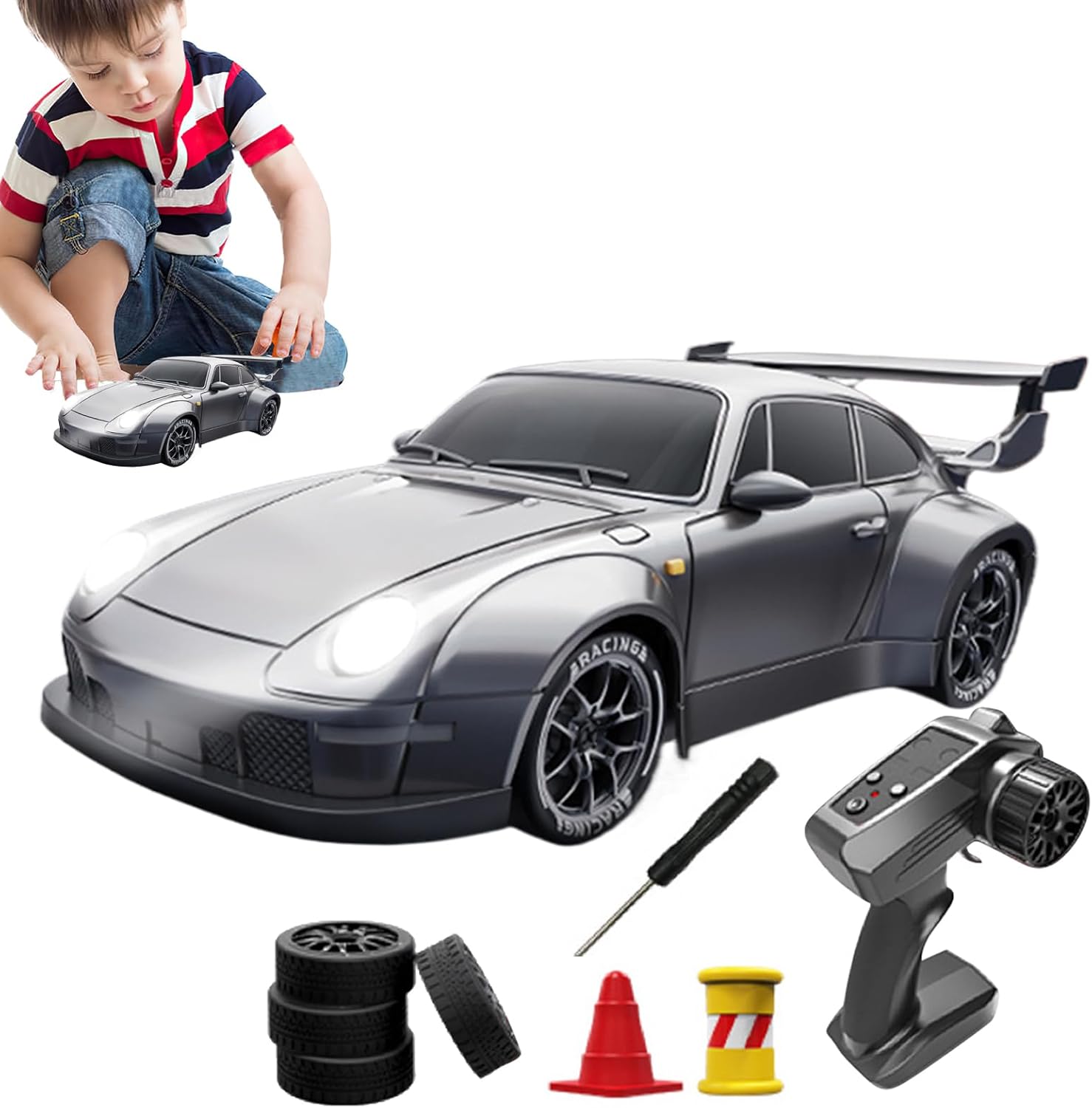 Aggiornamento estetico rivoluzionario: la nostra auto Drift RC ha un design retro-moderno ed è fornita con una finitura in argento in metallo liquido che combina l'estetica nostalgica con prestazioni di deriva avanzata. Sperimentare precisione e stile incomparabili con ogni diapositiva Grande prestazioni: passare da 4 deriva per scorrimento senza soluzione di continuità o 4 pneumatici dritti per gare ad alta velocità e vanno facilmente d'accordo in ogni area. La nostra auto Drift RC offre l'esperienza di guida ideale in modo da poter padroneggiare ogni e superare qualsiasi percorso ad ostacoli con prestazioni e controllo insuperabili di gara infinito: l'auto della deriva RC viene fornita con un alimentatore ricaricabile che garantisce intrattenimento ininterrotto. Il telecomando viene azionato con 2 batterie AA e quindi garantisce lunghe ore. Inoltre, con la batteria al litio ricaricabile fornita e il cavo carcade, non si escono mai l'elettricità Migliora le tue abilità di deriva RC: migliora le tue abilità di deriva o misurati con gli amici con questa fantastica auto da drift RC. Progetta corsi di deriva individuale unici che sfidano e migliorano i corsi di deriva individuale unici con i piccoli coni leader forniti come regalo: sorprendi i tuoi con questa auto alla deriva controllata a distanza, perfetta per familiari, colleghi e amici. Un buon regalo per esprimere il tuo apprezzamento e il per uso personale