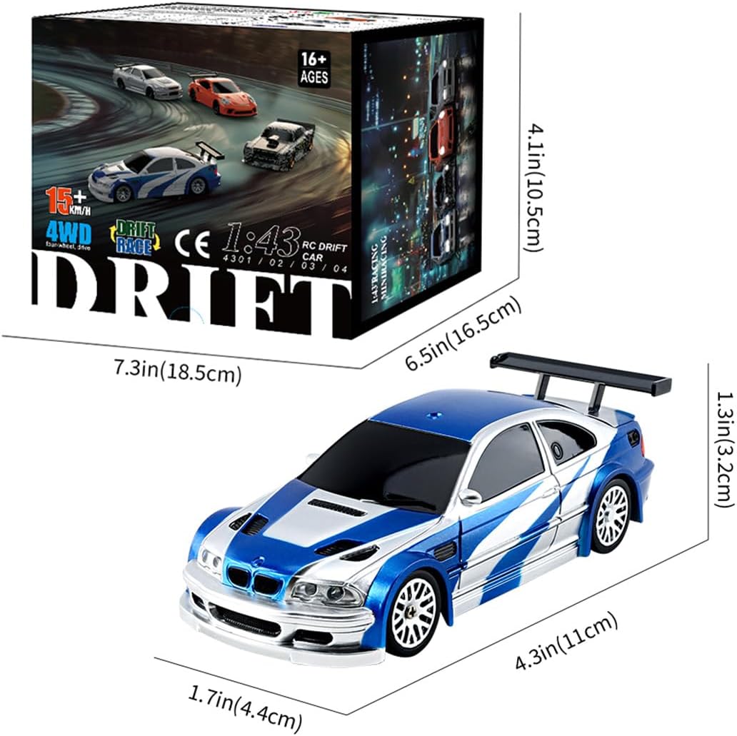 Drift auto in scala 1:43: le dimensioni del veicolo sono di 11 x 4,5 x 3 cm. Il design altamente simulato con finitura metallica conferisce un look autentico al modello ed è perfetto per esposizione, drifting o collezione. 【 4WD Drift- & Racing 】 L'esclusivo telaio con bassa resistenza e trazione integrale permanente consente movimenti agili e derive controllate su superfici lisce. Sistema di controllo completamente proporzionale: il preciso sistema a 2,4 GHz consente lo sterzo e il gas in modo completo per avanti, indietro, curve a sinistra/destra e freni, per una maneggevolezza delicata e reattiva. Illuminazione a LED integrata: i fari a LED realistici migliorano l'aspetto di notte e la visibilità durante l'uso. Goditi fino a 30 minuti di autonomia dopo solo 1 ora di ricarica. Pacchetto regalo pronto all'uso: viene fornito completamente assemblato, con batteria e caricabatterie, una scelta ideale per hobbisti o come regalo unico per adulti e collezionisti.