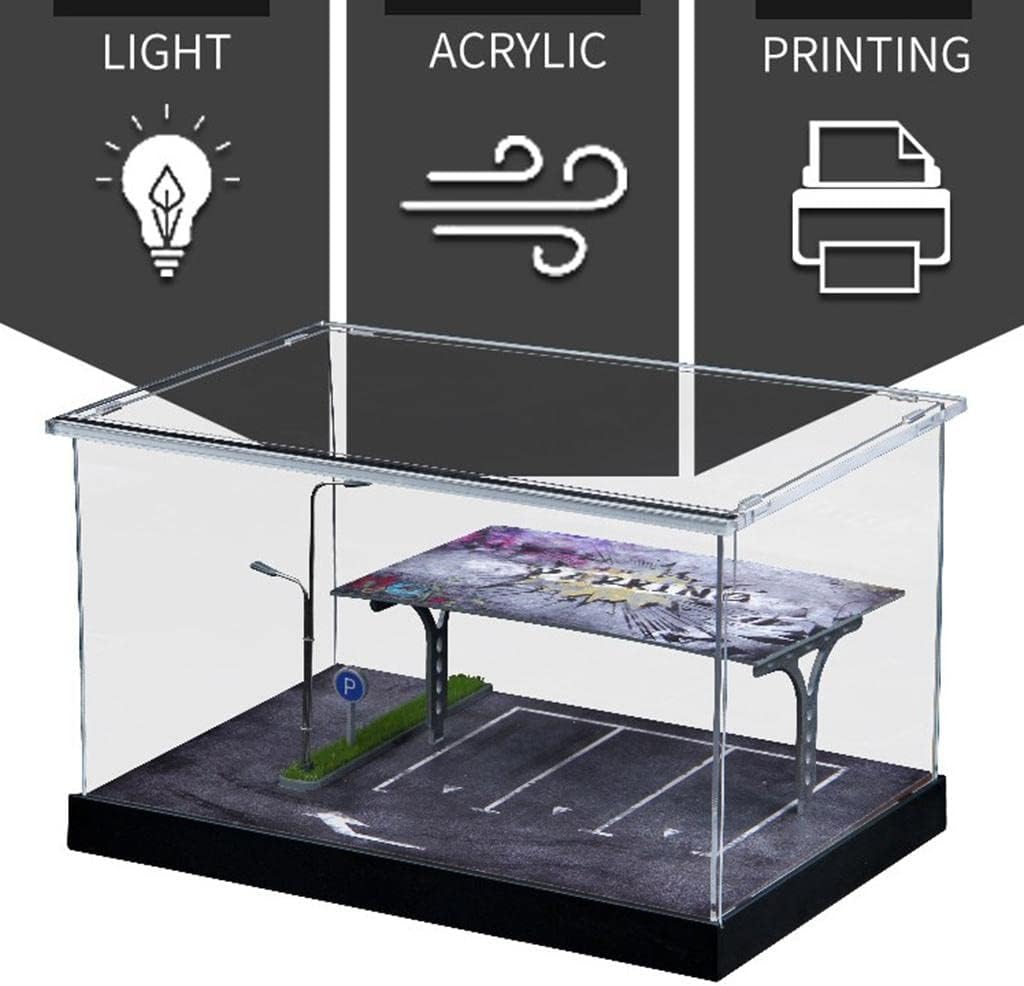 La vetrina trasparente è realizzata in acrilico altamente trasparente, rendendo il tuo modello di auto più intuitivo e Un regalo a sorpresa per collezionisti e appassionati di modellini di auto. 1:64 scala simulazione parcheggio modello scena con alberi. Adatto per modelli di auto, vetrine, ornamenti decorativi. Le luci a LED integrate possono illuminare l'intera scena e aumentare l'atmosfera della scena.
