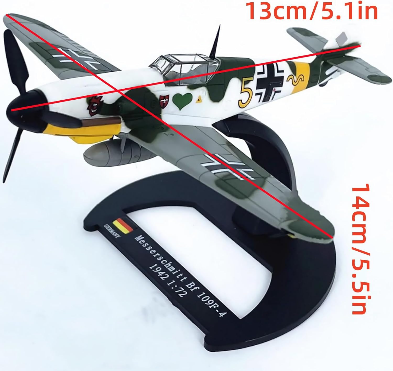 1. Modello di aereo: WWII Germania Messerschmitt Bf-109F-4 Fighter 2. Aereo da raccolta: WWII Germania Messerschmitt Bf-109F-4 Modello da caccia 1:72 Scala Modello Lunghezza 13 cm 3. Aerei Prototipi: Il Modello Di Aereo È Rigorosamente Restaurato Secondo Le Proporzioni E I Dettagli Dell'Aereo Originale. Modello in lega pressofusa di alta qualità. 4. Modello decorativo: il modello aereo è molto adatto per decorare la scrivania, la vetrina e la mensola. 5. Regalo perfetto: la grande scelta regalo per compleanno, Natale, festa del papà per il tuo amante, appassionato di collezione di aerei.
